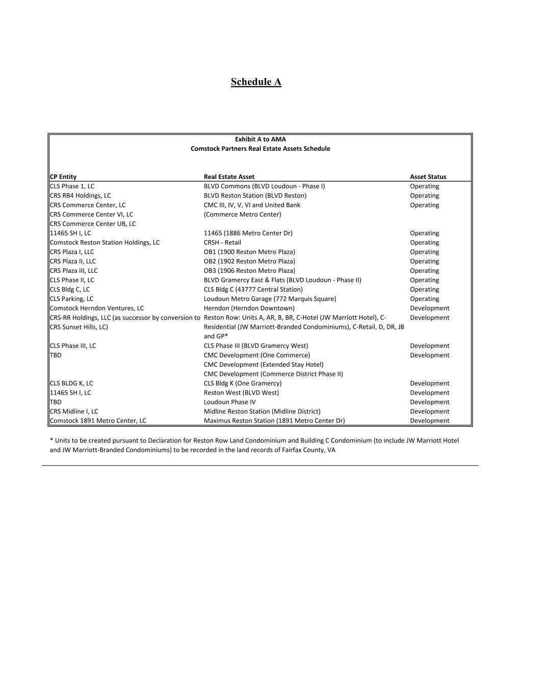 Schedule A CP Entity Real Estate Asset Asset Status CLS Phase 1, LC BLVD Commons (BLVD Loudoun - Phase I) Operating CRS RB4 Holdings, LC BLVD Reston Station (BLVD Reston) Operating CRS Commerce Center, LC CRS Commerce Center VI, LC CRS Commerce Center UB, LC CMC III, IV, V, VI and United Bank (Commerce Metro Center) Operating 11465 SH I, LC 11465 (1886 Metro Center Dr) Operating Comstock Reston Station Holdings, LC CRSH - Retail Operating CRS Plaza I, LLC OB1 (1900 Reston Metro Plaza) Operating CRS Plaza II, LLC OB2 (1902 Reston Metro Plaza) Operating CRS Plaza III, LLC OB3 (1906 Reston Metro Plaza) Operating CLS Phase II, LC BLVD Gramercy East & Flats (BLVD Loudoun - Phase II) Operating CLS Bldg C, LC CLS Bldg C (43777 Central Station) Operating CLS Parking, LC Loudoun Metro Garage (772 Marquis Square) Operating Comstock Herndon Ventures, LC Herndon (Herndon Downtown) Development CRS-RR Holdings, LLC (as successor by conversion to CRS Sunset Hills, LC) Reston Row: Units A, AR, B, BR, C-Hotel (JW Marriott Hotel), C- Residential (JW Marriott-Branded Condominiums), C-Retail, D, DR, JB and GP* Development CLS Phase III, LC CLS Phase III (BLVD Gramercy West) Development TBD CMC Development (One Commerce) CMC Development (Extended Stay Hotel) CMC Development (Commerce District Phase II) Development CLS BLDG K, LC CLS Bldg K (One Gramercy) Development 11465 SH I, LC Reston West (BLVD West) Development TBD Loudoun Phase IV Development CRS Midline I, LC Midline Reston Station (Midline District) Development Comstock 1891 Metro Center, LC Maximus Reston Station (1891 Metro Center Dr) Development * Units to be created pursuant to Declaration for Reston Row Land Condominium and Building C Condominium (to include JW Marriott Hotel and JW Marriott-Branded Condominiums) to be recorded in the land records of Fairfax County, VA Exhibit A to AMA Comstock Partners Real Estate Assets Schedule
