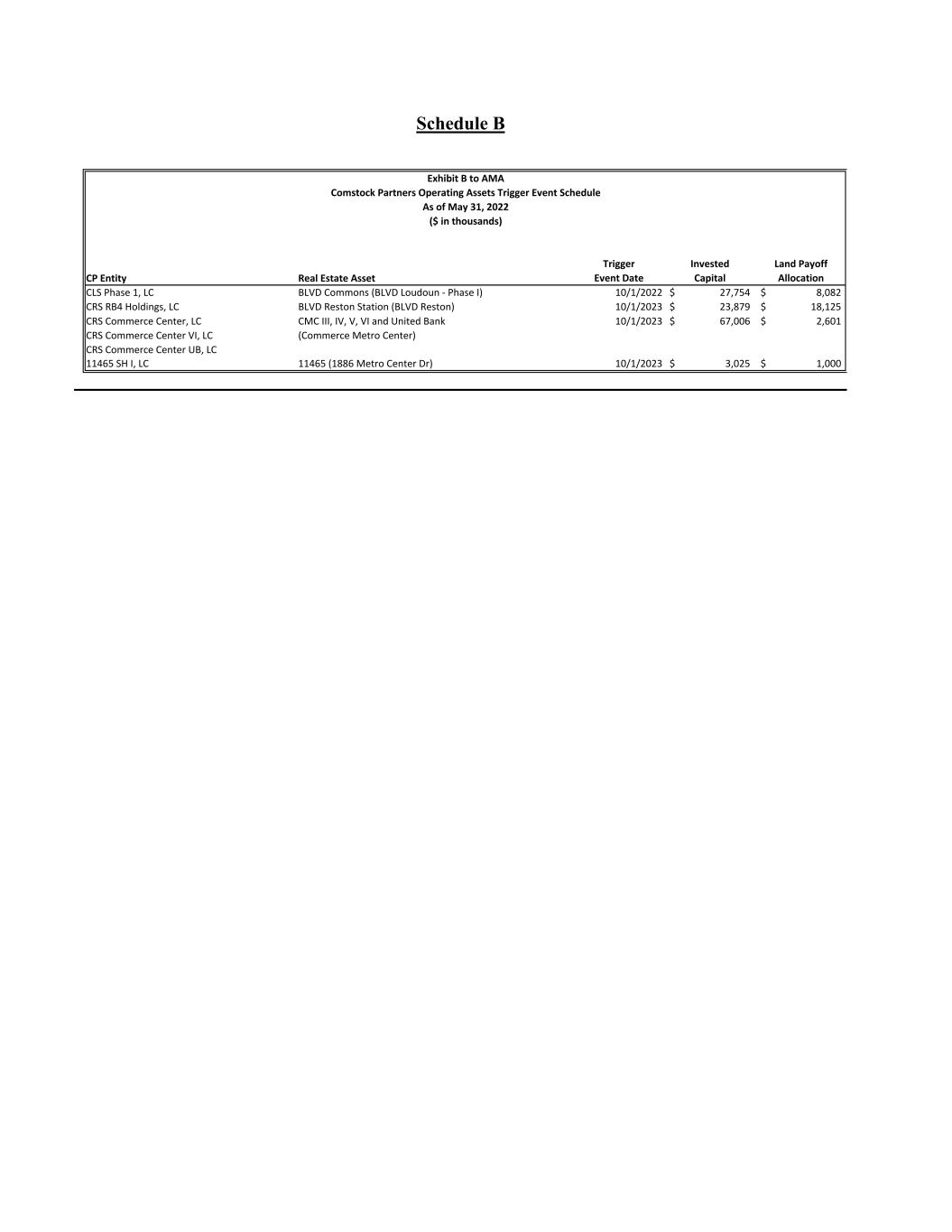 Schedule B CP Entity Real Estate Asset Trigger Event Date Invested Capital Land Payoff Allocation CLS Phase 1, LC BLVD Commons (BLVD Loudoun - Phase I) 10/1/2022 27,754$ 8,082$ CRS RB4 Holdings, LC BLVD Reston Station (BLVD Reston) 10/1/2023 23,879$ 18,125$ CRS Commerce Center, LC CRS Commerce Center VI, LC CRS Commerce Center UB, LC CMC III, IV, V, VI and United Bank (Commerce Metro Center) 10/1/2023 67,006$ 2,601$ 11465 SH I, LC 11465 (1886 Metro Center Dr) 10/1/2023 3,025$ 1,000$ Exhibit B to AMA Comstock Partners Operating Assets Trigger Event Schedule As of May 31, 2022 ($ in thousands)
