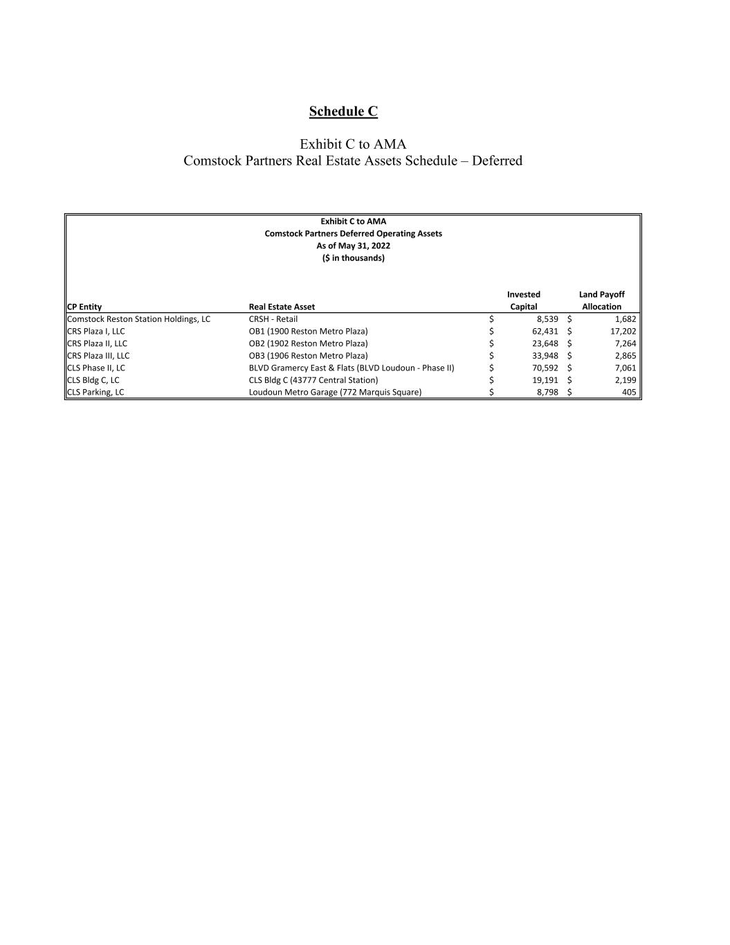 Schedule C Exhibit C to AMA Comstock Partners Real Estate Assets Schedule – Deferred CP Entity Real Estate Asset Invested Capital Land Payoff Allocation Comstock Reston Station Holdings, LC CRSH - Retail 8,539$ 1,682$ CRS Plaza I, LLC OB1 (1900 Reston Metro Plaza) 62,431$ 17,202$ CRS Plaza II, LLC OB2 (1902 Reston Metro Plaza) 23,648$ 7,264$ CRS Plaza III, LLC OB3 (1906 Reston Metro Plaza) 33,948$ 2,865$ CLS Phase II, LC BLVD Gramercy East & Flats (BLVD Loudoun - Phase II) 70,592$ 7,061$ CLS Bldg C, LC CLS Bldg C (43777 Central Station) 19,191$ 2,199$ CLS Parking, LC Loudoun Metro Garage (772 Marquis Square) 8,798$ 405$ Exhibit C to AMA Comstock Partners Deferred Operating Assets As of May 31, 2022 ($ in thousands)