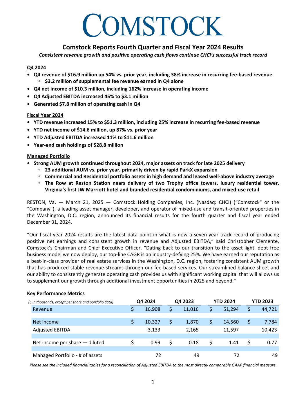 Comstock Reports Fourth Quarter and Fiscal Year 2024 Results Consistent revenue growth and positive operating cash flows continue CHCI’s successful track record Q4 2024 • Q4 revenue of $16.9 million up 54% vs. prior year, including 38% increase in recurring fee-based revenue ◦ $3.2 million of supplemental fee revenue earned in Q4 alone • Q4 net income of $10.3 million, including 162% increase in operating income • Q4 Adjusted EBITDA increased 45% to $3.1 million • Generated $7.8 million of operating cash in Q4 Fiscal Year 2024 • YTD revenue increased 15% to $51.3 million, including 25% increase in recurring fee-based revenue • YTD net income of $14.6 million, up 87% vs. prior year • YTD Adjusted EBITDA increased 11% to $11.6 million • Year-end cash holdings of $28.8 million Managed Portfolio • Strong AUM growth continued throughout 2024, major assets on track for late 2025 delivery ◦ 23 additional AUM vs. prior year, primarily driven by rapid ParkX expansion ◦ Commercial and Residential portfolio assets in high demand and leased well-above industry average ◦ The Row at Reston Station nears delivery of two Trophy office towers, luxury residential tower, Virginia’s first JW Marriott hotel and branded residential condominiums, and mixed-use retail RESTON, Va. — March 21, 2025 — Comstock Holding Companies, Inc. (Nasdaq: CHCI) (“Comstock” or the “Company”), a leading asset manager, developer, and operator of mixed-use and transit-oriented properties in the Washington, D.C. region, announced its financial results for the fourth quarter and fiscal year ended December 31, 2024. “Our fiscal year 2024 results are the latest data point in what is now a seven-year track record of producing positive net earnings and consistent growth in revenue and Adjusted EBITDA,” said Christopher Clemente, Comstock’s Chairman and Chief Executive Officer. “Dating back to our transition to the asset-light, debt free business model we now deploy, our top-line CAGR is an industry-defying 25%. We have earned our reputation as a best-in-class provider of real estate services in the Washington, D.C. region, fostering consistent AUM growth that has produced stable revenue streams through our fee-based services. Our streamlined balance sheet and our ability to consistently generate operating cash provides us with significant working capital that will allows us to supplement our growth through additional investment opportunities in 2025 and beyond.” Key Performance Metrics ($ in thousands, except per share and portfolio data) Q4 2024 Q4 2023 YTD 2024 YTD 2023 Revenue $ 16,908 $ 11,016 $ 51,294 $ 44,721 Net income $ 10,327 $ 1,870 $ 14,560 $ 7,784 Adjusted EBITDA 3,133 2,165 11,597 10,423 Net income per share — diluted $ 0.99 $ 0.18 $ 1.41 $ 0.77 Managed Portfolio - # of assets 72 49 72 49 Please see the included financial tables for a reconciliation of Adjusted EBITDA to the most directly comparable GAAP financial measure. 1