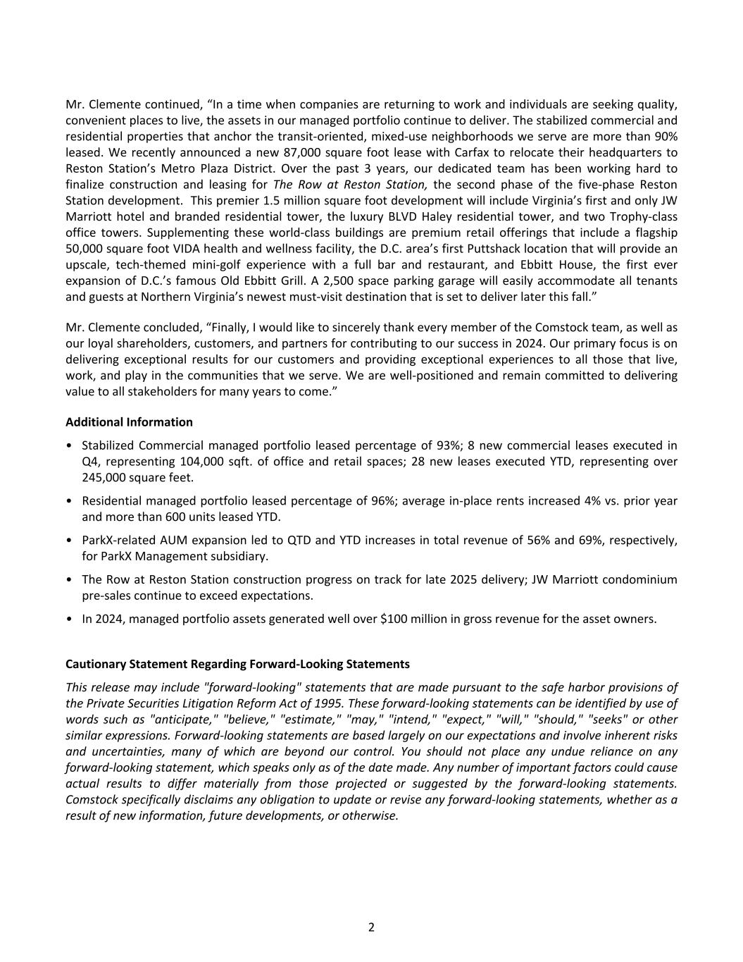 Mr. Clemente continued, “In a time when companies are returning to work and individuals are seeking quality, convenient places to live, the assets in our managed portfolio continue to deliver. The stabilized commercial and residential properties that anchor the transit-oriented, mixed-use neighborhoods we serve are more than 90% leased. We recently announced a new 87,000 square foot lease with Carfax to relocate their headquarters to Reston Station’s Metro Plaza District. Over the past 3 years, our dedicated team has been working hard to finalize construction and leasing for The Row at Reston Station, the second phase of the five-phase Reston Station development. This premier 1.5 million square foot development will include Virginia’s first and only JW Marriott hotel and branded residential tower, the luxury BLVD Haley residential tower, and two Trophy-class office towers. Supplementing these world-class buildings are premium retail offerings that include a flagship 50,000 square foot VIDA health and wellness facility, the D.C. area’s first Puttshack location that will provide an upscale, tech-themed mini-golf experience with a full bar and restaurant, and Ebbitt House, the first ever expansion of D.C.’s famous Old Ebbitt Grill. A 2,500 space parking garage will easily accommodate all tenants and guests at Northern Virginia’s newest must-visit destination that is set to deliver later this fall.” Mr. Clemente concluded, “Finally, I would like to sincerely thank every member of the Comstock team, as well as our loyal shareholders, customers, and partners for contributing to our success in 2024. Our primary focus is on delivering exceptional results for our customers and providing exceptional experiences to all those that live, work, and play in the communities that we serve. We are well-positioned and remain committed to delivering value to all stakeholders for many years to come.” Additional Information • Stabilized Commercial managed portfolio leased percentage of 93%; 8 new commercial leases executed in Q4, representing 104,000 sqft. of office and retail spaces; 28 new leases executed YTD, representing over 245,000 square feet. • Residential managed portfolio leased percentage of 96%; average in-place rents increased 4% vs. prior year and more than 600 units leased YTD. • ParkX-related AUM expansion led to QTD and YTD increases in total revenue of 56% and 69%, respectively, for ParkX Management subsidiary. • The Row at Reston Station construction progress on track for late 2025 delivery; JW Marriott condominium pre-sales continue to exceed expectations. • In 2024, managed portfolio assets generated well over $100 million in gross revenue for the asset owners. Cautionary Statement Regarding Forward-Looking Statements This release may include "forward-looking" statements that are made pursuant to the safe harbor provisions of the Private Securities Litigation Reform Act of 1995. These forward-looking statements can be identified by use of words such as "anticipate," "believe," "estimate," "may," "intend," "expect," "will," "should," "seeks" or other similar expressions. Forward-looking statements are based largely on our expectations and involve inherent risks and uncertainties, many of which are beyond our control. You should not place any undue reliance on any forward-looking statement, which speaks only as of the date made. Any number of important factors could cause actual results to differ materially from those projected or suggested by the forward-looking statements. Comstock specifically disclaims any obligation to update or revise any forward-looking statements, whether as a result of new information, future developments, or otherwise. 2