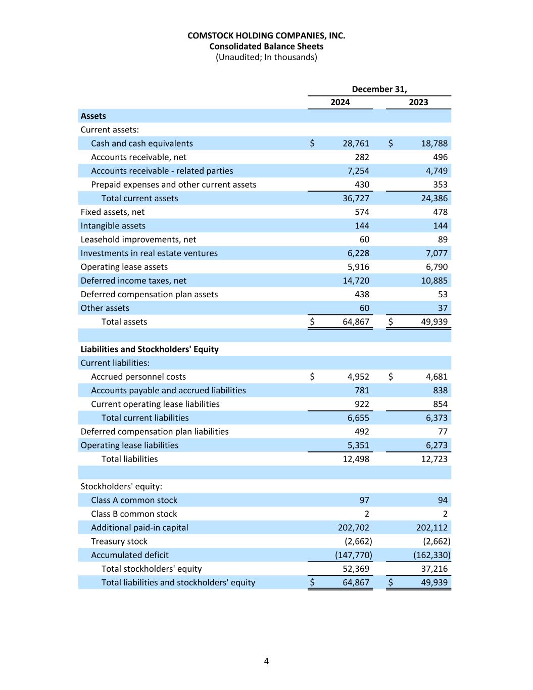 December 31, 2024 2023 Assets Current assets: Cash and cash equivalents $ 28,761 $ 18,788 Accounts receivable, net 282 496 Accounts receivable - related parties 7,254 4,749 Prepaid expenses and other current assets 430 353 Total current assets 36,727 24,386 Fixed assets, net 574 478 Intangible assets 144 144 Leasehold improvements, net 60 89 Investments in real estate ventures 6,228 7,077 Operating lease assets 5,916 6,790 Deferred income taxes, net 14,720 10,885 Deferred compensation plan assets 438 53 Other assets 60 37 Total assets $ 64,867 $ 49,939 Liabilities and Stockholders' Equity Current liabilities: Accrued personnel costs $ 4,952 $ 4,681 Accounts payable and accrued liabilities 781 838 Current operating lease liabilities 922 854 Total current liabilities 6,655 6,373 Deferred compensation plan liabilities 492 77 Operating lease liabilities 5,351 6,273 Total liabilities 12,498 12,723 Stockholders' equity: Class A common stock 97 94 Class B common stock 2 2 Additional paid-in capital 202,702 202,112 Treasury stock (2,662) (2,662) Accumulated deficit (147,770) (162,330) Total stockholders' equity 52,369 37,216 Total liabilities and stockholders' equity $ 64,867 $ 49,939 COMSTOCK HOLDING COMPANIES, INC. Consolidated Balance Sheets (Unaudited; In thousands) 4