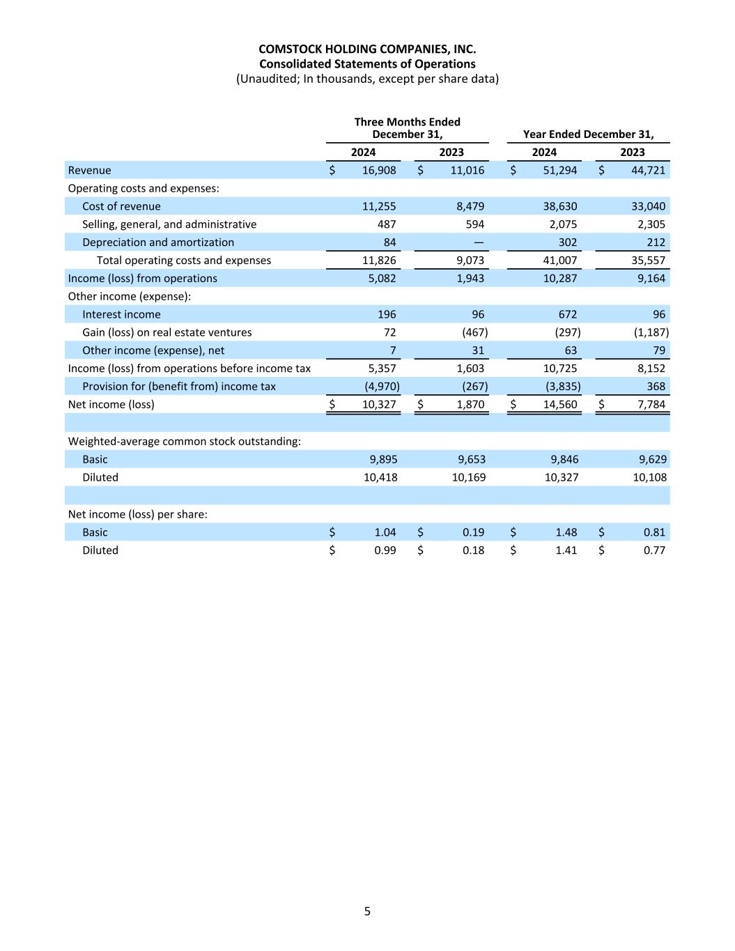 Three Months Ended December 31, Year Ended December 31, 2024 2023 2024 2023 Revenue $ 16,908 $ 11,016 $ 51,294 $ 44,721 Operating costs and expenses: Cost of revenue 11,255 8,479 38,630 33,040 Selling, general, and administrative 487 594 2,075 2,305 Depreciation and amortization 84 — 302 212 Total operating costs and expenses 11,826 9,073 41,007 35,557 Income (loss) from operations 5,082 1,943 10,287 9,164 Other income (expense): Interest income 196 96 672 96 Gain (loss) on real estate ventures 72 (467) (297) (1,187) Other income (expense), net 7 31 63 79 Income (loss) from operations before income tax 5,357 1,603 10,725 8,152 Provision for (benefit from) income tax (4,970) (267) (3,835) 368 Net income (loss) $ 10,327 $ 1,870 $ 14,560 $ 7,784 Weighted-average common stock outstanding: Basic 9,895 9,653 9,846 9,629 Diluted 10,418 10,169 10,327 10,108 Net income (loss) per share: Basic $ 1.04 $ 0.19 $ 1.48 $ 0.81 Diluted $ 0.99 $ 0.18 $ 1.41 $ 0.77 COMSTOCK HOLDING COMPANIES, INC. Consolidated Statements of Operations (Unaudited; In thousands, except per share data) 5