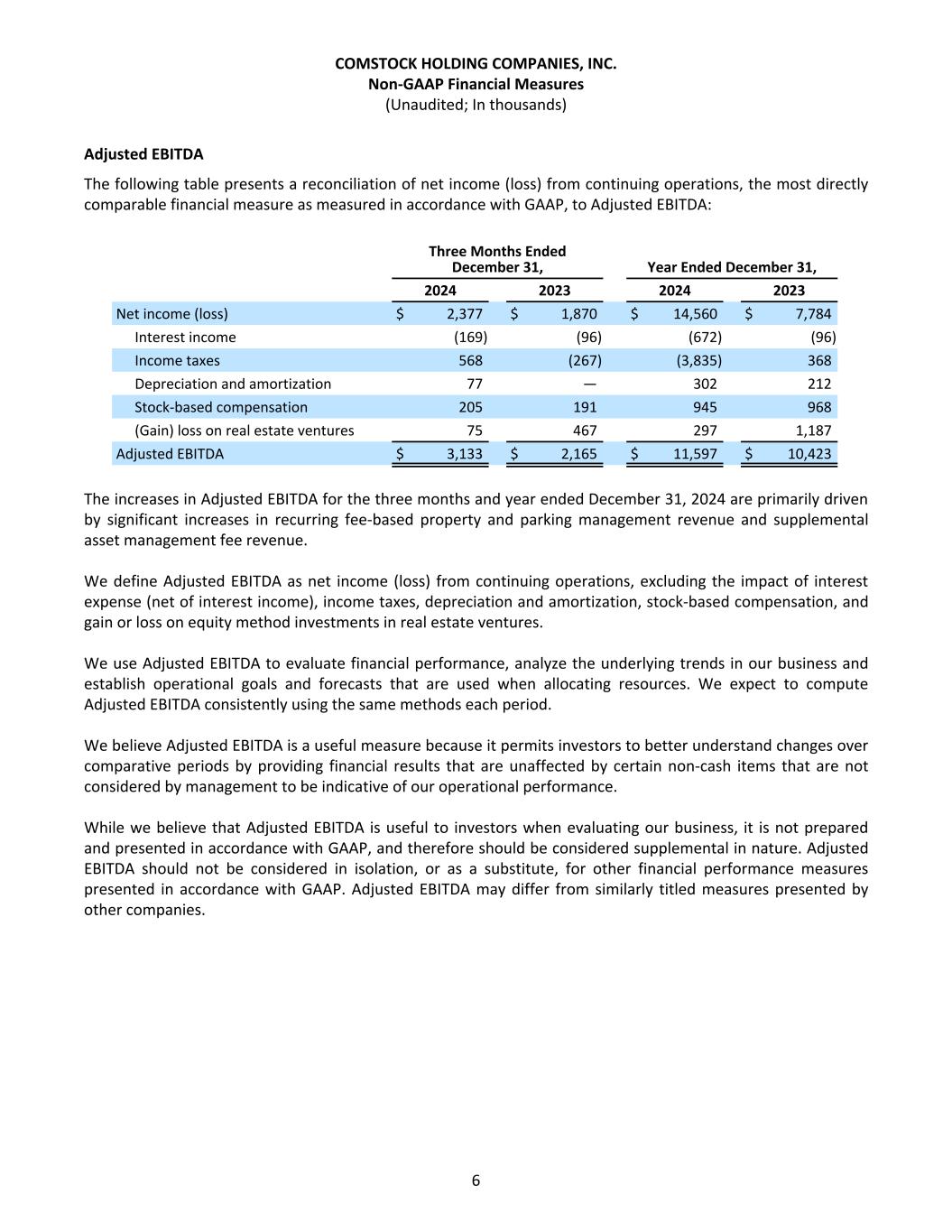 Adjusted EBITDA The following table presents a reconciliation of net income (loss) from continuing operations, the most directly comparable financial measure as measured in accordance with GAAP, to Adjusted EBITDA: Three Months Ended December 31, Year Ended December 31, 2024 2023 2024 2023 Net income (loss) $ 2,377 $ 1,870 $ 14,560 $ 7,784 Interest income (169) (96) (672) (96) Income taxes 568 (267) (3,835) 368 Depreciation and amortization 77 — 302 212 Stock-based compensation 205 191 945 968 (Gain) loss on real estate ventures 75 467 297 1,187 Adjusted EBITDA $ 3,133 $ 2,165 $ 11,597 $ 10,423 The increases in Adjusted EBITDA for the three months and year ended December 31, 2024 are primarily driven by significant increases in recurring fee-based property and parking management revenue and supplemental asset management fee revenue. We define Adjusted EBITDA as net income (loss) from continuing operations, excluding the impact of interest expense (net of interest income), income taxes, depreciation and amortization, stock-based compensation, and gain or loss on equity method investments in real estate ventures. We use Adjusted EBITDA to evaluate financial performance, analyze the underlying trends in our business and establish operational goals and forecasts that are used when allocating resources. We expect to compute Adjusted EBITDA consistently using the same methods each period. We believe Adjusted EBITDA is a useful measure because it permits investors to better understand changes over comparative periods by providing financial results that are unaffected by certain non-cash items that are not considered by management to be indicative of our operational performance. While we believe that Adjusted EBITDA is useful to investors when evaluating our business, it is not prepared and presented in accordance with GAAP, and therefore should be considered supplemental in nature. Adjusted EBITDA should not be considered in isolation, or as a substitute, for other financial performance measures presented in accordance with GAAP. Adjusted EBITDA may differ from similarly titled measures presented by other companies. COMSTOCK HOLDING COMPANIES, INC. Non-GAAP Financial Measures (Unaudited; In thousands) 6