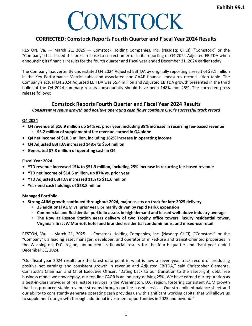 CORRECTED: Comstock Reports Fourth Quarter and Fiscal Year 2024 Results RESTON, Va. — March 21, 2025 — Comstock Holding Companies, Inc. (Nasdaq: CHCI) (“Comstock” or the “Company”) has issued this press release to correct an error in its reporting of Q4 2024 Adjusted EBITDA when announcing its financial results for the fourth quarter and fiscal year ended December 31, 2024 earlier today. The Company inadvertently understated Q4 2024 Adjusted EBITDA by originally reporting a result of $3.1 million in the Key Performance Metrics table and associated non-GAAP financial measures reconciliation table. The Company’s actual Q4 2024 Adjusted EBITDA was $5.4 million and Adjusted EBITDA growth presented in the third bullet of the Q4 2024 summary results consequently should have been 148%, not 45%. The corrected press release follows: Comstock Reports Fourth Quarter and Fiscal Year 2024 Results Consistent revenue growth and positive operating cash flows continue CHCI’s successful track record Q4 2024 • Q4 revenue of $16.9 million up 54% vs. prior year, including 38% increase in recurring fee-based revenue ◦ $3.2 million of supplemental fee revenue earned in Q4 alone • Q4 net income of $10.3 million, including 162% increase in operating income • Q4 Adjusted EBITDA increased 148% to $5.4 million • Generated $7.8 million of operating cash in Q4 Fiscal Year 2024 • YTD revenue increased 15% to $51.3 million, including 25% increase in recurring fee-based revenue • YTD net income of $14.6 million, up 87% vs. prior year • YTD Adjusted EBITDA increased 11% to $11.6 million • Year-end cash holdings of $28.8 million Managed Portfolio • Strong AUM growth continued throughout 2024, major assets on track for late 2025 delivery ◦ 23 additional AUM vs. prior year, primarily driven by rapid ParkX expansion ◦ Commercial and Residential portfolio assets in high demand and leased well-above industry average ◦ The Row at Reston Station nears delivery of two Trophy office towers, luxury residential tower, Virginia’s first JW Marriott hotel and branded residential condominiums, and mixed-use retail RESTON, Va. — March 21, 2025 — Comstock Holding Companies, Inc. (Nasdaq: CHCI) (“Comstock” or the “Company”), a leading asset manager, developer, and operator of mixed-use and transit-oriented properties in the Washington, D.C. region, announced its financial results for the fourth quarter and fiscal year ended December 31, 2024. “Our fiscal year 2024 results are the latest data point in what is now a seven-year track record of producing positive net earnings and consistent growth in revenue and Adjusted EBITDA,” said Christopher Clemente, Comstock’s Chairman and Chief Executive Officer. “Dating back to our transition to the asset-light, debt free business model we now deploy, our top-line CAGR is an industry-defying 25%. We have earned our reputation as a best-in-class provider of real estate services in the Washington, D.C. region, fostering consistent AUM growth that has produced stable revenue streams through our fee-based services. Our streamlined balance sheet and our ability to consistently generate operating cash provides us with significant working capital that will allows us to supplement our growth through additional investment opportunities in 2025 and beyond.” 1 Exhibit 99.1