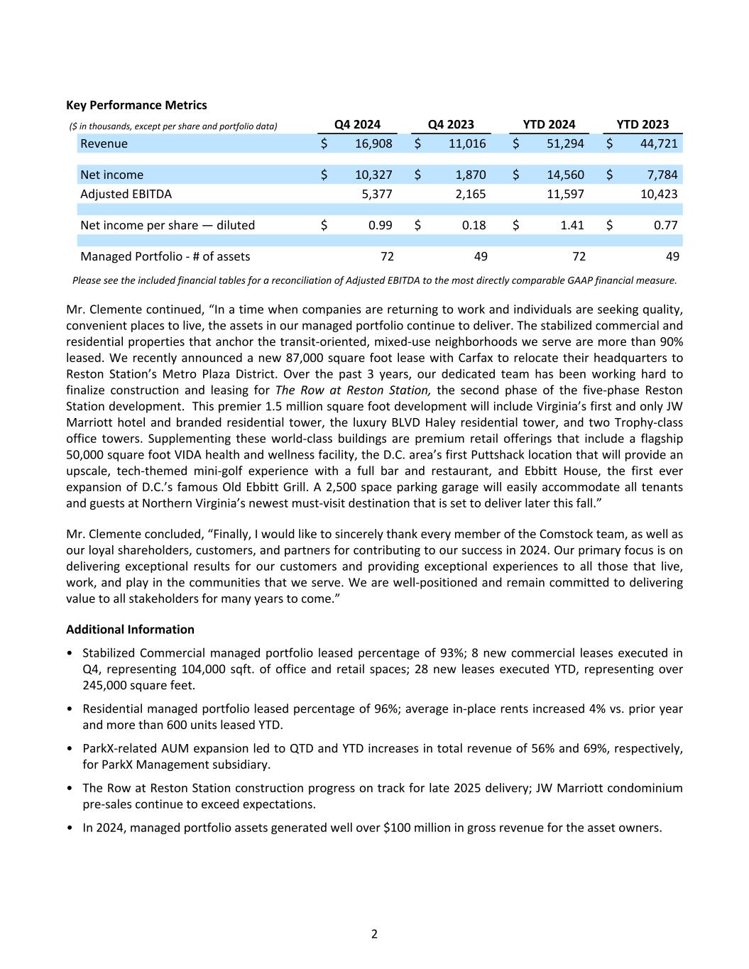 Key Performance Metrics ($ in thousands, except per share and portfolio data) Q4 2024 Q4 2023 YTD 2024 YTD 2023 Revenue $ 16,908 $ 11,016 $ 51,294 $ 44,721 Net income $ 10,327 $ 1,870 $ 14,560 $ 7,784 Adjusted EBITDA 5,377 2,165 11,597 10,423 Net income per share — diluted $ 0.99 $ 0.18 $ 1.41 $ 0.77 Managed Portfolio - # of assets 72 49 72 49 Please see the included financial tables for a reconciliation of Adjusted EBITDA to the most directly comparable GAAP financial measure. Mr. Clemente continued, “In a time when companies are returning to work and individuals are seeking quality, convenient places to live, the assets in our managed portfolio continue to deliver. The stabilized commercial and residential properties that anchor the transit-oriented, mixed-use neighborhoods we serve are more than 90% leased. We recently announced a new 87,000 square foot lease with Carfax to relocate their headquarters to Reston Station’s Metro Plaza District. Over the past 3 years, our dedicated team has been working hard to finalize construction and leasing for The Row at Reston Station, the second phase of the five-phase Reston Station development. This premier 1.5 million square foot development will include Virginia’s first and only JW Marriott hotel and branded residential tower, the luxury BLVD Haley residential tower, and two Trophy-class office towers. Supplementing these world-class buildings are premium retail offerings that include a flagship 50,000 square foot VIDA health and wellness facility, the D.C. area’s first Puttshack location that will provide an upscale, tech-themed mini-golf experience with a full bar and restaurant, and Ebbitt House, the first ever expansion of D.C.’s famous Old Ebbitt Grill. A 2,500 space parking garage will easily accommodate all tenants and guests at Northern Virginia’s newest must-visit destination that is set to deliver later this fall.” Mr. Clemente concluded, “Finally, I would like to sincerely thank every member of the Comstock team, as well as our loyal shareholders, customers, and partners for contributing to our success in 2024. Our primary focus is on delivering exceptional results for our customers and providing exceptional experiences to all those that live, work, and play in the communities that we serve. We are well-positioned and remain committed to delivering value to all stakeholders for many years to come.” Additional Information • Stabilized Commercial managed portfolio leased percentage of 93%; 8 new commercial leases executed in Q4, representing 104,000 sqft. of office and retail spaces; 28 new leases executed YTD, representing over 245,000 square feet. • Residential managed portfolio leased percentage of 96%; average in-place rents increased 4% vs. prior year and more than 600 units leased YTD. • ParkX-related AUM expansion led to QTD and YTD increases in total revenue of 56% and 69%, respectively, for ParkX Management subsidiary. • The Row at Reston Station construction progress on track for late 2025 delivery; JW Marriott condominium pre-sales continue to exceed expectations. • In 2024, managed portfolio assets generated well over $100 million in gross revenue for the asset owners. 2
