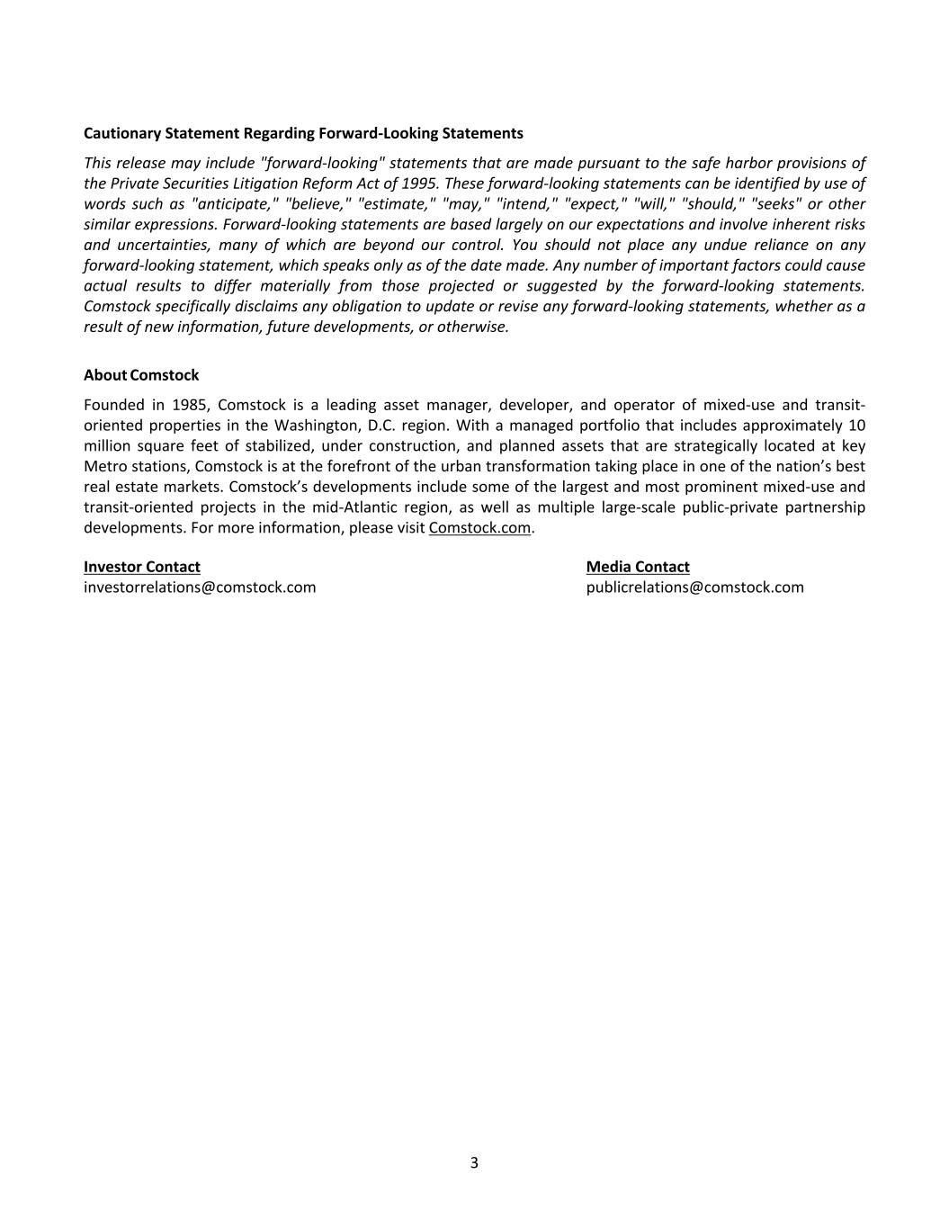 Cautionary Statement Regarding Forward-Looking Statements This release may include "forward-looking" statements that are made pursuant to the safe harbor provisions of the Private Securities Litigation Reform Act of 1995. These forward-looking statements can be identified by use of words such as "anticipate," "believe," "estimate," "may," "intend," "expect," "will," "should," "seeks" or other similar expressions. Forward-looking statements are based largely on our expectations and involve inherent risks and uncertainties, many of which are beyond our control. You should not place any undue reliance on any forward-looking statement, which speaks only as of the date made. Any number of important factors could cause actual results to differ materially from those projected or suggested by the forward-looking statements. Comstock specifically disclaims any obligation to update or revise any forward-looking statements, whether as a result of new information, future developments, or otherwise. About Comstock Founded in 1985, Comstock is a leading asset manager, developer, and operator of mixed-use and transit- oriented properties in the Washington, D.C. region. With a managed portfolio that includes approximately 10 million square feet of stabilized, under construction, and planned assets that are strategically located at key Metro stations, Comstock is at the forefront of the urban transformation taking place in one of the nation’s best real estate markets. Comstock’s developments include some of the largest and most prominent mixed-use and transit-oriented projects in the mid-Atlantic region, as well as multiple large-scale public-private partnership developments. For more information, please visit Comstock.com. Investor Contact Media Contact investorrelations@comstock.com publicrelations@comstock.com 3