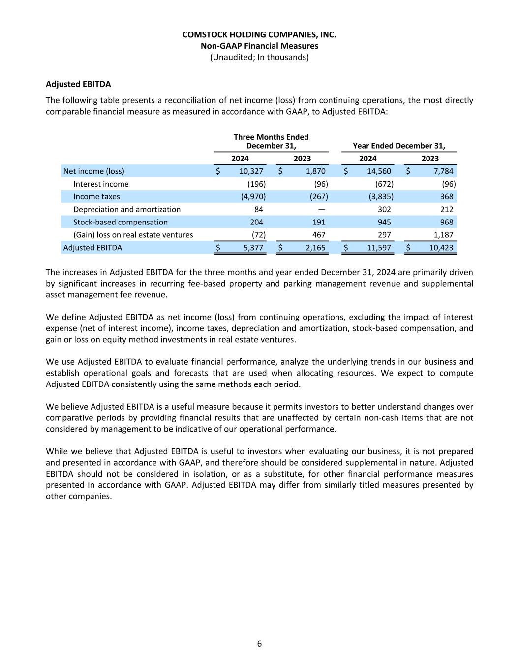 Adjusted EBITDA The following table presents a reconciliation of net income (loss) from continuing operations, the most directly comparable financial measure as measured in accordance with GAAP, to Adjusted EBITDA: Three Months Ended December 31, Year Ended December 31, 2024 2023 2024 2023 Net income (loss) $ 10,327 $ 1,870 $ 14,560 $ 7,784 Interest income (196) (96) (672) (96) Income taxes (4,970) (267) (3,835) 368 Depreciation and amortization 84 — 302 212 Stock-based compensation 204 191 945 968 (Gain) loss on real estate ventures (72) 467 297 1,187 Adjusted EBITDA $ 5,377 $ 2,165 $ 11,597 $ 10,423 The increases in Adjusted EBITDA for the three months and year ended December 31, 2024 are primarily driven by significant increases in recurring fee-based property and parking management revenue and supplemental asset management fee revenue. We define Adjusted EBITDA as net income (loss) from continuing operations, excluding the impact of interest expense (net of interest income), income taxes, depreciation and amortization, stock-based compensation, and gain or loss on equity method investments in real estate ventures. We use Adjusted EBITDA to evaluate financial performance, analyze the underlying trends in our business and establish operational goals and forecasts that are used when allocating resources. We expect to compute Adjusted EBITDA consistently using the same methods each period. We believe Adjusted EBITDA is a useful measure because it permits investors to better understand changes over comparative periods by providing financial results that are unaffected by certain non-cash items that are not considered by management to be indicative of our operational performance. While we believe that Adjusted EBITDA is useful to investors when evaluating our business, it is not prepared and presented in accordance with GAAP, and therefore should be considered supplemental in nature. Adjusted EBITDA should not be considered in isolation, or as a substitute, for other financial performance measures presented in accordance with GAAP. Adjusted EBITDA may differ from similarly titled measures presented by other companies. COMSTOCK HOLDING COMPANIES, INC. Non-GAAP Financial Measures (Unaudited; In thousands) 6