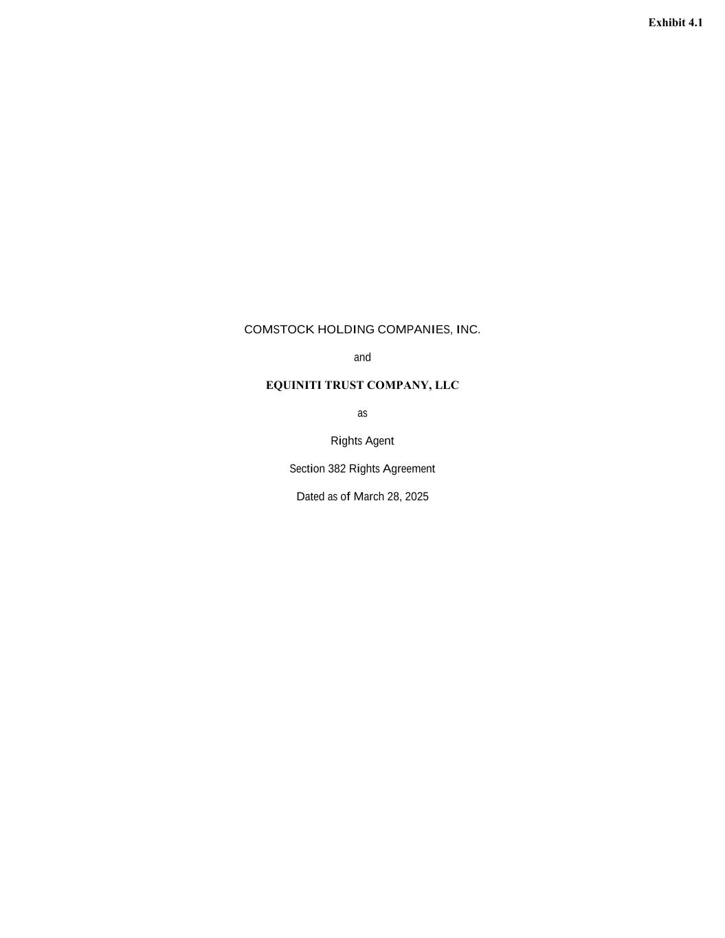 COMSTOCK HOLDING COMPANIES, INC. and EQUINITI TRUST COMPANY, LLC as Rights Agent Section 382 Rights Agreement Dated as of March 28, 2025 Exhibit 4.1