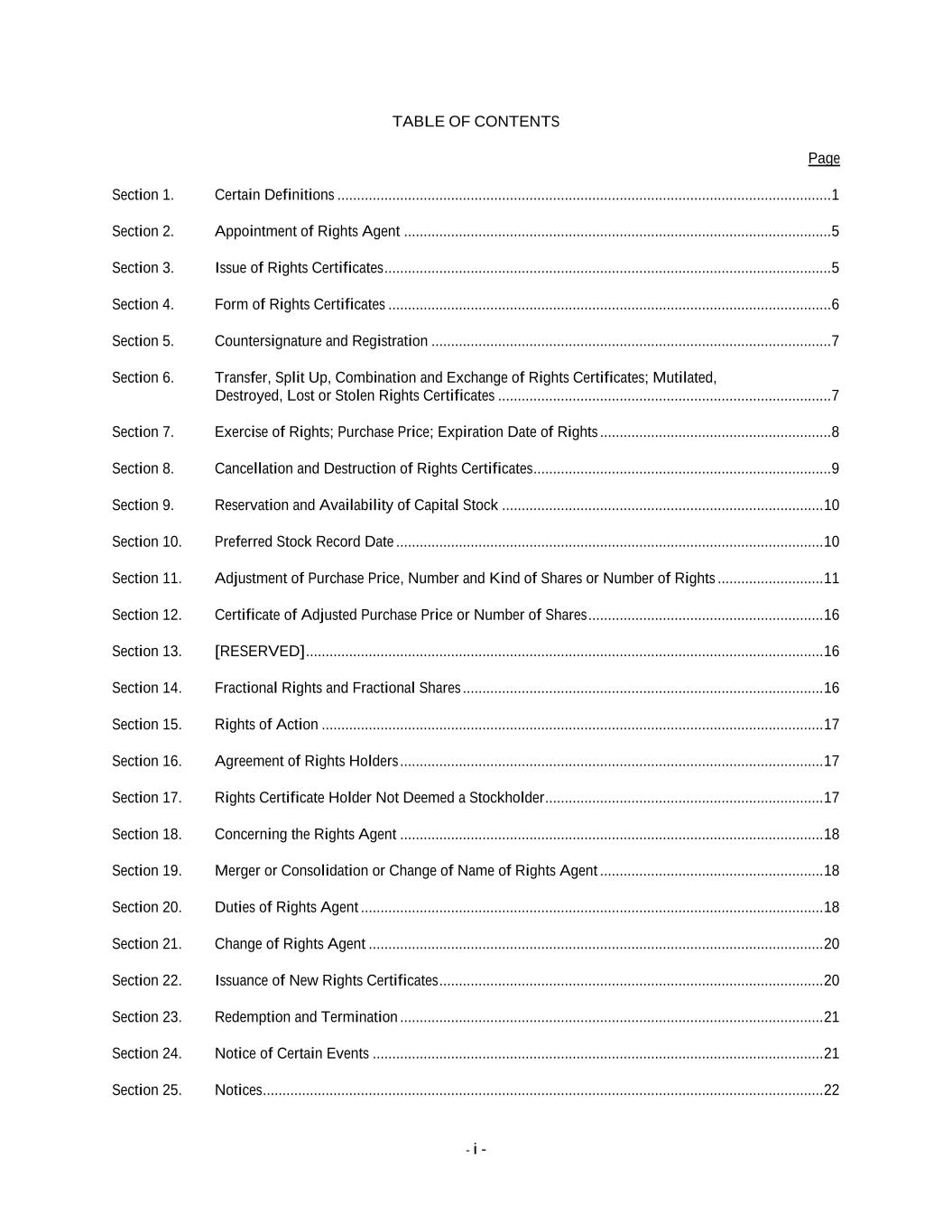 - i - TABLE OF CONTENTS Page Section 1. Certain Definitions .............................................................................................................................. 1 Section 2. Appointment of Rights Agent ............................................................................................................. 5 Section 3. Issue of Rights Certificates .................................................................................................................. 5 Section 4. Form of Rights Certificates ................................................................................................................. 6 Section 5. Countersignature and Registration ...................................................................................................... 7 Section 6. Transfer, Split Up, Combination and Exchange of Rights Certificates; Mutilated, Destroyed, Lost or Stolen Rights Certificates ..................................................................................... 7 Section 7. Exercise of Rights; Purchase Price; Expiration Date of Rights ........................................................... 8 Section 8. Cancellation and Destruction of Rights Certificates............................................................................ 9 Section 9. Reservation and Availability of Capital Stock .................................................................................. 10 Section 10. Preferred Stock Record Date ............................................................................................................. 10 Section 11. Adjustment of Purchase Price, Number and Kind of Shares or Number of Rights ........................... 11 Section 12. Certificate of Adjusted Purchase Price or Number of Shares ............................................................ 16 Section 13. [RESERVED] .................................................................................................................................... 16 Section 14. Fractional Rights and Fractional Shares ............................................................................................ 16 Section 15. Rights of Action ................................................................................................................................ 17 Section 16. Agreement of Rights Holders ............................................................................................................ 17 Section 17. Rights Certificate Holder Not Deemed a Stockholder ....................................................................... 17 Section 18. Concerning the Rights Agent ............................................................................................................ 18 Section 19. Merger or Consolidation or Change of Name of Rights Agent ......................................................... 18 Section 20. Duties of Rights Agent ...................................................................................................................... 18 Section 21. Change of Rights Agent .................................................................................................................... 20 Section 22. Issuance of New Rights Certificates .................................................................................................. 20 Section 23. Redemption and Termination ............................................................................................................ 21 Section 24. Notice of Certain Events ................................................................................................................... 21 Section 25. Notices ............................................................................................................................................... 22
