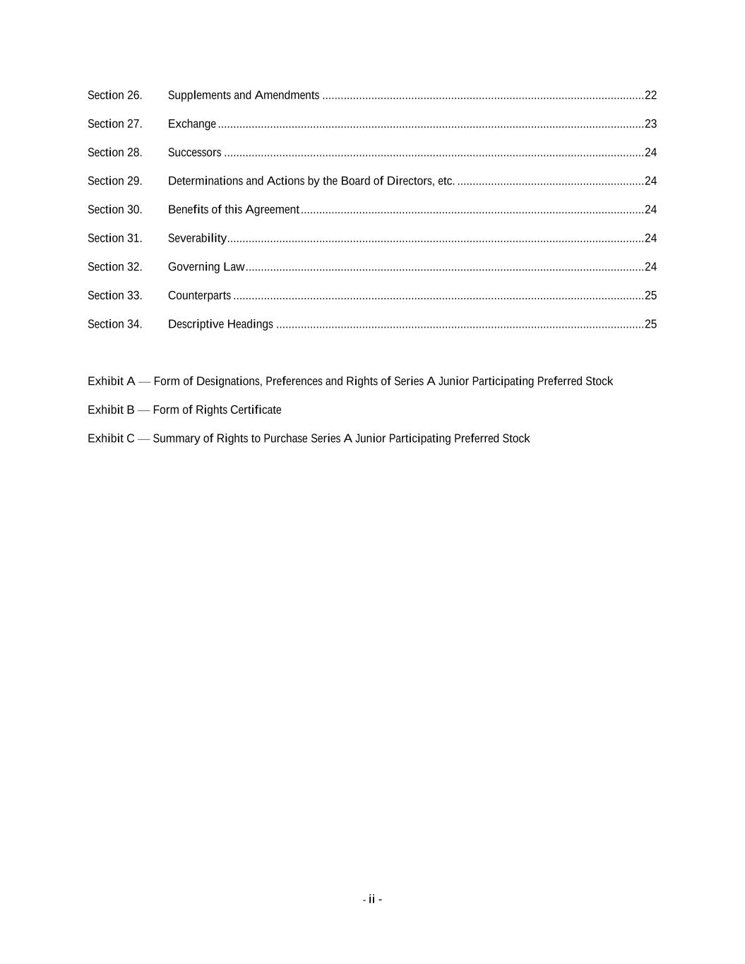 - ii - Section 26. Supplements and Amendments ......................................................................................................... 22 Section 27. Exchange ........................................................................................................................................... 23 Section 28. Successors ......................................................................................................................................... 24 Section 29. Determinations and Actions by the Board of Directors, etc. ............................................................. 24 Section 30. Benefits of this Agreement ................................................................................................................ 24 Section 31. Severability ........................................................................................................................................ 24 Section 32. Governing Law .................................................................................................................................. 24 Section 33. Counterparts ...................................................................................................................................... 25 Section 34. Descriptive Headings ........................................................................................................................ 25 Exhibit A — Form of Designations, Preferences and Rights of Series A Junior Participating Preferred Stock Exhibit B — Form of Rights Certificate Exhibit C — Summary of Rights to Purchase Series A Junior Participating Preferred Stock