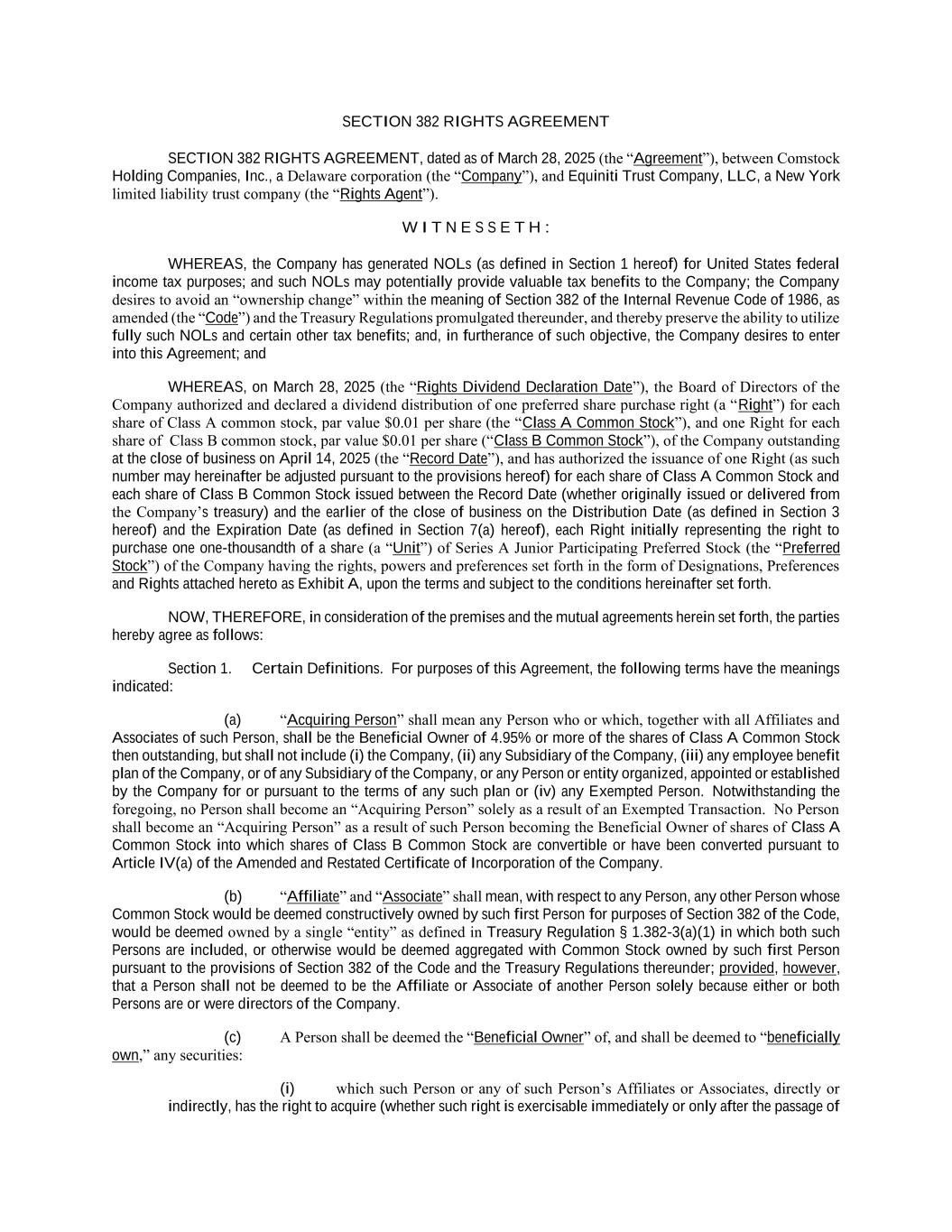 SECTION 382 RIGHTS AGREEMENT SECTION 382 RIGHTS AGREEMENT, dated as of March 28, 2025 (the “Agreement”), between Comstock Holding Companies, Inc., a Delaware corporation (the “Company”), and Equiniti Trust Company, LLC, a New York limited liability trust company (the “Rights Agent”). W I T N E S S E T H : WHEREAS, the Company has generated NOLs (as defined in Section 1 hereof) for United States federal income tax purposes; and such NOLs may potentially provide valuable tax benefits to the Company; the Company desires to avoid an “ownership change” within the meaning of Section 382 of the Internal Revenue Code of 1986, as amended (the “Code”) and the Treasury Regulations promulgated thereunder, and thereby preserve the ability to utilize fully such NOLs and certain other tax benefits; and, in furtherance of such objective, the Company desires to enter into this Agreement; and WHEREAS, on March 28, 2025 (the “Rights Dividend Declaration Date”), the Board of Directors of the Company authorized and declared a dividend distribution of one preferred share purchase right (a “Right”) for each share of Class A common stock, par value $0.01 per share (the “Class A Common Stock”), and one Right for each share of Class B common stock, par value $0.01 per share (“Class B Common Stock”), of the Company outstanding at the close of business on April 14, 2025 (the “Record Date”), and has authorized the issuance of one Right (as such number may hereinafter be adjusted pursuant to the provisions hereof) for each share of Class A Common Stock and each share of Class B Common Stock issued between the Record Date (whether originally issued or delivered from the Company’s treasury) and the earlier of the close of business on the Distribution Date (as defined in Section 3 hereof) and the Expiration Date (as defined in Section 7(a) hereof), each Right initially representing the right to purchase one one-thousandth of a share (a “Unit”) of Series A Junior Participating Preferred Stock (the “Preferred Stock”) of the Company having the rights, powers and preferences set forth in the form of Designations, Preferences and Rights attached hereto as Exhibit A, upon the terms and subject to the conditions hereinafter set forth. NOW, THEREFORE, in consideration of the premises and the mutual agreements herein set forth, the parties hereby agree as follows: Section 1. Certain Definitions. For purposes of this Agreement, the following terms have the meanings indicated: (a) “Acquiring Person” shall mean any Person who or which, together with all Affiliates and Associates of such Person, shall be the Beneficial Owner of 4.95% or more of the shares of Class A Common Stock then outstanding, but shall not include (i) the Company, (ii) any Subsidiary of the Company, (iii) any employee benefit plan of the Company, or of any Subsidiary of the Company, or any Person or entity organized, appointed or established by the Company for or pursuant to the terms of any such plan or (iv) any Exempted Person. Notwithstanding the foregoing, no Person shall become an “Acquiring Person” solely as a result of an Exempted Transaction. No Person shall become an “Acquiring Person” as a result of such Person becoming the Beneficial Owner of shares of Class A Common Stock into which shares of Class B Common Stock are convertible or have been converted pursuant to Article IV(a) of the Amended and Restated Certificate of Incorporation of the Company. (b) “Affiliate” and “Associate” shall mean, with respect to any Person, any other Person whose Common Stock would be deemed constructively owned by such first Person for purposes of Section 382 of the Code, would be deemed owned by a single “entity” as defined in Treasury Regulation § 1.382-3(a)(1) in which both such Persons are included, or otherwise would be deemed aggregated with Common Stock owned by such first Person pursuant to the provisions of Section 382 of the Code and the Treasury Regulations thereunder; provided, however, that a Person shall not be deemed to be the Affiliate or Associate of another Person solely because either or both Persons are or were directors of the Company. (c) A Person shall be deemed the “Beneficial Owner” of, and shall be deemed to “beneficially own,” any securities: (i) which such Person or any of such Person’s Affiliates or Associates, directly or indirectly, has the right to acquire (whether such right is exercisable immediately or only after the passage of