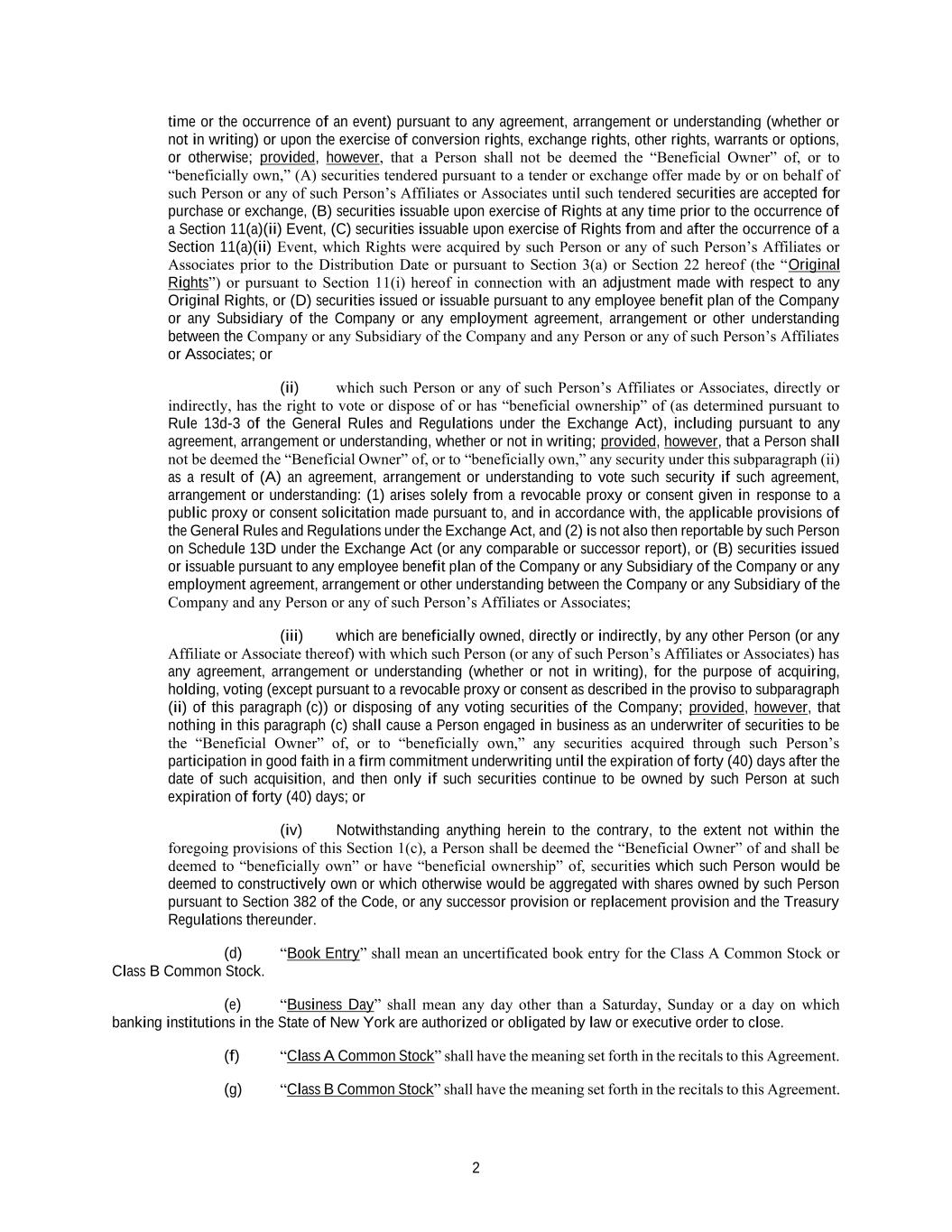 2 time or the occurrence of an event) pursuant to any agreement, arrangement or understanding (whether or not in writing) or upon the exercise of conversion rights, exchange rights, other rights, warrants or options, or otherwise; provided, however, that a Person shall not be deemed the “Beneficial Owner” of, or to “beneficially own,” (A) securities tendered pursuant to a tender or exchange offer made by or on behalf of such Person or any of such Person’s Affiliates or Associates until such tendered securities are accepted for purchase or exchange, (B) securities issuable upon exercise of Rights at any time prior to the occurrence of a Section 11(a)(ii) Event, (C) securities issuable upon exercise of Rights from and after the occurrence of a Section 11(a)(ii) Event, which Rights were acquired by such Person or any of such Person’s Affiliates or Associates prior to the Distribution Date or pursuant to Section 3(a) or Section 22 hereof (the “Original Rights”) or pursuant to Section 11(i) hereof in connection with an adjustment made with respect to any Original Rights, or (D) securities issued or issuable pursuant to any employee benefit plan of the Company or any Subsidiary of the Company or any employment agreement, arrangement or other understanding between the Company or any Subsidiary of the Company and any Person or any of such Person’s Affiliates or Associates; or (ii) which such Person or any of such Person’s Affiliates or Associates, directly or indirectly, has the right to vote or dispose of or has “beneficial ownership” of (as determined pursuant to Rule 13d-3 of the General Rules and Regulations under the Exchange Act), including pursuant to any agreement, arrangement or understanding, whether or not in writing; provided, however, that a Person shall not be deemed the “Beneficial Owner” of, or to “beneficially own,” any security under this subparagraph (ii) as a result of (A) an agreement, arrangement or understanding to vote such security if such agreement, arrangement or understanding: (1) arises solely from a revocable proxy or consent given in response to a public proxy or consent solicitation made pursuant to, and in accordance with, the applicable provisions of the General Rules and Regulations under the Exchange Act, and (2) is not also then reportable by such Person on Schedule 13D under the Exchange Act (or any comparable or successor report), or (B) securities issued or issuable pursuant to any employee benefit plan of the Company or any Subsidiary of the Company or any employment agreement, arrangement or other understanding between the Company or any Subsidiary of the Company and any Person or any of such Person’s Affiliates or Associates; (iii) which are beneficially owned, directly or indirectly, by any other Person (or any Affiliate or Associate thereof) with which such Person (or any of such Person’s Affiliates or Associates) has any agreement, arrangement or understanding (whether or not in writing), for the purpose of acquiring, holding, voting (except pursuant to a revocable proxy or consent as described in the proviso to subparagraph (ii) of this paragraph (c)) or disposing of any voting securities of the Company; provided, however, that nothing in this paragraph (c) shall cause a Person engaged in business as an underwriter of securities to be the “Beneficial Owner” of, or to “beneficially own,” any securities acquired through such Person’s participation in good faith in a firm commitment underwriting until the expiration of forty (40) days after the date of such acquisition, and then only if such securities continue to be owned by such Person at such expiration of forty (40) days; or (iv) Notwithstanding anything herein to the contrary, to the extent not within the foregoing provisions of this Section 1(c), a Person shall be deemed the “Beneficial Owner” of and shall be deemed to “beneficially own” or have “beneficial ownership” of, securities which such Person would be deemed to constructively own or which otherwise would be aggregated with shares owned by such Person pursuant to Section 382 of the Code, or any successor provision or replacement provision and the Treasury Regulations thereunder. (d) “Book Entry” shall mean an uncertificated book entry for the Class A Common Stock or Class B Common Stock. (e) “Business Day” shall mean any day other than a Saturday, Sunday or a day on which banking institutions in the State of New York are authorized or obligated by law or executive order to close. (f) “Class A Common Stock” shall have the meaning set forth in the recitals to this Agreement. (g) “Class B Common Stock” shall have the meaning set forth in the recitals to this Agreement.
