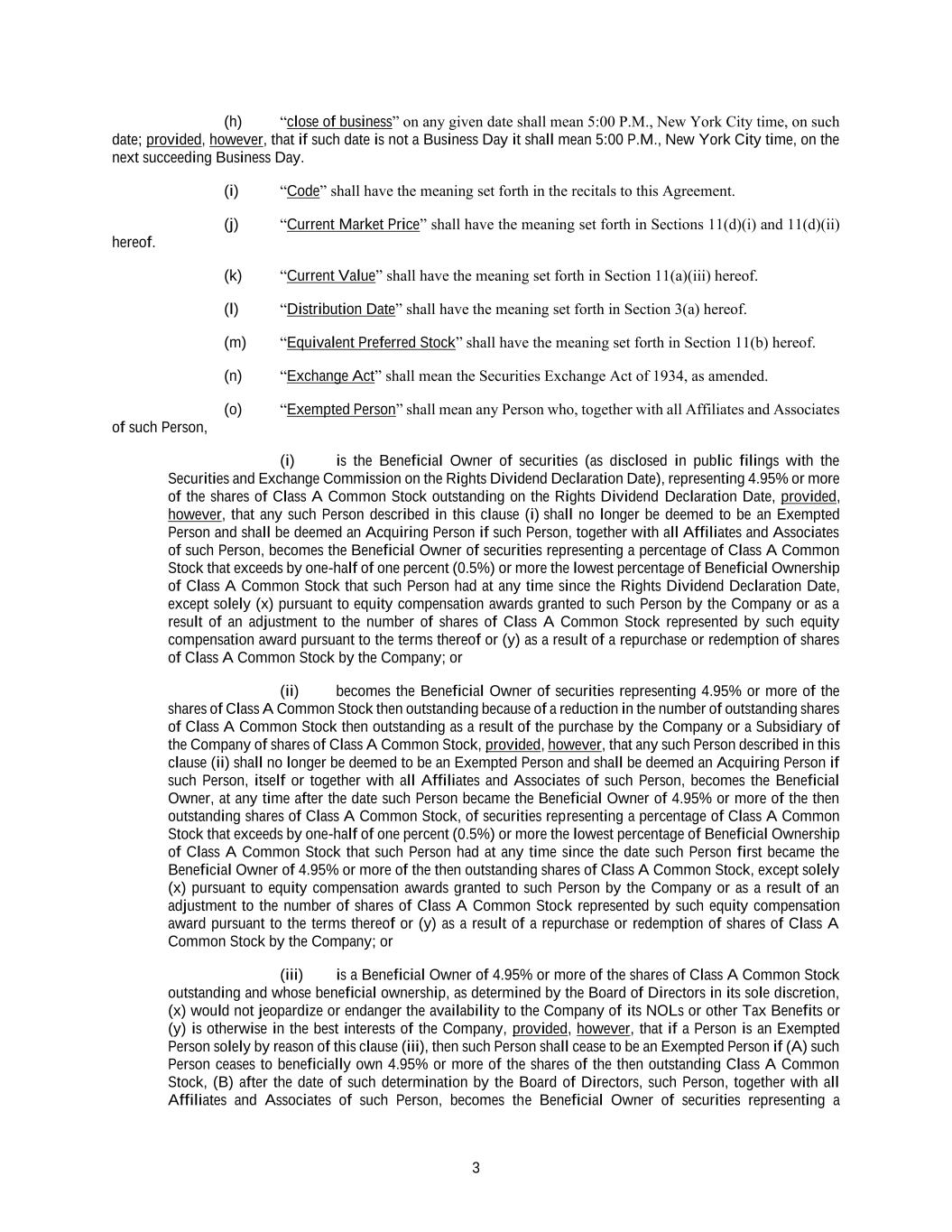 3 (h) “close of business” on any given date shall mean 5:00 P.M., New York City time, on such date; provided, however, that if such date is not a Business Day it shall mean 5:00 P.M., New York City time, on the next succeeding Business Day. (i) “Code” shall have the meaning set forth in the recitals to this Agreement. (j) “Current Market Price” shall have the meaning set forth in Sections 11(d)(i) and 11(d)(ii) hereof. (k) “Current Value” shall have the meaning set forth in Section 11(a)(iii) hereof. (l) “Distribution Date” shall have the meaning set forth in Section 3(a) hereof. (m) “Equivalent Preferred Stock” shall have the meaning set forth in Section 11(b) hereof. (n) “Exchange Act” shall mean the Securities Exchange Act of 1934, as amended. (o) “Exempted Person” shall mean any Person who, together with all Affiliates and Associates of such Person, (i) is the Beneficial Owner of securities (as disclosed in public filings with the Securities and Exchange Commission on the Rights Dividend Declaration Date), representing 4.95% or more of the shares of Class A Common Stock outstanding on the Rights Dividend Declaration Date, provided, however, that any such Person described in this clause (i) shall no longer be deemed to be an Exempted Person and shall be deemed an Acquiring Person if such Person, together with all Affiliates and Associates of such Person, becomes the Beneficial Owner of securities representing a percentage of Class A Common Stock that exceeds by one-half of one percent (0.5%) or more the lowest percentage of Beneficial Ownership of Class A Common Stock that such Person had at any time since the Rights Dividend Declaration Date, except solely (x) pursuant to equity compensation awards granted to such Person by the Company or as a result of an adjustment to the number of shares of Class A Common Stock represented by such equity compensation award pursuant to the terms thereof or (y) as a result of a repurchase or redemption of shares of Class A Common Stock by the Company; or (ii) becomes the Beneficial Owner of securities representing 4.95% or more of the shares of Class A Common Stock then outstanding because of a reduction in the number of outstanding shares of Class A Common Stock then outstanding as a result of the purchase by the Company or a Subsidiary of the Company of shares of Class A Common Stock, provided, however, that any such Person described in this clause (ii) shall no longer be deemed to be an Exempted Person and shall be deemed an Acquiring Person if such Person, itself or together with all Affiliates and Associates of such Person, becomes the Beneficial Owner, at any time after the date such Person became the Beneficial Owner of 4.95% or more of the then outstanding shares of Class A Common Stock, of securities representing a percentage of Class A Common Stock that exceeds by one-half of one percent (0.5%) or more the lowest percentage of Beneficial Ownership of Class A Common Stock that such Person had at any time since the date such Person first became the Beneficial Owner of 4.95% or more of the then outstanding shares of Class A Common Stock, except solely (x) pursuant to equity compensation awards granted to such Person by the Company or as a result of an adjustment to the number of shares of Class A Common Stock represented by such equity compensation award pursuant to the terms thereof or (y) as a result of a repurchase or redemption of shares of Class A Common Stock by the Company; or (iii) is a Beneficial Owner of 4.95% or more of the shares of Class A Common Stock outstanding and whose beneficial ownership, as determined by the Board of Directors in its sole discretion, (x) would not jeopardize or endanger the availability to the Company of its NOLs or other Tax Benefits or (y) is otherwise in the best interests of the Company, provided, however, that if a Person is an Exempted Person solely by reason of this clause (iii), then such Person shall cease to be an Exempted Person if (A) such Person ceases to beneficially own 4.95% or more of the shares of the then outstanding Class A Common Stock, (B) after the date of such determination by the Board of Directors, such Person, together with all Affiliates and Associates of such Person, becomes the Beneficial Owner of securities representing a