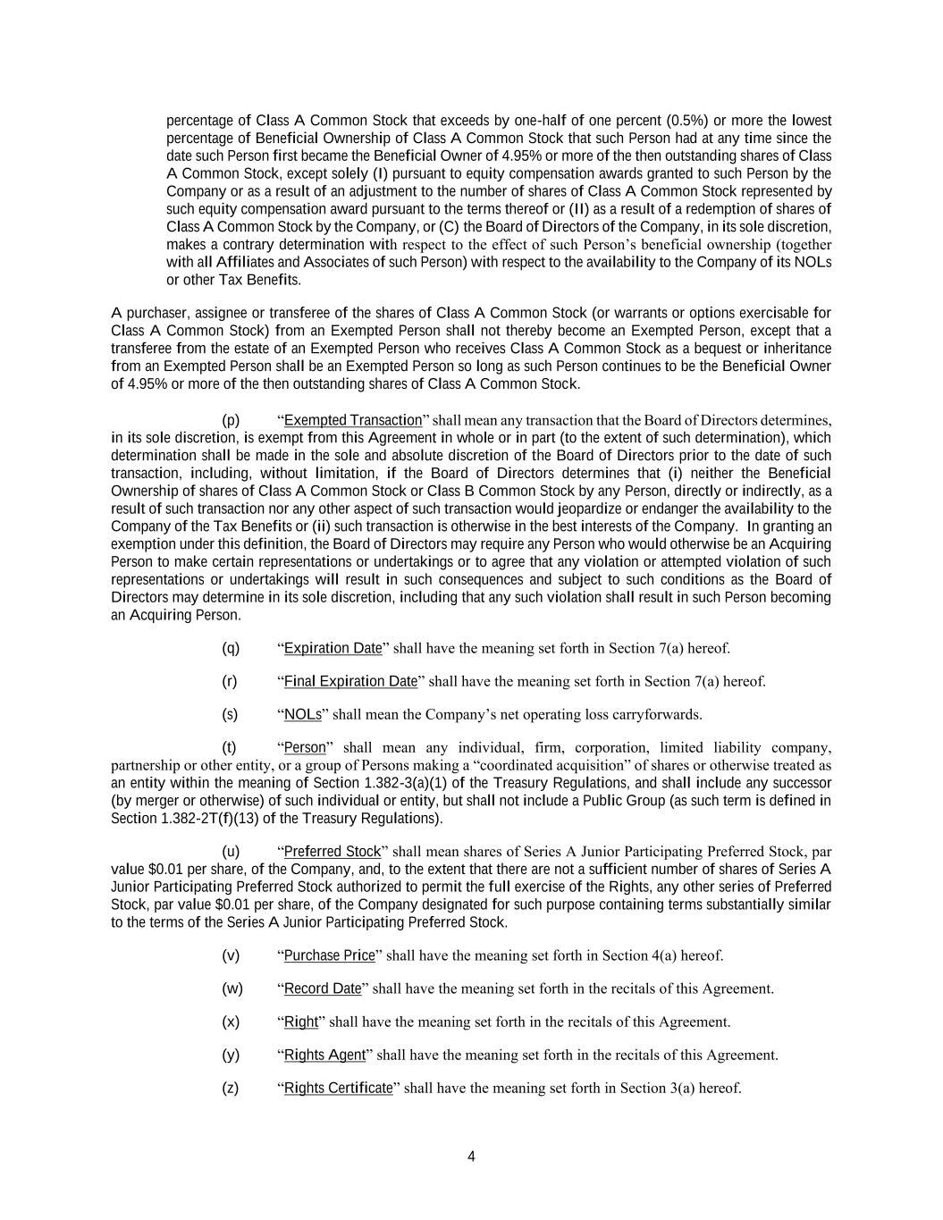 4 percentage of Class A Common Stock that exceeds by one-half of one percent (0.5%) or more the lowest percentage of Beneficial Ownership of Class A Common Stock that such Person had at any time since the date such Person first became the Beneficial Owner of 4.95% or more of the then outstanding shares of Class A Common Stock, except solely (I) pursuant to equity compensation awards granted to such Person by the Company or as a result of an adjustment to the number of shares of Class A Common Stock represented by such equity compensation award pursuant to the terms thereof or (II) as a result of a redemption of shares of Class A Common Stock by the Company, or (C) the Board of Directors of the Company, in its sole discretion, makes a contrary determination with respect to the effect of such Person’s beneficial ownership (together with all Affiliates and Associates of such Person) with respect to the availability to the Company of its NOLs or other Tax Benefits. A purchaser, assignee or transferee of the shares of Class A Common Stock (or warrants or options exercisable for Class A Common Stock) from an Exempted Person shall not thereby become an Exempted Person, except that a transferee from the estate of an Exempted Person who receives Class A Common Stock as a bequest or inheritance from an Exempted Person shall be an Exempted Person so long as such Person continues to be the Beneficial Owner of 4.95% or more of the then outstanding shares of Class A Common Stock. (p) “Exempted Transaction” shall mean any transaction that the Board of Directors determines, in its sole discretion, is exempt from this Agreement in whole or in part (to the extent of such determination), which determination shall be made in the sole and absolute discretion of the Board of Directors prior to the date of such transaction, including, without limitation, if the Board of Directors determines that (i) neither the Beneficial Ownership of shares of Class A Common Stock or Class B Common Stock by any Person, directly or indirectly, as a result of such transaction nor any other aspect of such transaction would jeopardize or endanger the availability to the Company of the Tax Benefits or (ii) such transaction is otherwise in the best interests of the Company. In granting an exemption under this definition, the Board of Directors may require any Person who would otherwise be an Acquiring Person to make certain representations or undertakings or to agree that any violation or attempted violation of such representations or undertakings will result in such consequences and subject to such conditions as the Board of Directors may determine in its sole discretion, including that any such violation shall result in such Person becoming an Acquiring Person. (q) “Expiration Date” shall have the meaning set forth in Section 7(a) hereof. (r) “Final Expiration Date” shall have the meaning set forth in Section 7(a) hereof. (s) “NOLs” shall mean the Company’s net operating loss carryforwards. (t) “Person” shall mean any individual, firm, corporation, limited liability company, partnership or other entity, or a group of Persons making a “coordinated acquisition” of shares or otherwise treated as an entity within the meaning of Section 1.382-3(a)(1) of the Treasury Regulations, and shall include any successor (by merger or otherwise) of such individual or entity, but shall not include a Public Group (as such term is defined in Section 1.382-2T(f)(13) of the Treasury Regulations). (u) “Preferred Stock” shall mean shares of Series A Junior Participating Preferred Stock, par value $0.01 per share, of the Company, and, to the extent that there are not a sufficient number of shares of Series A Junior Participating Preferred Stock authorized to permit the full exercise of the Rights, any other series of Preferred Stock, par value $0.01 per share, of the Company designated for such purpose containing terms substantially similar to the terms of the Series A Junior Participating Preferred Stock. (v) “Purchase Price” shall have the meaning set forth in Section 4(a) hereof. (w) “Record Date” shall have the meaning set forth in the recitals of this Agreement. (x) “Right” shall have the meaning set forth in the recitals of this Agreement. (y) “Rights Agent” shall have the meaning set forth in the recitals of this Agreement. (z) “Rights Certificate” shall have the meaning set forth in Section 3(a) hereof.
