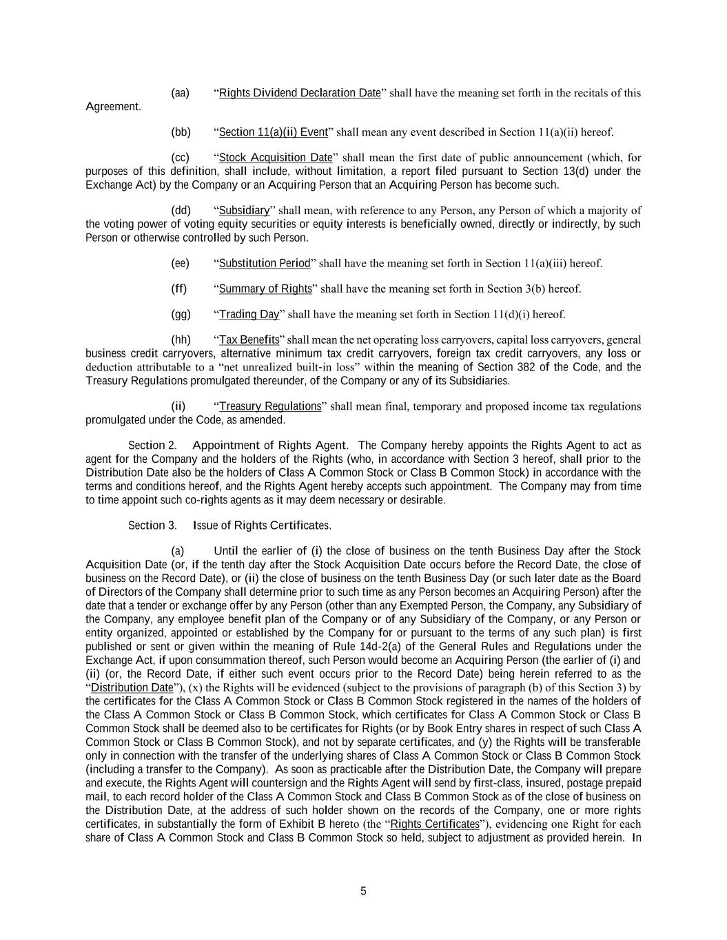 5 (aa) “Rights Dividend Declaration Date” shall have the meaning set forth in the recitals of this Agreement. (bb) “Section 11(a)(ii) Event” shall mean any event described in Section 11(a)(ii) hereof. (cc) “Stock Acquisition Date” shall mean the first date of public announcement (which, for purposes of this definition, shall include, without limitation, a report filed pursuant to Section 13(d) under the Exchange Act) by the Company or an Acquiring Person that an Acquiring Person has become such. (dd) “Subsidiary” shall mean, with reference to any Person, any Person of which a majority of the voting power of voting equity securities or equity interests is beneficially owned, directly or indirectly, by such Person or otherwise controlled by such Person. (ee) “Substitution Period” shall have the meaning set forth in Section 11(a)(iii) hereof. (ff) “Summary of Rights” shall have the meaning set forth in Section 3(b) hereof. (gg) “Trading Day” shall have the meaning set forth in Section 11(d)(i) hereof. (hh) “Tax Benefits” shall mean the net operating loss carryovers, capital loss carryovers, general business credit carryovers, alternative minimum tax credit carryovers, foreign tax credit carryovers, any loss or deduction attributable to a “net unrealized built-in loss” within the meaning of Section 382 of the Code, and the Treasury Regulations promulgated thereunder, of the Company or any of its Subsidiaries. (ii) “Treasury Regulations” shall mean final, temporary and proposed income tax regulations promulgated under the Code, as amended. Section 2. Appointment of Rights Agent. The Company hereby appoints the Rights Agent to act as agent for the Company and the holders of the Rights (who, in accordance with Section 3 hereof, shall prior to the Distribution Date also be the holders of Class A Common Stock or Class B Common Stock) in accordance with the terms and conditions hereof, and the Rights Agent hereby accepts such appointment. The Company may from time to time appoint such co-rights agents as it may deem necessary or desirable. Section 3. Issue of Rights Certificates. (a) Until the earlier of (i) the close of business on the tenth Business Day after the Stock Acquisition Date (or, if the tenth day after the Stock Acquisition Date occurs before the Record Date, the close of business on the Record Date), or (ii) the close of business on the tenth Business Day (or such later date as the Board of Directors of the Company shall determine prior to such time as any Person becomes an Acquiring Person) after the date that a tender or exchange offer by any Person (other than any Exempted Person, the Company, any Subsidiary of the Company, any employee benefit plan of the Company or of any Subsidiary of the Company, or any Person or entity organized, appointed or established by the Company for or pursuant to the terms of any such plan) is first published or sent or given within the meaning of Rule 14d-2(a) of the General Rules and Regulations under the Exchange Act, if upon consummation thereof, such Person would become an Acquiring Person (the earlier of (i) and (ii) (or, the Record Date, if either such event occurs prior to the Record Date) being herein referred to as the “Distribution Date”), (x) the Rights will be evidenced (subject to the provisions of paragraph (b) of this Section 3) by the certificates for the Class A Common Stock or Class B Common Stock registered in the names of the holders of the Class A Common Stock or Class B Common Stock, which certificates for Class A Common Stock or Class B Common Stock shall be deemed also to be certificates for Rights (or by Book Entry shares in respect of such Class A Common Stock or Class B Common Stock), and not by separate certificates, and (y) the Rights will be transferable only in connection with the transfer of the underlying shares of Class A Common Stock or Class B Common Stock (including a transfer to the Company). As soon as practicable after the Distribution Date, the Company will prepare and execute, the Rights Agent will countersign and the Rights Agent will send by first-class, insured, postage prepaid mail, to each record holder of the Class A Common Stock and Class B Common Stock as of the close of business on the Distribution Date, at the address of such holder shown on the records of the Company, one or more rights certificates, in substantially the form of Exhibit B hereto (the “Rights Certificates”), evidencing one Right for each share of Class A Common Stock and Class B Common Stock so held, subject to adjustment as provided herein. In