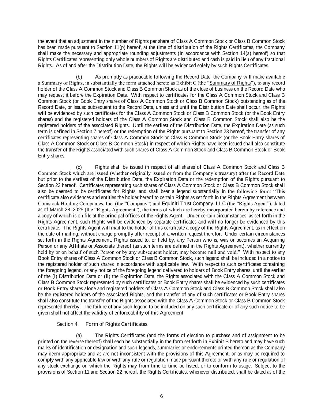 6 the event that an adjustment in the number of Rights per share of Class A Common Stock or Class B Common Stock has been made pursuant to Section 11(p) hereof, at the time of distribution of the Rights Certificates, the Company shall make the necessary and appropriate rounding adjustments (in accordance with Section 14(a) hereof) so that Rights Certificates representing only whole numbers of Rights are distributed and cash is paid in lieu of any fractional Rights. As of and after the Distribution Date, the Rights will be evidenced solely by such Rights Certificates. (b) As promptly as practicable following the Record Date, the Company will make available a Summary of Rights, in substantially the form attached hereto as Exhibit C (the “Summary of Rights”), to any record holder of the Class A Common Stock and Class B Common Stock as of the close of business on the Record Date who may request it before the Expiration Date. With respect to certificates for the Class A Common Stock and Class B Common Stock (or Book Entry shares of Class A Common Stock or Class B Common Stock) outstanding as of the Record Date, or issued subsequent to the Record Date, unless and until the Distribution Date shall occur, the Rights will be evidenced by such certificates for the Class A Common Stock or Class B Common Stock (or the Book Entry shares) and the registered holders of the Class A Common Stock and Class B Common Stock shall also be the registered holders of the associated Rights. Until the earliest of the Distribution Date, the Expiration Date (as such term is defined in Section 7 hereof) or the redemption of the Rights pursuant to Section 23 hereof, the transfer of any certificates representing shares of Class A Common Stock or Class B Common Stock (or the Book Entry shares of Class A Common Stock or Class B Common Stock) in respect of which Rights have been issued shall also constitute the transfer of the Rights associated with such shares of Class A Common Stock and Class B Common Stock or Book Entry shares. (c) Rights shall be issued in respect of all shares of Class A Common Stock and Class B Common Stock which are issued (whether originally issued or from the Company’s treasury) after the Record Date but prior to the earliest of the Distribution Date, the Expiration Date or the redemption of the Rights pursuant to Section 23 hereof. Certificates representing such shares of Class A Common Stock or Class B Common Stock shall also be deemed to be certificates for Rights, and shall bear a legend substantially in the following form: “This certificate also evidences and entitles the holder hereof to certain Rights as set forth in the Rights Agreement between Comstock Holding Companies, Inc. (the “Company”) and Equiniti Trust Company, LLC (the “Rights Agent”), dated as of March 28, 2025 (the “Rights Agreement”), the terms of which are hereby incorporated herein by reference and a copy of which is on file at the principal offices of the Rights Agent. Under certain circumstances, as set forth in the Rights Agreement, such Rights will be evidenced by separate certificates and will no longer be evidenced by this certificate. The Rights Agent will mail to the holder of this certificate a copy of the Rights Agreement, as in effect on the date of mailing, without charge promptly after receipt of a written request therefor. Under certain circumstances set forth in the Rights Agreement, Rights issued to, or held by, any Person who is, was or becomes an Acquiring Person or any Affiliate or Associate thereof (as such terms are defined in the Rights Agreement), whether currently held by or on behalf of such Person or by any subsequent holder, may become null and void.” With respect to any Book Entry shares of Class A Common Stock or Class B Common Stock, such legend shall be included in a notice to the registered holder of such shares in accordance with applicable law. With respect to such certificates containing the foregoing legend, or any notice of the foregoing legend delivered to holders of Book Entry shares, until the earlier of the (i) Distribution Date or (ii) the Expiration Date, the Rights associated with the Class A Common Stock and Class B Common Stock represented by such certificates or Book Entry shares shall be evidenced by such certificates or Book Entry shares alone and registered holders of Class A Common Stock and Class B Common Stock shall also be the registered holders of the associated Rights, and the transfer of any of such certificates or Book Entry shares shall also constitute the transfer of the Rights associated with the Class A Common Stock or Class B Common Stock represented thereby. The failure of any such legend to be included on any such certificate or of any such notice to be given shall not affect the validity of enforceability of this Agreement. Section 4. Form of Rights Certificates. (a) The Rights Certificates (and the forms of election to purchase and of assignment to be printed on the reverse thereof) shall each be substantially in the form set forth in Exhibit B hereto and may have such marks of identification or designation and such legends, summaries or endorsements printed thereon as the Company may deem appropriate and as are not inconsistent with the provisions of this Agreement, or as may be required to comply with any applicable law or with any rule or regulation made pursuant thereto or with any rule or regulation of any stock exchange on which the Rights may from time to time be listed, or to conform to usage. Subject to the provisions of Section 11 and Section 22 hereof, the Rights Certificates, whenever distributed, shall be dated as of the