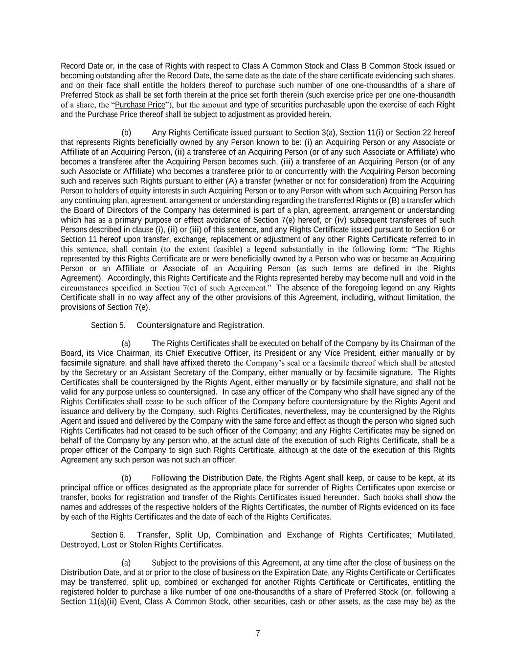 7 Record Date or, in the case of Rights with respect to Class A Common Stock and Class B Common Stock issued or becoming outstanding after the Record Date, the same date as the date of the share certificate evidencing such shares, and on their face shall entitle the holders thereof to purchase such number of one one-thousandths of a share of Preferred Stock as shall be set forth therein at the price set forth therein (such exercise price per one one-thousandth of a share, the “Purchase Price”), but the amount and type of securities purchasable upon the exercise of each Right and the Purchase Price thereof shall be subject to adjustment as provided herein. (b) Any Rights Certificate issued pursuant to Section 3(a), Section 11(i) or Section 22 hereof that represents Rights beneficially owned by any Person known to be: (i) an Acquiring Person or any Associate or Affiliate of an Acquiring Person, (ii) a transferee of an Acquiring Person (or of any such Associate or Affiliate) who becomes a transferee after the Acquiring Person becomes such, (iii) a transferee of an Acquiring Person (or of any such Associate or Affiliate) who becomes a transferee prior to or concurrently with the Acquiring Person becoming such and receives such Rights pursuant to either (A) a transfer (whether or not for consideration) from the Acquiring Person to holders of equity interests in such Acquiring Person or to any Person with whom such Acquiring Person has any continuing plan, agreement, arrangement or understanding regarding the transferred Rights or (B) a transfer which the Board of Directors of the Company has determined is part of a plan, agreement, arrangement or understanding which has as a primary purpose or effect avoidance of Section 7(e) hereof, or (iv) subsequent transferees of such Persons described in clause (i), (ii) or (iii) of this sentence, and any Rights Certificate issued pursuant to Section 6 or Section 11 hereof upon transfer, exchange, replacement or adjustment of any other Rights Certificate referred to in this sentence, shall contain (to the extent feasible) a legend substantially in the following form: “The Rights represented by this Rights Certificate are or were beneficially owned by a Person who was or became an Acquiring Person or an Affiliate or Associate of an Acquiring Person (as such terms are defined in the Rights Agreement). Accordingly, this Rights Certificate and the Rights represented hereby may become null and void in the circumstances specified in Section 7(e) of such Agreement.” The absence of the foregoing legend on any Rights Certificate shall in no way affect any of the other provisions of this Agreement, including, without limitation, the provisions of Section 7(e). Section 5. Countersignature and Registration. (a) The Rights Certificates shall be executed on behalf of the Company by its Chairman of the Board, its Vice Chairman, its Chief Executive Officer, its President or any Vice President, either manually or by facsimile signature, and shall have affixed thereto the Company’s seal or a facsimile thereof which shall be attested by the Secretary or an Assistant Secretary of the Company, either manually or by facsimile signature. The Rights Certificates shall be countersigned by the Rights Agent, either manually or by facsimile signature, and shall not be valid for any purpose unless so countersigned. In case any officer of the Company who shall have signed any of the Rights Certificates shall cease to be such officer of the Company before countersignature by the Rights Agent and issuance and delivery by the Company, such Rights Certificates, nevertheless, may be countersigned by the Rights Agent and issued and delivered by the Company with the same force and effect as though the person who signed such Rights Certificates had not ceased to be such officer of the Company; and any Rights Certificates may be signed on behalf of the Company by any person who, at the actual date of the execution of such Rights Certificate, shall be a proper officer of the Company to sign such Rights Certificate, although at the date of the execution of this Rights Agreement any such person was not such an officer. (b) Following the Distribution Date, the Rights Agent shall keep, or cause to be kept, at its principal office or offices designated as the appropriate place for surrender of Rights Certificates upon exercise or transfer, books for registration and transfer of the Rights Certificates issued hereunder. Such books shall show the names and addresses of the respective holders of the Rights Certificates, the number of Rights evidenced on its face by each of the Rights Certificates and the date of each of the Rights Certificates. Section 6. Transfer, Split Up, Combination and Exchange of Rights Certificates; Mutilated, Destroyed, Lost or Stolen Rights Certificates. (a) Subject to the provisions of this Agreement, at any time after the close of business on the Distribution Date, and at or prior to the close of business on the Expiration Date, any Rights Certificate or Certificates may be transferred, split up, combined or exchanged for another Rights Certificate or Certificates, entitling the registered holder to purchase a like number of one one-thousandths of a share of Preferred Stock (or, following a Section 11(a)(ii) Event, Class A Common Stock, other securities, cash or other assets, as the case may be) as the