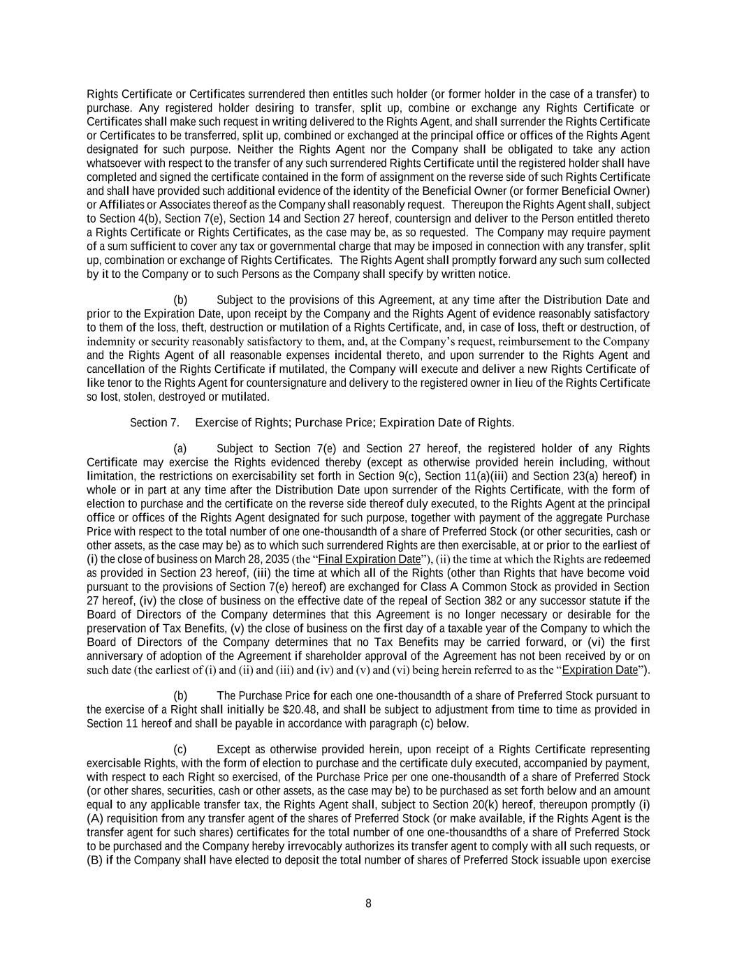 8 Rights Certificate or Certificates surrendered then entitles such holder (or former holder in the case of a transfer) to purchase. Any registered holder desiring to transfer, split up, combine or exchange any Rights Certificate or Certificates shall make such request in writing delivered to the Rights Agent, and shall surrender the Rights Certificate or Certificates to be transferred, split up, combined or exchanged at the principal office or offices of the Rights Agent designated for such purpose. Neither the Rights Agent nor the Company shall be obligated to take any action whatsoever with respect to the transfer of any such surrendered Rights Certificate until the registered holder shall have completed and signed the certificate contained in the form of assignment on the reverse side of such Rights Certificate and shall have provided such additional evidence of the identity of the Beneficial Owner (or former Beneficial Owner) or Affiliates or Associates thereof as the Company shall reasonably request. Thereupon the Rights Agent shall, subject to Section 4(b), Section 7(e), Section 14 and Section 27 hereof, countersign and deliver to the Person entitled thereto a Rights Certificate or Rights Certificates, as the case may be, as so requested. The Company may require payment of a sum sufficient to cover any tax or governmental charge that may be imposed in connection with any transfer, split up, combination or exchange of Rights Certificates. The Rights Agent shall promptly forward any such sum collected by it to the Company or to such Persons as the Company shall specify by written notice. (b) Subject to the provisions of this Agreement, at any time after the Distribution Date and prior to the Expiration Date, upon receipt by the Company and the Rights Agent of evidence reasonably satisfactory to them of the loss, theft, destruction or mutilation of a Rights Certificate, and, in case of loss, theft or destruction, of indemnity or security reasonably satisfactory to them, and, at the Company’s request, reimbursement to the Company and the Rights Agent of all reasonable expenses incidental thereto, and upon surrender to the Rights Agent and cancellation of the Rights Certificate if mutilated, the Company will execute and deliver a new Rights Certificate of like tenor to the Rights Agent for countersignature and delivery to the registered owner in lieu of the Rights Certificate so lost, stolen, destroyed or mutilated. Section 7. Exercise of Rights; Purchase Price; Expiration Date of Rights. (a) Subject to Section 7(e) and Section 27 hereof, the registered holder of any Rights Certificate may exercise the Rights evidenced thereby (except as otherwise provided herein including, without limitation, the restrictions on exercisability set forth in Section 9(c), Section 11(a)(iii) and Section 23(a) hereof) in whole or in part at any time after the Distribution Date upon surrender of the Rights Certificate, with the form of election to purchase and the certificate on the reverse side thereof duly executed, to the Rights Agent at the principal office or offices of the Rights Agent designated for such purpose, together with payment of the aggregate Purchase Price with respect to the total number of one one-thousandth of a share of Preferred Stock (or other securities, cash or other assets, as the case may be) as to which such surrendered Rights are then exercisable, at or prior to the earliest of (i) the close of business on March 28, 2035 (the “Final Expiration Date”), (ii) the time at which the Rights are redeemed as provided in Section 23 hereof, (iii) the time at which all of the Rights (other than Rights that have become void pursuant to the provisions of Section 7(e) hereof) are exchanged for Class A Common Stock as provided in Section 27 hereof, (iv) the close of business on the effective date of the repeal of Section 382 or any successor statute if the Board of Directors of the Company determines that this Agreement is no longer necessary or desirable for the preservation of Tax Benefits, (v) the close of business on the first day of a taxable year of the Company to which the Board of Directors of the Company determines that no Tax Benefits may be carried forward, or (vi) the first anniversary of adoption of the Agreement if shareholder approval of the Agreement has not been received by or on such date (the earliest of (i) and (ii) and (iii) and (iv) and (v) and (vi) being herein referred to as the “Expiration Date”). (b) The Purchase Price for each one one-thousandth of a share of Preferred Stock pursuant to the exercise of a Right shall initially be $20.48, and shall be subject to adjustment from time to time as provided in Section 11 hereof and shall be payable in accordance with paragraph (c) below. (c) Except as otherwise provided herein, upon receipt of a Rights Certificate representing exercisable Rights, with the form of election to purchase and the certificate duly executed, accompanied by payment, with respect to each Right so exercised, of the Purchase Price per one one-thousandth of a share of Preferred Stock (or other shares, securities, cash or other assets, as the case may be) to be purchased as set forth below and an amount equal to any applicable transfer tax, the Rights Agent shall, subject to Section 20(k) hereof, thereupon promptly (i) (A) requisition from any transfer agent of the shares of Preferred Stock (or make available, if the Rights Agent is the transfer agent for such shares) certificates for the total number of one one-thousandths of a share of Preferred Stock to be purchased and the Company hereby irrevocably authorizes its transfer agent to comply with all such requests, or (B) if the Company shall have elected to deposit the total number of shares of Preferred Stock issuable upon exercise