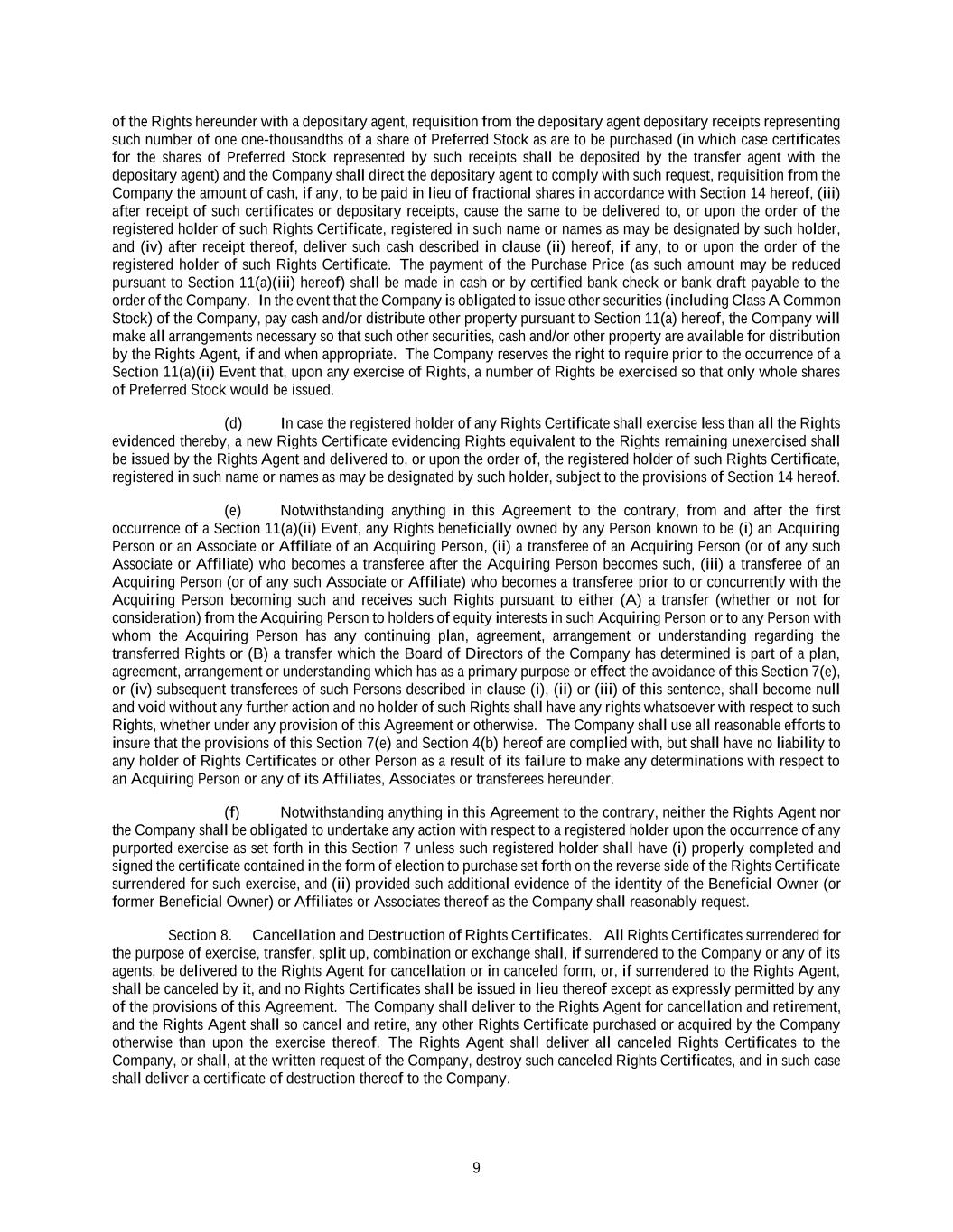 9 of the Rights hereunder with a depositary agent, requisition from the depositary agent depositary receipts representing such number of one one-thousandths of a share of Preferred Stock as are to be purchased (in which case certificates for the shares of Preferred Stock represented by such receipts shall be deposited by the transfer agent with the depositary agent) and the Company shall direct the depositary agent to comply with such request, requisition from the Company the amount of cash, if any, to be paid in lieu of fractional shares in accordance with Section 14 hereof, (iii) after receipt of such certificates or depositary receipts, cause the same to be delivered to, or upon the order of the registered holder of such Rights Certificate, registered in such name or names as may be designated by such holder, and (iv) after receipt thereof, deliver such cash described in clause (ii) hereof, if any, to or upon the order of the registered holder of such Rights Certificate. The payment of the Purchase Price (as such amount may be reduced pursuant to Section 11(a)(iii) hereof) shall be made in cash or by certified bank check or bank draft payable to the order of the Company. In the event that the Company is obligated to issue other securities (including Class A Common Stock) of the Company, pay cash and/or distribute other property pursuant to Section 11(a) hereof, the Company will make all arrangements necessary so that such other securities, cash and/or other property are available for distribution by the Rights Agent, if and when appropriate. The Company reserves the right to require prior to the occurrence of a Section 11(a)(ii) Event that, upon any exercise of Rights, a number of Rights be exercised so that only whole shares of Preferred Stock would be issued. (d) In case the registered holder of any Rights Certificate shall exercise less than all the Rights evidenced thereby, a new Rights Certificate evidencing Rights equivalent to the Rights remaining unexercised shall be issued by the Rights Agent and delivered to, or upon the order of, the registered holder of such Rights Certificate, registered in such name or names as may be designated by such holder, subject to the provisions of Section 14 hereof. (e) Notwithstanding anything in this Agreement to the contrary, from and after the first occurrence of a Section 11(a)(ii) Event, any Rights beneficially owned by any Person known to be (i) an Acquiring Person or an Associate or Affiliate of an Acquiring Person, (ii) a transferee of an Acquiring Person (or of any such Associate or Affiliate) who becomes a transferee after the Acquiring Person becomes such, (iii) a transferee of an Acquiring Person (or of any such Associate or Affiliate) who becomes a transferee prior to or concurrently with the Acquiring Person becoming such and receives such Rights pursuant to either (A) a transfer (whether or not for consideration) from the Acquiring Person to holders of equity interests in such Acquiring Person or to any Person with whom the Acquiring Person has any continuing plan, agreement, arrangement or understanding regarding the transferred Rights or (B) a transfer which the Board of Directors of the Company has determined is part of a plan, agreement, arrangement or understanding which has as a primary purpose or effect the avoidance of this Section 7(e), or (iv) subsequent transferees of such Persons described in clause (i), (ii) or (iii) of this sentence, shall become null and void without any further action and no holder of such Rights shall have any rights whatsoever with respect to such Rights, whether under any provision of this Agreement or otherwise. The Company shall use all reasonable efforts to insure that the provisions of this Section 7(e) and Section 4(b) hereof are complied with, but shall have no liability to any holder of Rights Certificates or other Person as a result of its failure to make any determinations with respect to an Acquiring Person or any of its Affiliates, Associates or transferees hereunder. (f) Notwithstanding anything in this Agreement to the contrary, neither the Rights Agent nor the Company shall be obligated to undertake any action with respect to a registered holder upon the occurrence of any purported exercise as set forth in this Section 7 unless such registered holder shall have (i) properly completed and signed the certificate contained in the form of election to purchase set forth on the reverse side of the Rights Certificate surrendered for such exercise, and (ii) provided such additional evidence of the identity of the Beneficial Owner (or former Beneficial Owner) or Affiliates or Associates thereof as the Company shall reasonably request. Section 8. Cancellation and Destruction of Rights Certificates. All Rights Certificates surrendered for the purpose of exercise, transfer, split up, combination or exchange shall, if surrendered to the Company or any of its agents, be delivered to the Rights Agent for cancellation or in canceled form, or, if surrendered to the Rights Agent, shall be canceled by it, and no Rights Certificates shall be issued in lieu thereof except as expressly permitted by any of the provisions of this Agreement. The Company shall deliver to the Rights Agent for cancellation and retirement, and the Rights Agent shall so cancel and retire, any other Rights Certificate purchased or acquired by the Company otherwise than upon the exercise thereof. The Rights Agent shall deliver all canceled Rights Certificates to the Company, or shall, at the written request of the Company, destroy such canceled Rights Certificates, and in such case shall deliver a certificate of destruction thereof to the Company.