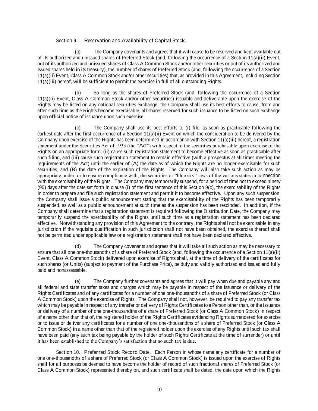 10 Section 9. Reservation and Availability of Capital Stock. (a) The Company covenants and agrees that it will cause to be reserved and kept available out of its authorized and unissued shares of Preferred Stock (and, following the occurrence of a Section 11(a)(ii) Event, out of its authorized and unissued shares of Class A Common Stock and/or other securities or out of its authorized and issued shares held in its treasury), the number of shares of Preferred Stock (and, following the occurrence of a Section 11(a)(ii) Event, Class A Common Stock and/or other securities) that, as provided in this Agreement, including Section 11(a)(iii) hereof, will be sufficient to permit the exercise in full of all outstanding Rights. (b) So long as the shares of Preferred Stock (and, following the occurrence of a Section 11(a)(ii) Event, Class A Common Stock and/or other securities) issuable and deliverable upon the exercise of the Rights may be listed on any national securities exchange, the Company shall use its best efforts to cause, from and after such time as the Rights become exercisable, all shares reserved for such issuance to be listed on such exchange upon official notice of issuance upon such exercise. (c) The Company shall use its best efforts to (i) file, as soon as practicable following the earliest date after the first occurrence of a Section 11(a)(ii) Event on which the consideration to be delivered by the Company upon exercise of the Rights has been determined in accordance with Section 11(a)(iii) hereof, a registration statement under the Securities Act of 1933 (the “Act”) with respect to the securities purchasable upon exercise of the Rights on an appropriate form, (ii) cause such registration statement to become effective as soon as practicable after such filing, and (iii) cause such registration statement to remain effective (with a prospectus at all times meeting the requirements of the Act) until the earlier of (A) the date as of which the Rights are no longer exercisable for such securities, and (B) the date of the expiration of the Rights. The Company will also take such action as may be appropriate under, or to ensure compliance with, the securities or “blue sky” laws of the various states in connection with the exercisability of the Rights. The Company may temporarily suspend, for a period of time not to exceed ninety (90) days after the date set forth in clause (i) of the first sentence of this Section 9(c), the exercisability of the Rights in order to prepare and file such registration statement and permit it to become effective. Upon any such suspension, the Company shall issue a public announcement stating that the exercisability of the Rights has been temporarily suspended, as well as a public announcement at such time as the suspension has been rescinded. In addition, if the Company shall determine that a registration statement is required following the Distribution Date, the Company may temporarily suspend the exercisability of the Rights until such time as a registration statement has been declared effective. Notwithstanding any provision of this Agreement to the contrary, the Rights shall not be exercisable in any jurisdiction if the requisite qualification in such jurisdiction shall not have been obtained, the exercise thereof shall not be permitted under applicable law or a registration statement shall not have been declared effective. (d) The Company covenants and agrees that it will take all such action as may be necessary to ensure that all one one-thousandths of a share of Preferred Stock (and, following the occurrence of a Section 11(a)(ii) Event, Class A Common Stock) delivered upon exercise of Rights shall, at the time of delivery of the certificates for such shares (or Units) (subject to payment of the Purchase Price), be duly and validly authorized and issued and fully paid and nonassessable. (e) The Company further covenants and agrees that it will pay when due and payable any and all federal and state transfer taxes and charges which may be payable in respect of the issuance or delivery of the Rights Certificates and of any certificates for a number of one one-thousandths of a share of Preferred Stock (or Class A Common Stock) upon the exercise of Rights. The Company shall not, however, be required to pay any transfer tax which may be payable in respect of any transfer or delivery of Rights Certificates to a Person other than, or the issuance or delivery of a number of one one-thousandths of a share of Preferred Stock (or Class A Common Stock) in respect of a name other than that of, the registered holder of the Rights Certificates evidencing Rights surrendered for exercise or to issue or deliver any certificates for a number of one one-thousandths of a share of Preferred Stock (or Class A Common Stock) in a name other than that of the registered holder upon the exercise of any Rights until such tax shall have been paid (any such tax being payable by the holder of such Rights Certificate at the time of surrender) or until it has been established to the Company’s satisfaction that no such tax is due. Section 10. Preferred Stock Record Date. Each Person in whose name any certificate for a number of one one-thousandths of a share of Preferred Stock (or Class A Common Stock) is issued upon the exercise of Rights shall for all purposes be deemed to have become the holder of record of such fractional shares of Preferred Stock (or Class A Common Stock) represented thereby on, and such certificate shall be dated, the date upon which the Rights