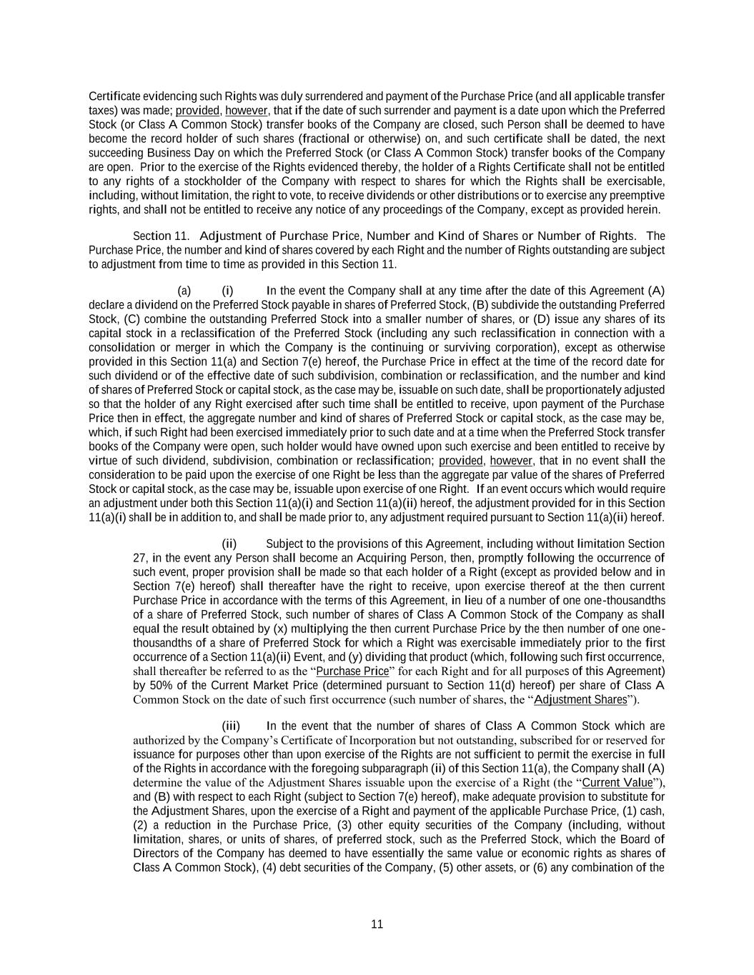 11 Certificate evidencing such Rights was duly surrendered and payment of the Purchase Price (and all applicable transfer taxes) was made; provided, however, that if the date of such surrender and payment is a date upon which the Preferred Stock (or Class A Common Stock) transfer books of the Company are closed, such Person shall be deemed to have become the record holder of such shares (fractional or otherwise) on, and such certificate shall be dated, the next succeeding Business Day on which the Preferred Stock (or Class A Common Stock) transfer books of the Company are open. Prior to the exercise of the Rights evidenced thereby, the holder of a Rights Certificate shall not be entitled to any rights of a stockholder of the Company with respect to shares for which the Rights shall be exercisable, including, without limitation, the right to vote, to receive dividends or other distributions or to exercise any preemptive rights, and shall not be entitled to receive any notice of any proceedings of the Company, except as provided herein. Section 11. Adjustment of Purchase Price, Number and Kind of Shares or Number of Rights. The Purchase Price, the number and kind of shares covered by each Right and the number of Rights outstanding are subject to adjustment from time to time as provided in this Section 11. (a) (i) In the event the Company shall at any time after the date of this Agreement (A) declare a dividend on the Preferred Stock payable in shares of Preferred Stock, (B) subdivide the outstanding Preferred Stock, (C) combine the outstanding Preferred Stock into a smaller number of shares, or (D) issue any shares of its capital stock in a reclassification of the Preferred Stock (including any such reclassification in connection with a consolidation or merger in which the Company is the continuing or surviving corporation), except as otherwise provided in this Section 11(a) and Section 7(e) hereof, the Purchase Price in effect at the time of the record date for such dividend or of the effective date of such subdivision, combination or reclassification, and the number and kind of shares of Preferred Stock or capital stock, as the case may be, issuable on such date, shall be proportionately adjusted so that the holder of any Right exercised after such time shall be entitled to receive, upon payment of the Purchase Price then in effect, the aggregate number and kind of shares of Preferred Stock or capital stock, as the case may be, which, if such Right had been exercised immediately prior to such date and at a time when the Preferred Stock transfer books of the Company were open, such holder would have owned upon such exercise and been entitled to receive by virtue of such dividend, subdivision, combination or reclassification; provided, however, that in no event shall the consideration to be paid upon the exercise of one Right be less than the aggregate par value of the shares of Preferred Stock or capital stock, as the case may be, issuable upon exercise of one Right. If an event occurs which would require an adjustment under both this Section 11(a)(i) and Section 11(a)(ii) hereof, the adjustment provided for in this Section 11(a)(i) shall be in addition to, and shall be made prior to, any adjustment required pursuant to Section 11(a)(ii) hereof. (ii) Subject to the provisions of this Agreement, including without limitation Section 27, in the event any Person shall become an Acquiring Person, then, promptly following the occurrence of such event, proper provision shall be made so that each holder of a Right (except as provided below and in Section 7(e) hereof) shall thereafter have the right to receive, upon exercise thereof at the then current Purchase Price in accordance with the terms of this Agreement, in lieu of a number of one one-thousandths of a share of Preferred Stock, such number of shares of Class A Common Stock of the Company as shall equal the result obtained by (x) multiplying the then current Purchase Price by the then number of one one- thousandths of a share of Preferred Stock for which a Right was exercisable immediately prior to the first occurrence of a Section 11(a)(ii) Event, and (y) dividing that product (which, following such first occurrence, shall thereafter be referred to as the “Purchase Price” for each Right and for all purposes of this Agreement) by 50% of the Current Market Price (determined pursuant to Section 11(d) hereof) per share of Class A Common Stock on the date of such first occurrence (such number of shares, the “Adjustment Shares”). (iii) In the event that the number of shares of Class A Common Stock which are authorized by the Company’s Certificate of Incorporation but not outstanding, subscribed for or reserved for issuance for purposes other than upon exercise of the Rights are not sufficient to permit the exercise in full of the Rights in accordance with the foregoing subparagraph (ii) of this Section 11(a), the Company shall (A) determine the value of the Adjustment Shares issuable upon the exercise of a Right (the “Current Value”), and (B) with respect to each Right (subject to Section 7(e) hereof), make adequate provision to substitute for the Adjustment Shares, upon the exercise of a Right and payment of the applicable Purchase Price, (1) cash, (2) a reduction in the Purchase Price, (3) other equity securities of the Company (including, without limitation, shares, or units of shares, of preferred stock, such as the Preferred Stock, which the Board of Directors of the Company has deemed to have essentially the same value or economic rights as shares of Class A Common Stock), (4) debt securities of the Company, (5) other assets, or (6) any combination of the
