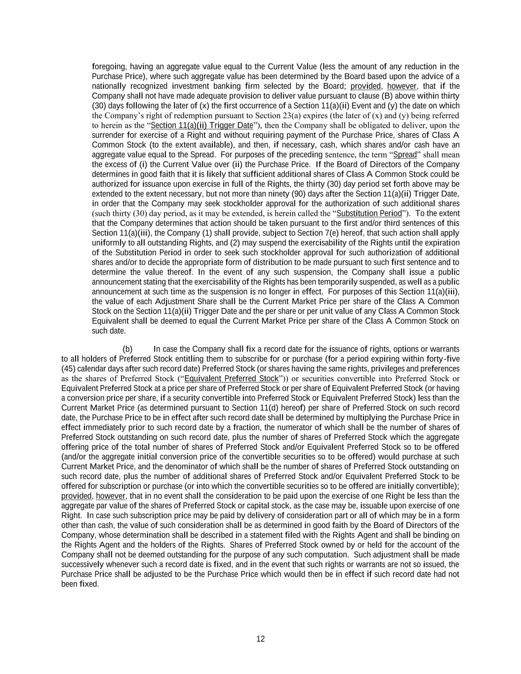 12 foregoing, having an aggregate value equal to the Current Value (less the amount of any reduction in the Purchase Price), where such aggregate value has been determined by the Board based upon the advice of a nationally recognized investment banking firm selected by the Board; provided, however, that if the Company shall not have made adequate provision to deliver value pursuant to clause (B) above within thirty (30) days following the later of (x) the first occurrence of a Section 11(a)(ii) Event and (y) the date on which the Company’s right of redemption pursuant to Section 23(a) expires (the later of (x) and (y) being referred to herein as the “Section 11(a)(ii) Trigger Date”), then the Company shall be obligated to deliver, upon the surrender for exercise of a Right and without requiring payment of the Purchase Price, shares of Class A Common Stock (to the extent available), and then, if necessary, cash, which shares and/or cash have an aggregate value equal to the Spread. For purposes of the preceding sentence, the term “Spread” shall mean the excess of (i) the Current Value over (ii) the Purchase Price. If the Board of Directors of the Company determines in good faith that it is likely that sufficient additional shares of Class A Common Stock could be authorized for issuance upon exercise in full of the Rights, the thirty (30) day period set forth above may be extended to the extent necessary, but not more than ninety (90) days after the Section 11(a)(ii) Trigger Date, in order that the Company may seek stockholder approval for the authorization of such additional shares (such thirty (30) day period, as it may be extended, is herein called the “Substitution Period”). To the extent that the Company determines that action should be taken pursuant to the first and/or third sentences of this Section 11(a)(iii), the Company (1) shall provide, subject to Section 7(e) hereof, that such action shall apply uniformly to all outstanding Rights, and (2) may suspend the exercisability of the Rights until the expiration of the Substitution Period in order to seek such stockholder approval for such authorization of additional shares and/or to decide the appropriate form of distribution to be made pursuant to such first sentence and to determine the value thereof. In the event of any such suspension, the Company shall issue a public announcement stating that the exercisability of the Rights has been temporarily suspended, as well as a public announcement at such time as the suspension is no longer in effect. For purposes of this Section 11(a)(iii), the value of each Adjustment Share shall be the Current Market Price per share of the Class A Common Stock on the Section 11(a)(ii) Trigger Date and the per share or per unit value of any Class A Common Stock Equivalent shall be deemed to equal the Current Market Price per share of the Class A Common Stock on such date. (b) In case the Company shall fix a record date for the issuance of rights, options or warrants to all holders of Preferred Stock entitling them to subscribe for or purchase (for a period expiring within forty-five (45) calendar days after such record date) Preferred Stock (or shares having the same rights, privileges and preferences as the shares of Preferred Stock (“Equivalent Preferred Stock”)) or securities convertible into Preferred Stock or Equivalent Preferred Stock at a price per share of Preferred Stock or per share of Equivalent Preferred Stock (or having a conversion price per share, if a security convertible into Preferred Stock or Equivalent Preferred Stock) less than the Current Market Price (as determined pursuant to Section 11(d) hereof) per share of Preferred Stock on such record date, the Purchase Price to be in effect after such record date shall be determined by multiplying the Purchase Price in effect immediately prior to such record date by a fraction, the numerator of which shall be the number of shares of Preferred Stock outstanding on such record date, plus the number of shares of Preferred Stock which the aggregate offering price of the total number of shares of Preferred Stock and/or Equivalent Preferred Stock so to be offered (and/or the aggregate initial conversion price of the convertible securities so to be offered) would purchase at such Current Market Price, and the denominator of which shall be the number of shares of Preferred Stock outstanding on such record date, plus the number of additional shares of Preferred Stock and/or Equivalent Preferred Stock to be offered for subscription or purchase (or into which the convertible securities so to be offered are initially convertible); provided, however, that in no event shall the consideration to be paid upon the exercise of one Right be less than the aggregate par value of the shares of Preferred Stock or capital stock, as the case may be, issuable upon exercise of one Right. In case such subscription price may be paid by delivery of consideration part or all of which may be in a form other than cash, the value of such consideration shall be as determined in good faith by the Board of Directors of the Company, whose determination shall be described in a statement filed with the Rights Agent and shall be binding on the Rights Agent and the holders of the Rights. Shares of Preferred Stock owned by or held for the account of the Company shall not be deemed outstanding for the purpose of any such computation. Such adjustment shall be made successively whenever such a record date is fixed, and in the event that such rights or warrants are not so issued, the Purchase Price shall be adjusted to be the Purchase Price which would then be in effect if such record date had not been fixed.