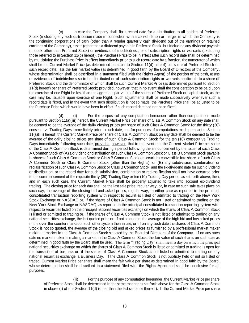 13 (c) In case the Company shall fix a record date for a distribution to all holders of Preferred Stock (including any such distribution made in connection with a consolidation or merger in which the Company is the continuing corporation) of cash (other than a regular quarterly cash dividend out of the earnings or retained earnings of the Company), assets (other than a dividend payable in Preferred Stock, but including any dividend payable in stock other than Preferred Stock) or evidences of indebtedness, or of subscription rights or warrants (excluding those referred to in Section 11(b) hereof), the Purchase Price to be in effect after such record date shall be determined by multiplying the Purchase Price in effect immediately prior to such record date by a fraction, the numerator of which shall be the Current Market Price (as determined pursuant to Section 11(d) hereof) per share of Preferred Stock on such record date, less the fair market value (as determined in good faith by the Board of Directors of the Company, whose determination shall be described in a statement filed with the Rights Agent) of the portion of the cash, assets or evidences of indebtedness so to be distributed or of such subscription rights or warrants applicable to a share of Preferred Stock and the denominator of which shall be such Current Market Price (as determined pursuant to Section 11(d) hereof) per share of Preferred Stock; provided, however, that in no event shall the consideration to be paid upon the exercise of one Right be less than the aggregate par value of the shares of Preferred Stock or capital stock, as the case may be, issuable upon exercise of one Right. Such adjustments shall be made successively whenever such a record date is fixed, and in the event that such distribution is not so made, the Purchase Price shall be adjusted to be the Purchase Price which would have been in effect if such record date had not been fixed. (d) (i) For the purpose of any computation hereunder, other than computations made pursuant to Section 11(a)(iii) hereof, the Current Market Price per share of Class A Common Stock on any date shall be deemed to be the average of the daily closing prices per share of such Class A Common Stock for the thirty (30) consecutive Trading Days immediately prior to such date, and for purposes of computations made pursuant to Section 11(a)(iii) hereof, the Current Market Price per share of Class A Common Stock on any date shall be deemed to be the average of the daily closing prices per share of such Class A Common Stock for the ten (10) consecutive Trading Days immediately following such date; provided, however, that in the event that the Current Market Price per share of the Class A Common Stock is determined during a period following the announcement by the issuer of such Class A Common Stock of (A) a dividend or distribution on such Class A Common Stock or Class B Common Stock payable in shares of such Class A Common Stock or Class B Common Stock or securities convertible into shares of such Class A Common Stock or Class B Common Stock (other than the Rights), or (B) any subdivision, combination or reclassification of such Class A Common Stock or Class B Common Stock, and the ex-dividend date for such dividend or distribution, or the record date for such subdivision, combination or reclassification shall not have occurred prior to the commencement of the requisite thirty (30) Trading Day or ten (10) Trading Day period, as set forth above, then, and in each such case, the Current Market Price shall be properly adjusted to take into account ex-dividend trading. The closing price for each day shall be the last sale price, regular way, or, in case no such sale takes place on such day, the average of the closing bid and asked prices, regular way, in either case as reported in the principal consolidated transaction reporting system with respect to securities listed or admitted to trading on the New York Stock Exchange or NASDAQ or, if the shares of Class A Common Stock is not listed or admitted to trading on the New York Stock Exchange or NASDAQ, as reported in the principal consolidated transaction reporting system with respect to securities listed on the principal national securities exchange on which the shares of Class A Common Stock is listed or admitted to trading or, if the shares of Class A Common Stock is not listed or admitted to trading on any national securities exchange, the last quoted price or, if not so quoted, the average of the high bid and low asked prices in the over-the-counter market or such other system then in use, or, if on any such date the shares of Class A Common Stock is not so quoted, the average of the closing bid and asked prices as furnished by a professional market maker making a market in the Class A Common Stock selected by the Board of Directors of the Company. If on any such date no market maker is making a market in the Class A Common Stock, the fair value of such shares on such date as determined in good faith by the Board shall be used. The term “Trading Day” shall mean a day on which the principal national securities exchange on which the shares of Class A Common Stock is listed or admitted to trading is open for the transaction of business or, if the shares of Class A Common Stock is not listed or admitted to trading on any national securities exchange, a Business Day. If the Class A Common Stock is not publicly held or not so listed or traded, Current Market Price per share shall mean the fair value per share as determined in good faith by the Board, whose determination shall be described in a statement filed with the Rights Agent and shall be conclusive for all purposes. (ii) For the purpose of any computation hereunder, the Current Market Price per share of Preferred Stock shall be determined in the same manner as set forth above for the Class A Common Stock in clause (i) of this Section 11(d) (other than the last sentence thereof). If the 