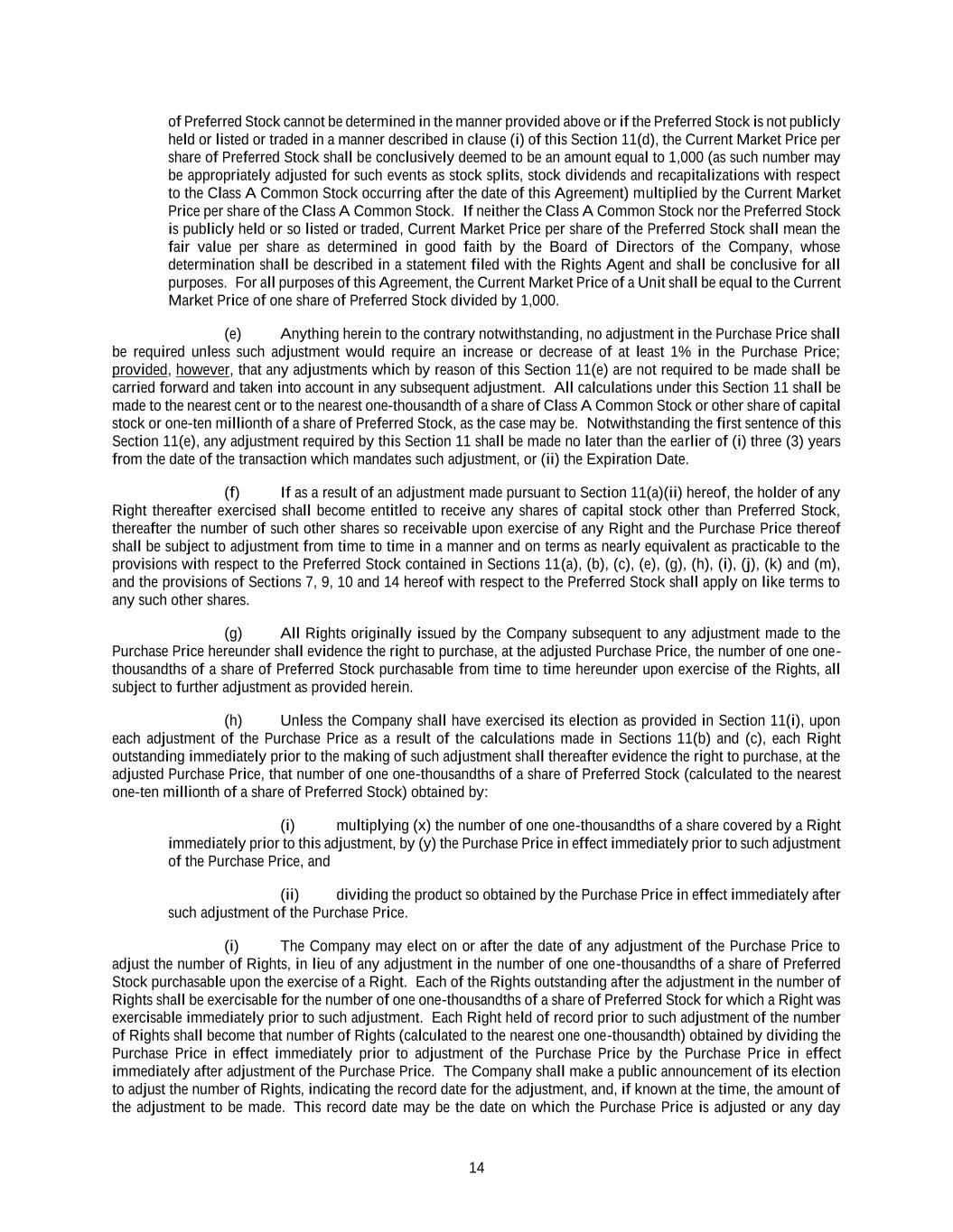 14 of Preferred Stock cannot be determined in the manner provided above or if the Preferred Stock is not publicly held or listed or traded in a manner described in clause (i) of this Section 11(d), the Current Market Price per share of Preferred Stock shall be conclusively deemed to be an amount equal to 1,000 (as such number may be appropriately adjusted for such events as stock splits, stock dividends and recapitalizations with respect to the Class A Common Stock occurring after the date of this Agreement) multiplied by the Current Market Price per share of the Class A Common Stock. If neither the Class A Common Stock nor the Preferred Stock is publicly held or so listed or traded, Current Market Price per share of the Preferred Stock shall mean the fair value per share as determined in good faith by the Board of Directors of the Company, whose determination shall be described in a statement filed with the Rights Agent and shall be conclusive for all purposes. For all purposes of this Agreement, the Current Market Price of a Unit shall be equal to the Current Market Price of one share of Preferred Stock divided by 1,000. (e) Anything herein to the contrary notwithstanding, no adjustment in the Purchase Price shall be required unless such adjustment would require an increase or decrease of at least 1% in the Purchase Price; provided, however, that any adjustments which by reason of this Section 11(e) are not required to be made shall be carried forward and taken into account in any subsequent adjustment. All calculations under this Section 11 shall be made to the nearest cent or to the nearest one-thousandth of a share of Class A Common Stock or other share of capital stock or one-ten millionth of a share of Preferred Stock, as the case may be. Notwithstanding the first sentence of this Section 11(e), any adjustment required by this Section 11 shall be made no later than the earlier of (i) three (3) years from the date of the transaction which mandates such adjustment, or (ii) the Expiration Date. (f) If as a result of an adjustment made pursuant to Section 11(a)(ii) hereof, the holder of any Right thereafter exercised shall become entitled to receive any shares of capital stock other than Preferred Stock, thereafter the number of such other shares so receivable upon exercise of any Right and the Purchase Price thereof shall be subject to adjustment from time to time in a manner and on terms as nearly equivalent as practicable to the provisions with respect to the Preferred Stock contained in Sections 11(a), (b), (c), (e), (g), (h), (i), (j), (k) and (m), and the provisions of Sections 7, 9, 10 and 14 hereof with respect to the Preferred Stock shall apply on like terms to any such other shares. (g) All Rights originally issued by the Company subsequent to any adjustment made to the Purchase Price hereunder shall evidence the right to purchase, at the adjusted Purchase Price, the number of one one- thousandths of a share of Preferred Stock purchasable from time to time hereunder upon exercise of the Rights, all subject to further adjustment as provided herein. (h) Unless the Company shall have exercised its election as provided in Section 11(i), upon each adjustment of the Purchase Price as a result of the calculations made in Sections 11(b) and (c), each Right outstanding immediately prior to the making of such adjustment shall thereafter evidence the right to purchase, at the adjusted Purchase Price, that number of one one-thousandths of a share of Preferred Stock (calculated to the nearest one-ten millionth of a share of Preferred Stock) obtained by: (i) multiplying (x) the number of one one-thousandths of a share covered by a Right immediately prior to this adjustment, by (y) the Purchase Price in effect immediately prior to such adjustment of the Purchase Price, and (ii) dividing the product so obtained by the Purchase Price in effect immediately after such adjustment of the Purchase Price. (i) The Company may elect on or after the date of any adjustment of the Purchase Price to adjust the number of Rights, in lieu of any adjustment in the number of one one-thousandths of a share of Preferred Stock purchasable upon the exercise of a Right. Each of the Rights outstanding after the adjustment in the number of Rights shall be exercisable for the number of one one-thousandths of a share of Preferred Stock for which a Right was exercisable immediately prior to such adjustment. Each Right held of record prior to such adjustment of the number of Rights shall become that number of Rights (calculated to the nearest one one-thousandth) obtained by dividing the Purchase Price in effect immediately prior to adjustment of the Purchase Price by the Purchase Price in effect immediately after adjustment of the Purchase Price. The Company shall make a public announcement of its election to adjust the number of Rights, indicating the record date for the adjustment, and, if known at the time, the amount of the adjustment to be made. This record date may be the date on which the Purchase Price is adjusted or any day