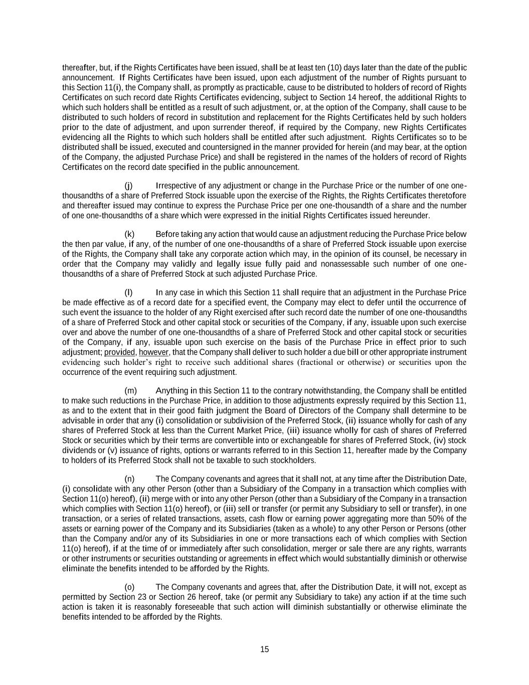15 thereafter, but, if the Rights Certificates have been issued, shall be at least ten (10) days later than the date of the public announcement. If Rights Certificates have been issued, upon each adjustment of the number of Rights pursuant to this Section 11(i), the Company shall, as promptly as practicable, cause to be distributed to holders of record of Rights Certificates on such record date Rights Certificates evidencing, subject to Section 14 hereof, the additional Rights to which such holders shall be entitled as a result of such adjustment, or, at the option of the Company, shall cause to be distributed to such holders of record in substitution and replacement for the Rights Certificates held by such holders prior to the date of adjustment, and upon surrender thereof, if required by the Company, new Rights Certificates evidencing all the Rights to which such holders shall be entitled after such adjustment. Rights Certificates so to be distributed shall be issued, executed and countersigned in the manner provided for herein (and may bear, at the option of the Company, the adjusted Purchase Price) and shall be registered in the names of the holders of record of Rights Certificates on the record date specified in the public announcement. (j) Irrespective of any adjustment or change in the Purchase Price or the number of one one- thousandths of a share of Preferred Stock issuable upon the exercise of the Rights, the Rights Certificates theretofore and thereafter issued may continue to express the Purchase Price per one one-thousandth of a share and the number of one one-thousandths of a share which were expressed in the initial Rights Certificates issued hereunder. (k) Before taking any action that would cause an adjustment reducing the Purchase Price below the then par value, if any, of the number of one one-thousandths of a share of Preferred Stock issuable upon exercise of the Rights, the Company shall take any corporate action which may, in the opinion of its counsel, be necessary in order that the Company may validly and legally issue fully paid and nonassessable such number of one one- thousandths of a share of Preferred Stock at such adjusted Purchase Price. (l) In any case in which this Section 11 shall require that an adjustment in the Purchase Price be made effective as of a record date for a specified event, the Company may elect to defer until the occurrence of such event the issuance to the holder of any Right exercised after such record date the number of one one-thousandths of a share of Preferred Stock and other capital stock or securities of the Company, if any, issuable upon such exercise over and above the number of one one-thousandths of a share of Preferred Stock and other capital stock or securities of the Company, if any, issuable upon such exercise on the basis of the Purchase Price in effect prior to such adjustment; provided, however, that the Company shall deliver to such holder a due bill or other appropriate instrument evidencing such holder’s right to receive such additional shares (fractional or otherwise) or securities upon the occurrence of the event requiring such adjustment. (m) Anything in this Section 11 to the contrary notwithstanding, the Company shall be entitled to make such reductions in the Purchase Price, in addition to those adjustments expressly required by this Section 11, as and to the extent that in their good faith judgment the Board of Directors of the Company shall determine to be advisable in order that any (i) consolidation or subdivision of the Preferred Stock, (ii) issuance wholly for cash of any shares of Preferred Stock at less than the Current Market Price, (iii) issuance wholly for cash of shares of Preferred Stock or securities which by their terms are convertible into or exchangeable for shares of Preferred Stock, (iv) stock dividends or (v) issuance of rights, options or warrants referred to in this Section 11, hereafter made by the Company to holders of its Preferred Stock shall not be taxable to such stockholders. (n) The Company covenants and agrees that it shall not, at any time after the Distribution Date, (i) consolidate with any other Person (other than a Subsidiary of the Company in a transaction which complies with Section 11(o) hereof), (ii) merge with or into any other Person (other than a Subsidiary of the Company in a transaction which complies with Section 11(o) hereof), or (iii) sell or transfer (or permit any Subsidiary to sell or transfer), in one transaction, or a series of related transactions, assets, cash flow or earning power aggregating more than 50% of the assets or earning power of the Company and its Subsidiaries (taken as a whole) to any other Person or Persons (other than the Company and/or any of its Subsidiaries in one or more transactions each of which complies with Section 11(o) hereof), if at the time of or immediately after such consolidation, merger or sale there are any rights, warrants or other instruments or securities outstanding or agreements in effect which would substantially diminish or otherwise eliminate the benefits intended to be afforded by the Rights. (o) The Company covenants and agrees that, after the Distribution Date, it will not, except as permitted by Section 23 or Section 26 hereof, take (or permit any Subsidiary to take) any action if at the time such action is taken it is reasonably foreseeable that such action will diminish substantially or otherwise eliminate the benefits intended to be afforded by the Rights.
