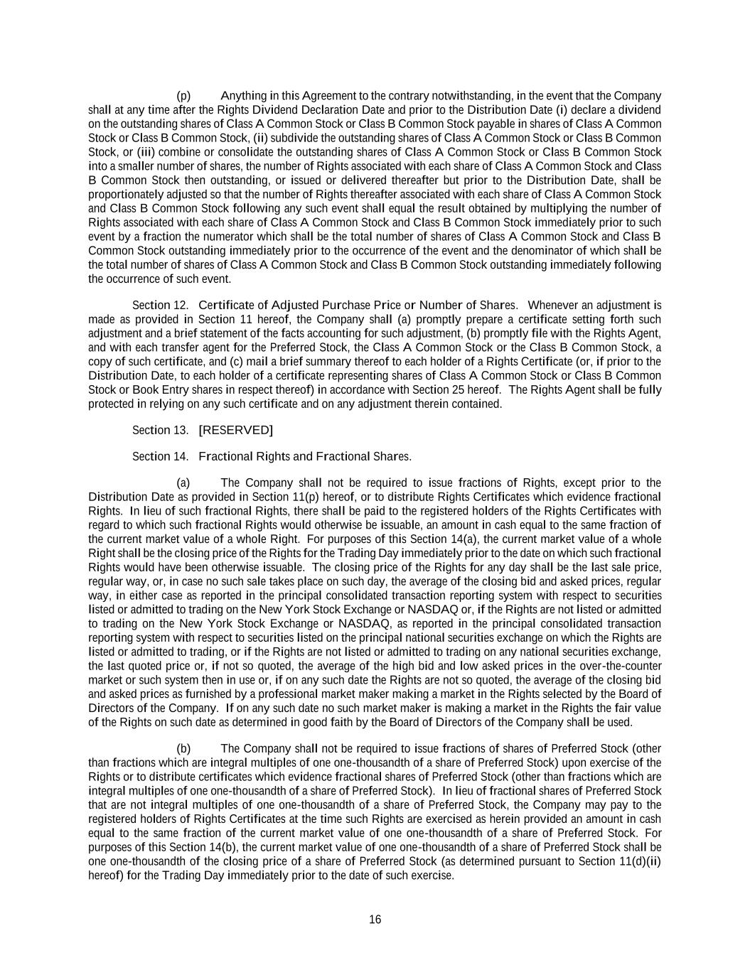 16 (p) Anything in this Agreement to the contrary notwithstanding, in the event that the Company shall at any time after the Rights Dividend Declaration Date and prior to the Distribution Date (i) declare a dividend on the outstanding shares of Class A Common Stock or Class B Common Stock payable in shares of Class A Common Stock or Class B Common Stock, (ii) subdivide the outstanding shares of Class A Common Stock or Class B Common Stock, or (iii) combine or consolidate the outstanding shares of Class A Common Stock or Class B Common Stock into a smaller number of shares, the number of Rights associated with each share of Class A Common Stock and Class B Common Stock then outstanding, or issued or delivered thereafter but prior to the Distribution Date, shall be proportionately adjusted so that the number of Rights thereafter associated with each share of Class A Common Stock and Class B Common Stock following any such event shall equal the result obtained by multiplying the number of Rights associated with each share of Class A Common Stock and Class B Common Stock immediately prior to such event by a fraction the numerator which shall be the total number of shares of Class A Common Stock and Class B Common Stock outstanding immediately prior to the occurrence of the event and the denominator of which shall be the total number of shares of Class A Common Stock and Class B Common Stock outstanding immediately following the occurrence of such event. Section 12. Certificate of Adjusted Purchase Price or Number of Shares. Whenever an adjustment is made as provided in Section 11 hereof, the Company shall (a) promptly prepare a certificate setting forth such adjustment and a brief statement of the facts accounting for such adjustment, (b) promptly file with the Rights Agent, and with each transfer agent for the Preferred Stock, the Class A Common Stock or the Class B Common Stock, a copy of such certificate, and (c) mail a brief summary thereof to each holder of a Rights Certificate (or, if prior to the Distribution Date, to each holder of a certificate representing shares of Class A Common Stock or Class B Common Stock or Book Entry shares in respect thereof) in accordance with Section 25 hereof. The Rights Agent shall be fully protected in relying on any such certificate and on any adjustment therein contained. Section 13. [RESERVED] Section 14. Fractional Rights and Fractional Shares. (a) The Company shall not be required to issue fractions of Rights, except prior to the Distribution Date as provided in Section 11(p) hereof, or to distribute Rights Certificates which evidence fractional Rights. In lieu of such fractional Rights, there shall be paid to the registered holders of the Rights Certificates with regard to which such fractional Rights would otherwise be issuable, an amount in cash equal to the same fraction of the current market value of a whole Right. For purposes of this Section 14(a), the current market value of a whole Right shall be the closing price of the Rights for the Trading Day immediately prior to the date on which such fractional Rights would have been otherwise issuable. The closing price of the Rights for any day shall be the last sale price, regular way, or, in case no such sale takes place on such day, the average of the closing bid and asked prices, regular way, in either case as reported in the principal consolidated transaction reporting system with respect to securities listed or admitted to trading on the New York Stock Exchange or NASDAQ or, if the Rights are not listed or admitted to trading on the New York Stock Exchange or NASDAQ, as reported in the principal consolidated transaction reporting system with respect to securities listed on the principal national securities exchange on which the Rights are listed or admitted to trading, or if the Rights are not listed or admitted to trading on any national securities exchange, the last quoted price or, if not so quoted, the average of the high bid and low asked prices in the over-the-counter market or such system then in use or, if on any such date the Rights are not so quoted, the average of the closing bid and asked prices as furnished by a professional market maker making a market in the Rights selected by the Board of Directors of the Company. If on any such date no such market maker is making a market in the Rights the fair value of the Rights on such date as determined in good faith by the Board of Directors of the Company shall be used. (b) The Company shall not be required to issue fractions of shares of Preferred Stock (other than fractions which are integral multiples of one one-thousandth of a share of Preferred Stock) upon exercise of the Rights or to distribute certificates which evidence fractional shares of Preferred Stock (other than fractions which are integral multiples of one one-thousandth of a share of Preferred Stock). In lieu of fractional shares of Preferred Stock that are not integral multiples of one one-thousandth of a share of Preferred Stock, the Company may pay to the registered holders of Rights Certificates at the time such Rights are exercised as herein provided an amount in cash equal to the same fraction of the current market value of one one-thousandth of a share of Preferred Stock. For purposes of this Section 14(b), the current market value of one one-thousandth of a share of Preferred Stock shall be one one-thousandth of the closing price of a share of Preferred Stock (as determined pursuant to Section 11(d)(ii) hereof) for the Trading Day immediately prior to the date of such exercise.