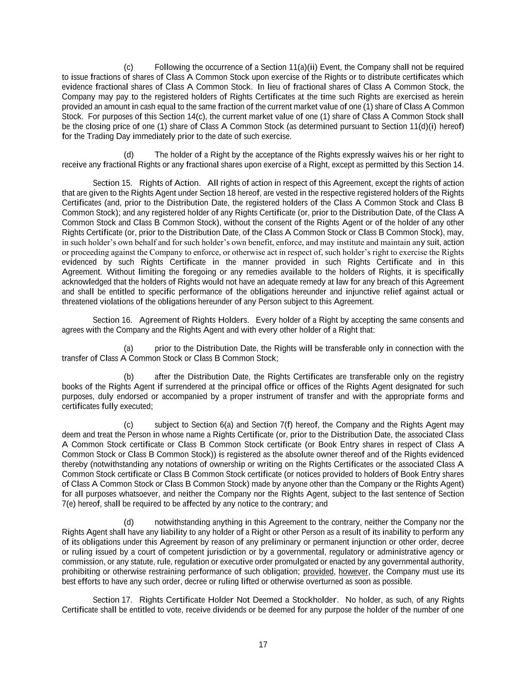 17 (c) Following the occurrence of a Section 11(a)(ii) Event, the Company shall not be required to issue fractions of shares of Class A Common Stock upon exercise of the Rights or to distribute certificates which evidence fractional shares of Class A Common Stock. In lieu of fractional shares of Class A Common Stock, the Company may pay to the registered holders of Rights Certificates at the time such Rights are exercised as herein provided an amount in cash equal to the same fraction of the current market value of one (1) share of Class A Common Stock. For purposes of this Section 14(c), the current market value of one (1) share of Class A Common Stock shall be the closing price of one (1) share of Class A Common Stock (as determined pursuant to Section 11(d)(i) hereof) for the Trading Day immediately prior to the date of such exercise. (d) The holder of a Right by the acceptance of the Rights expressly waives his or her right to receive any fractional Rights or any fractional shares upon exercise of a Right, except as permitted by this Section 14. Section 15. Rights of Action. All rights of action in respect of this Agreement, except the rights of action that are given to the Rights Agent under Section 18 hereof, are vested in the respective registered holders of the Rights Certificates (and, prior to the Distribution Date, the registered holders of the Class A Common Stock and Class B Common Stock); and any registered holder of any Rights Certificate (or, prior to the Distribution Date, of the Class A Common Stock and Class B Common Stock), without the consent of the Rights Agent or of the holder of any other Rights Certificate (or, prior to the Distribution Date, of the Class A Common Stock or Class B Common Stock), may, in such holder’s own behalf and for such holder’s own benefit, enforce, and may institute and maintain any suit, action or proceeding against the Company to enforce, or otherwise act in respect of, such holder’s right to exercise the Rights evidenced by such Rights Certificate in the manner provided in such Rights Certificate and in this Agreement. Without limiting the foregoing or any remedies available to the holders of Rights, it is specifically acknowledged that the holders of Rights would not have an adequate remedy at law for any breach of this Agreement and shall be entitled to specific performance of the obligations hereunder and injunctive relief against actual or threatened violations of the obligations hereunder of any Person subject to this Agreement. Section 16. Agreement of Rights Holders. Every holder of a Right by accepting the same consents and agrees with the Company and the Rights Agent and with every other holder of a Right that: (a) prior to the Distribution Date, the Rights will be transferable only in connection with the transfer of Class A Common Stock or Class B Common Stock; (b) after the Distribution Date, the Rights Certificates are transferable only on the registry books of the Rights Agent if surrendered at the principal office or offices of the Rights Agent designated for such purposes, duly endorsed or accompanied by a proper instrument of transfer and with the appropriate forms and certificates fully executed; (c) subject to Section 6(a) and Section 7(f) hereof, the Company and the Rights Agent may deem and treat the Person in whose name a Rights Certificate (or, prior to the Distribution Date, the associated Class A Common Stock certificate or Class B Common Stock certificate (or Book Entry shares in respect of Class A Common Stock or Class B Common Stock)) is registered as the absolute owner thereof and of the Rights evidenced thereby (notwithstanding any notations of ownership or writing on the Rights Certificates or the associated Class A Common Stock certificate or Class B Common Stock certificate (or notices provided to holders of Book Entry shares of Class A Common Stock or Class B Common Stock) made by anyone other than the Company or the Rights Agent) for all purposes whatsoever, and neither the Company nor the Rights Agent, subject to the last sentence of Section 7(e) hereof, shall be required to be affected by any notice to the contrary; and (d) notwithstanding anything in this Agreement to the contrary, neither the Company nor the Rights Agent shall have any liability to any holder of a Right or other Person as a result of its inability to perform any of its obligations under this Agreement by reason of any preliminary or permanent injunction or other order, decree or ruling issued by a court of competent jurisdiction or by a governmental, regulatory or administrative agency or commission, or any statute, rule, regulation or executive order promulgated or enacted by any governmental authority, prohibiting or otherwise restraining performance of such obligation; provided, however, the Company must use its best efforts to have any such order, decree or ruling lifted or otherwise overturned as soon as possible. Section 17. Rights Certificate Holder Not Deemed a Stockholder. No holder, as such, of any Rights Certificate shall be entitled to vote, receive dividends or be deemed for any purpose the holder of the number of one