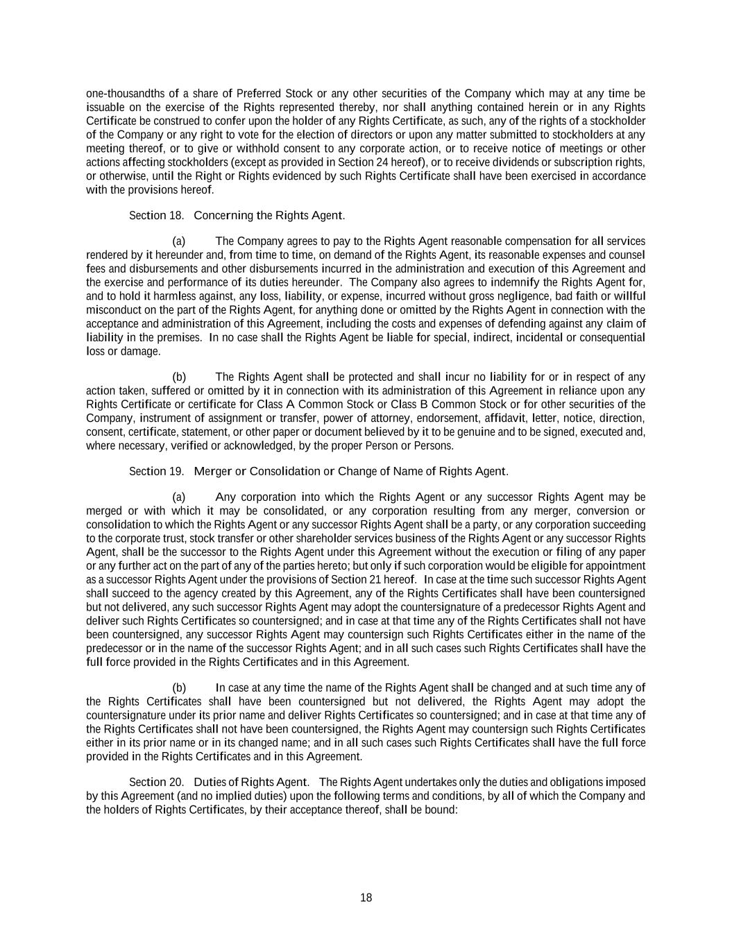 18 one-thousandths of a share of Preferred Stock or any other securities of the Company which may at any time be issuable on the exercise of the Rights represented thereby, nor shall anything contained herein or in any Rights Certificate be construed to confer upon the holder of any Rights Certificate, as such, any of the rights of a stockholder of the Company or any right to vote for the election of directors or upon any matter submitted to stockholders at any meeting thereof, or to give or withhold consent to any corporate action, or to receive notice of meetings or other actions affecting stockholders (except as provided in Section 24 hereof), or to receive dividends or subscription rights, or otherwise, until the Right or Rights evidenced by such Rights Certificate shall have been exercised in accordance with the provisions hereof. Section 18. Concerning the Rights Agent. (a) The Company agrees to pay to the Rights Agent reasonable compensation for all services rendered by it hereunder and, from time to time, on demand of the Rights Agent, its reasonable expenses and counsel fees and disbursements and other disbursements incurred in the administration and execution of this Agreement and the exercise and performance of its duties hereunder. The Company also agrees to indemnify the Rights Agent for, and to hold it harmless against, any loss, liability, or expense, incurred without gross negligence, bad faith or willful misconduct on the part of the Rights Agent, for anything done or omitted by the Rights Agent in connection with the acceptance and administration of this Agreement, including the costs and expenses of defending against any claim of liability in the premises. In no case shall the Rights Agent be liable for special, indirect, incidental or consequential loss or damage. (b) The Rights Agent shall be protected and shall incur no liability for or in respect of any action taken, suffered or omitted by it in connection with its administration of this Agreement in reliance upon any Rights Certificate or certificate for Class A Common Stock or Class B Common Stock or for other securities of the Company, instrument of assignment or transfer, power of attorney, endorsement, affidavit, letter, notice, direction, consent, certificate, statement, or other paper or document believed by it to be genuine and to be signed, executed and, where necessary, verified or acknowledged, by the proper Person or Persons. Section 19. Merger or Consolidation or Change of Name of Rights Agent. (a) Any corporation into which the Rights Agent or any successor Rights Agent may be merged or with which it may be consolidated, or any corporation resulting from any merger, conversion or consolidation to which the Rights Agent or any successor Rights Agent shall be a party, or any corporation succeeding to the corporate trust, stock transfer or other shareholder services business of the Rights Agent or any successor Rights Agent, shall be the successor to the Rights Agent under this Agreement without the execution or filing of any paper or any further act on the part of any of the parties hereto; but only if such corporation would be eligible for appointment as a successor Rights Agent under the provisions of Section 21 hereof. In case at the time such successor Rights Agent shall succeed to the agency created by this Agreement, any of the Rights Certificates shall have been countersigned but not delivered, any such successor Rights Agent may adopt the countersignature of a predecessor Rights Agent and deliver such Rights Certificates so countersigned; and in case at that time any of the Rights Certificates shall not have been countersigned, any successor Rights Agent may countersign such Rights Certificates either in the name of the predecessor or in the name of the successor Rights Agent; and in all such cases such Rights Certificates shall have the full force provided in the Rights Certificates and in this Agreement. (b) In case at any time the name of the Rights Agent shall be changed and at such time any of the Rights Certificates shall have been countersigned but not delivered, the Rights Agent may adopt the countersignature under its prior name and deliver Rights Certificates so countersigned; and in case at that time any of the Rights Certificates shall not have been countersigned, the Rights Agent may countersign such Rights Certificates either in its prior name or in its changed name; and in all such cases such Rights Certificates shall have the full force provided in the Rights Certificates and in this Agreement. Section 20. Duties of Rights Agent. The Rights Agent undertakes only the duties and obligations imposed by this Agreement (and no implied duties) upon the following terms and conditions, by all of which the Company and the holders of Rights Certificates, by their acceptance thereof, shall be bound:
