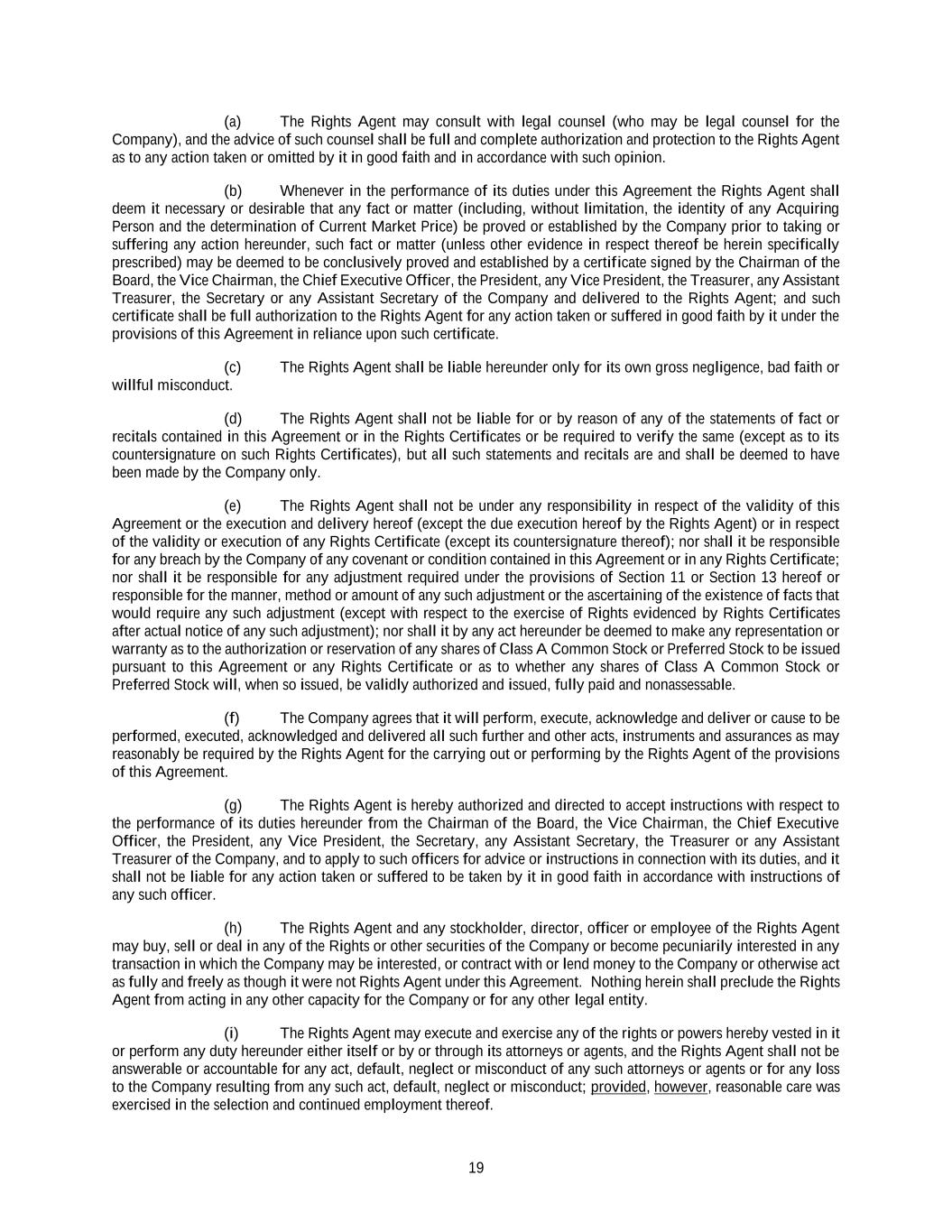 19 (a) The Rights Agent may consult with legal counsel (who may be legal counsel for the Company), and the advice of such counsel shall be full and complete authorization and protection to the Rights Agent as to any action taken or omitted by it in good faith and in accordance with such opinion. (b) Whenever in the performance of its duties under this Agreement the Rights Agent shall deem it necessary or desirable that any fact or matter (including, without limitation, the identity of any Acquiring Person and the determination of Current Market Price) be proved or established by the Company prior to taking or suffering any action hereunder, such fact or matter (unless other evidence in respect thereof be herein specifically prescribed) may be deemed to be conclusively proved and established by a certificate signed by the Chairman of the Board, the Vice Chairman, the Chief Executive Officer, the President, any Vice President, the Treasurer, any Assistant Treasurer, the Secretary or any Assistant Secretary of the Company and delivered to the Rights Agent; and such certificate shall be full authorization to the Rights Agent for any action taken or suffered in good faith by it under the provisions of this Agreement in reliance upon such certificate. (c) The Rights Agent shall be liable hereunder only for its own gross negligence, bad faith or willful misconduct. (d) The Rights Agent shall not be liable for or by reason of any of the statements of fact or recitals contained in this Agreement or in the Rights Certificates or be required to verify the same (except as to its countersignature on such Rights Certificates), but all such statements and recitals are and shall be deemed to have been made by the Company only. (e) The Rights Agent shall not be under any responsibility in respect of the validity of this Agreement or the execution and delivery hereof (except the due execution hereof by the Rights Agent) or in respect of the validity or execution of any Rights Certificate (except its countersignature thereof); nor shall it be responsible for any breach by the Company of any covenant or condition contained in this Agreement or in any Rights Certificate; nor shall it be responsible for any adjustment required under the provisions of Section 11 or Section 13 hereof or responsible for the manner, method or amount of any such adjustment or the ascertaining of the existence of facts that would require any such adjustment (except with respect to the exercise of Rights evidenced by Rights Certificates after actual notice of any such adjustment); nor shall it by any act hereunder be deemed to make any representation or warranty as to the authorization or reservation of any shares of Class A Common Stock or Preferred Stock to be issued pursuant to this Agreement or any Rights Certificate or as to whether any shares of Class A Common Stock or Preferred Stock will, when so issued, be validly authorized and issued, fully paid and nonassessable. (f) The Company agrees that it will perform, execute, acknowledge and deliver or cause to be performed, executed, acknowledged and delivered all such further and other acts, instruments and assurances as may reasonably be required by the Rights Agent for the carrying out or performing by the Rights Agent of the provisions of this Agreement. (g) The Rights Agent is hereby authorized and directed to accept instructions with respect to the performance of its duties hereunder from the Chairman of the Board, the Vice Chairman, the Chief Executive Officer, the President, any Vice President, the Secretary, any Assistant Secretary, the Treasurer or any Assistant Treasurer of the Company, and to apply to such officers for advice or instructions in connection with its duties, and it shall not be liable for any action taken or suffered to be taken by it in good faith in accordance with instructions of any such officer. (h) The Rights Agent and any stockholder, director, officer or employee of the Rights Agent may buy, sell or deal in any of the Rights or other securities of the Company or become pecuniarily interested in any transaction in which the Company may be interested, or contract with or lend money to the Company or otherwise act as fully and freely as though it were not Rights Agent under this Agreement. Nothing herein shall preclude the Rights Agent from acting in any other capacity for the Company or for any other legal entity. (i) The Rights Agent may execute and exercise any of the rights or powers hereby vested in it or perform any duty hereunder either itself or by or through its attorneys or agents, and the Rights Agent shall not be answerable or accountable for any act, default, neglect or misconduct of any such attorneys or agents or for any loss to the Company resulting from any such act, default, neglect or misconduct; provided, however, reasonable care was exercised in the selection and continued employment thereof.