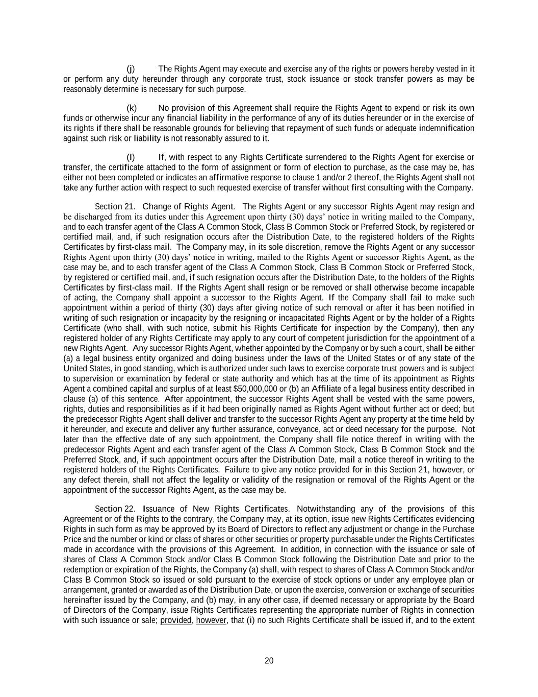20 (j) The Rights Agent may execute and exercise any of the rights or powers hereby vested in it or perform any duty hereunder through any corporate trust, stock issuance or stock transfer powers as may be reasonably determine is necessary for such purpose. (k) No provision of this Agreement shall require the Rights Agent to expend or risk its own funds or otherwise incur any financial liability in the performance of any of its duties hereunder or in the exercise of its rights if there shall be reasonable grounds for believing that repayment of such funds or adequate indemnification against such risk or liability is not reasonably assured to it. (l) If, with respect to any Rights Certificate surrendered to the Rights Agent for exercise or transfer, the certificate attached to the form of assignment or form of election to purchase, as the case may be, has either not been completed or indicates an affirmative response to clause 1 and/or 2 thereof, the Rights Agent shall not take any further action with respect to such requested exercise of transfer without first consulting with the Company. Section 21. Change of Rights Agent. The Rights Agent or any successor Rights Agent may resign and be discharged from its duties under this Agreement upon thirty (30) days’ notice in writing mailed to the Company, and to each transfer agent of the Class A Common Stock, Class B Common Stock or Preferred Stock, by registered or certified mail, and, if such resignation occurs after the Distribution Date, to the registered holders of the Rights Certificates by first-class mail. The Company may, in its sole discretion, remove the Rights Agent or any successor Rights Agent upon thirty (30) days’ notice in writing, mailed to the Rights Agent or successor Rights Agent, as the case may be, and to each transfer agent of the Class A Common Stock, Class B Common Stock or Preferred Stock, by registered or certified mail, and, if such resignation occurs after the Distribution Date, to the holders of the Rights Certificates by first-class mail. If the Rights Agent shall resign or be removed or shall otherwise become incapable of acting, the Company shall appoint a successor to the Rights Agent. If the Company shall fail to make such appointment within a period of thirty (30) days after giving notice of such removal or after it has been notified in writing of such resignation or incapacity by the resigning or incapacitated Rights Agent or by the holder of a Rights Certificate (who shall, with such notice, submit his Rights Certificate for inspection by the Company), then any registered holder of any Rights Certificate may apply to any court of competent jurisdiction for the appointment of a new Rights Agent. Any successor Rights Agent, whether appointed by the Company or by such a court, shall be either (a) a legal business entity organized and doing business under the laws of the United States or of any state of the United States, in good standing, which is authorized under such laws to exercise corporate trust powers and is subject to supervision or examination by federal or state authority and which has at the time of its appointment as Rights Agent a combined capital and surplus of at least $50,000,000 or (b) an Affiliate of a legal business entity described in clause (a) of this sentence. After appointment, the successor Rights Agent shall be vested with the same powers, rights, duties and responsibilities as if it had been originally named as Rights Agent without further act or deed; but the predecessor Rights Agent shall deliver and transfer to the successor Rights Agent any property at the time held by it hereunder, and execute and deliver any further assurance, conveyance, act or deed necessary for the purpose. Not later than the effective date of any such appointment, the Company shall file notice thereof in writing with the predecessor Rights Agent and each transfer agent of the Class A Common Stock, Class B Common Stock and the Preferred Stock, and, if such appointment occurs after the Distribution Date, mail a notice thereof in writing to the registered holders of the Rights Certificates. Failure to give any notice provided for in this Section 21, however, or any defect therein, shall not affect the legality or validity of the resignation or removal of the Rights Agent or the appointment of the successor Rights Agent, as the case may be. Section 22. Issuance of New Rights Certificates. Notwithstanding any of the provisions of this Agreement or of the Rights to the contrary, the Company may, at its option, issue new Rights Certificates evidencing Rights in such form as may be approved by its Board of Directors to reflect any adjustment or change in the Purchase Price and the number or kind or class of shares or other securities or property purchasable under the Rights Certificates made in accordance with the provisions of this Agreement. In addition, in connection with the issuance or sale of shares of Class A Common Stock and/or Class B Common Stock following the Distribution Date and prior to the redemption or expiration of the Rights, the Company (a) shall, with respect to shares of Class A Common Stock and/or Class B Common Stock so issued or sold pursuant to the exercise of stock options or under any employee plan or arrangement, granted or awarded as of the Distribution Date, or upon the exercise, conversion or exchange of securities hereinafter issued by the Company, and (b) may, in any other case, if deemed necessary or appropriate by the Board of Directors of the Company, issue Rights Certificates representing the appropriate number of Rights in connection with such issuance or sale; provided, however, that (i) no such Rights Certificate shall be issued if, and to the extent