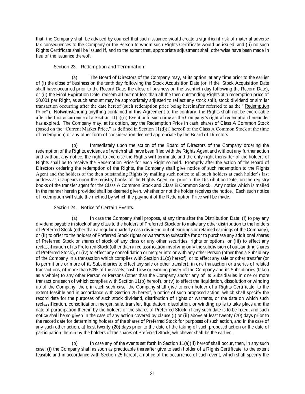 21 that, the Company shall be advised by counsel that such issuance would create a significant risk of material adverse tax consequences to the Company or the Person to whom such Rights Certificate would be issued, and (ii) no such Rights Certificate shall be issued if, and to the extent that, appropriate adjustment shall otherwise have been made in lieu of the issuance thereof. Section 23. Redemption and Termination. (a) The Board of Directors of the Company may, at its option, at any time prior to the earlier of (i) the close of business on the tenth day following the Stock Acquisition Date (or, if the Stock Acquisition Date shall have occurred prior to the Record Date, the close of business on the twentieth day following the Record Date), or (ii) the Final Expiration Date, redeem all but not less than all the then outstanding Rights at a redemption price of $0.001 per Right, as such amount may be appropriately adjusted to reflect any stock split, stock dividend or similar transaction occurring after the date hereof (such redemption price being hereinafter referred to as the “Redemption Price”). Notwithstanding anything contained in this Agreement to the contrary, the Rights shall not be exercisable after the first occurrence of a Section 11(a)(ii) Event until such time as the Company’s right of redemption hereunder has expired. The Company may, at its option, pay the Redemption Price in cash, shares of Class A Common Stock (based on the “Current Market Price,” as defined in Section 11(d)(i) hereof, of the Class A Common Stock at the time of redemption) or any other form of consideration deemed appropriate by the Board of Directors. (b) Immediately upon the action of the Board of Directors of the Company ordering the redemption of the Rights, evidence of which shall have been filed with the Rights Agent and without any further action and without any notice, the right to exercise the Rights will terminate and the only right thereafter of the holders of Rights shall be to receive the Redemption Price for each Right so held. Promptly after the action of the Board of Directors ordering the redemption of the Rights, the Company shall give notice of such redemption to the Rights Agent and the holders of the then outstanding Rights by mailing such notice to all such holders at each holder’s last address as it appears upon the registry books of the Rights Agent or, prior to the Distribution Date, on the registry books of the transfer agent for the Class A Common Stock and Class B Common Stock. Any notice which is mailed in the manner herein provided shall be deemed given, whether or not the holder receives the notice. Each such notice of redemption will state the method by which the payment of the Redemption Price will be made. Section 24. Notice of Certain Events. (a) In case the Company shall propose, at any time after the Distribution Date, (i) to pay any dividend payable in stock of any class to the holders of Preferred Stock or to make any other distribution to the holders of Preferred Stock (other than a regular quarterly cash dividend out of earnings or retained earnings of the Company), or (ii) to offer to the holders of Preferred Stock rights or warrants to subscribe for or to purchase any additional shares of Preferred Stock or shares of stock of any class or any other securities, rights or options, or (iii) to effect any reclassification of its Preferred Stock (other than a reclassification involving only the subdivision of outstanding shares of Preferred Stock), or (iv) to effect any consolidation or merger into or with any other Person (other than a Subsidiary of the Company in a transaction which complies with Section 11(o) hereof), or to effect any sale or other transfer (or to permit one or more of its Subsidiaries to effect any sale or other transfer), in one transaction or a series of related transactions, of more than 50% of the assets, cash flow or earning power of the Company and its Subsidiaries (taken as a whole) to any other Person or Persons (other than the Company and/or any of its Subsidiaries in one or more transactions each of which complies with Section 11(o) hereof), or (v) to effect the liquidation, dissolution or winding up of the Company, then, in each such case, the Company shall give to each holder of a Rights Certificate, to the extent feasible and in accordance with Section 25 hereof, a notice of such proposed action, which shall specify the record date for the purposes of such stock dividend, distribution of rights or warrants, or the date on which such reclassification, consolidation, merger, sale, transfer, liquidation, dissolution, or winding up is to take place and the date of participation therein by the holders of the shares of Preferred Stock, if any such date is to be fixed, and such notice shall be so given in the case of any action covered by clause (i) or (ii) above at least twenty (20) days prior to the record date for determining holders of the shares of Preferred Stock for purposes of such action, and in the case of any such other action, at least twenty (20) days prior to the date of the taking of such proposed action or the date of participation therein by the holders of the shares of Preferred Stock, whichever shall be the earlier. (b) In case any of the events set forth in Section 11(a)(ii) hereof shall occur, then, in any such case, (i) the Company shall as soon as practicable thereafter give to each holder of a Rights Certificate, to the extent feasible and in accordance with Section 25 hereof, a notice of the occurrence of such event, which shall specify the