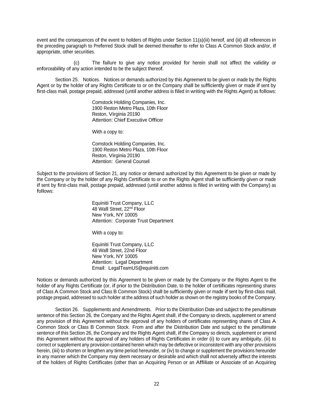 22 event and the consequences of the event to holders of Rights under Section 11(a)(ii) hereof, and (ii) all references in the preceding paragraph to Preferred Stock shall be deemed thereafter to refer to Class A Common Stock and/or, if appropriate, other securities. (c) The failure to give any notice provided for herein shall not affect the validity or enforceability of any action intended to be the subject thereof. Section 25. Notices. Notices or demands authorized by this Agreement to be given or made by the Rights Agent or by the holder of any Rights Certificate to or on the Company shall be sufficiently given or made if sent by first-class mail, postage prepaid, addressed (until another address is filed in writing with the Rights Agent) as follows: Comstock Holding Companies, Inc. 1900 Reston Metro Plaza, 10th Floor Reston, Virginia 20190 Attention: Chief Executive Officer With a copy to: Comstock Holding Companies, Inc. 1900 Reston Metro Plaza, 10th Floor Reston, Virginia 20190 Attention: General Counsel Subject to the provisions of Section 21, any notice or demand authorized by this Agreement to be given or made by the Company or by the holder of any Rights Certificate to or on the Rights Agent shall be sufficiently given or made if sent by first-class mail, postage prepaid, addressed (until another address is filed in writing with the Company) as follows: Equiniti Trust Company, LLC 48 Wall Street, 22nd Floor New York, NY 10005 Attention: Corporate Trust Department With a copy to: Equiniti Trust Company, LLC 48 Wall Street, 22nd Floor New York, NY 10005 Attention: Legal Department Email: LegalTeamUS@equiniti.com Notices or demands authorized by this Agreement to be given or made by the Company or the Rights Agent to the holder of any Rights Certificate (or, if prior to the Distribution Date, to the holder of certificates representing shares of Class A Common Stock and Class B Common Stock) shall be sufficiently given or made if sent by first-class mail, postage prepaid, addressed to such holder at the address of such holder as shown on the registry books of the Company. Section 26. Supplements and Amendments. Prior to the Distribution Date and subject to the penultimate sentence of this Section 26, the Company and the Rights Agent shall, if the Company so directs, supplement or amend any provision of this Agreement without the approval of any holders of certificates representing shares of Class A Common Stock or Class B Common Stock. From and after the Distribution Date and subject to the penultimate sentence of this Section 26, the Company and the Rights Agent shall, if the Company so directs, supplement or amend this Agreement without the approval of any holders of Rights Certificates in order (i) to cure any ambiguity, (ii) to correct or supplement any provision contained herein which may be defective or inconsistent with any other provisions herein, (iii) to shorten or lengthen any time period hereunder, or (iv) to change or supplement the provisions hereunder in any manner which the Company may deem necessary or desirable and which shall not adversely affect the interests of the holders of Rights Certificates (other than an Acquiring Person or an Affiliate or Associate of an Acquiring
