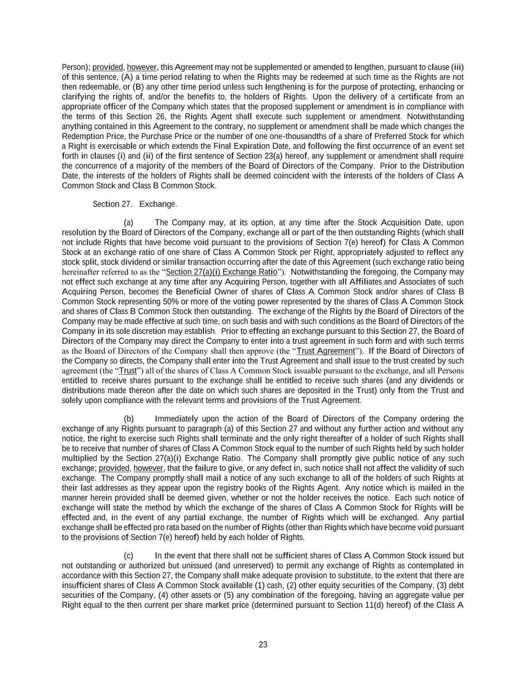 23 Person); provided, however, this Agreement may not be supplemented or amended to lengthen, pursuant to clause (iii) of this sentence, (A) a time period relating to when the Rights may be redeemed at such time as the Rights are not then redeemable, or (B) any other time period unless such lengthening is for the purpose of protecting, enhancing or clarifying the rights of, and/or the benefits to, the holders of Rights. Upon the delivery of a certificate from an appropriate officer of the Company which states that the proposed supplement or amendment is in compliance with the terms of this Section 26, the Rights Agent shall execute such supplement or amendment. Notwithstanding anything contained in this Agreement to the contrary, no supplement or amendment shall be made which changes the Redemption Price, the Purchase Price or the number of one one-thousandths of a share of Preferred Stock for which a Right is exercisable or which extends the Final Expiration Date, and following the first occurrence of an event set forth in clauses (i) and (ii) of the first sentence of Section 23(a) hereof, any supplement or amendment shall require the concurrence of a majority of the members of the Board of Directors of the Company. Prior to the Distribution Date, the interests of the holders of Rights shall be deemed coincident with the interests of the holders of Class A Common Stock and Class B Common Stock. Section 27. Exchange. (a) The Company may, at its option, at any time after the Stock Acquisition Date, upon resolution by the Board of Directors of the Company, exchange all or part of the then outstanding Rights (which shall not include Rights that have become void pursuant to the provisions of Section 7(e) hereof) for Class A Common Stock at an exchange ratio of one share of Class A Common Stock per Right, appropriately adjusted to reflect any stock split, stock dividend or similar transaction occurring after the date of this Agreement (such exchange ratio being hereinafter referred to as the “Section 27(a)(i) Exchange Ratio”). Notwithstanding the foregoing, the Company may not effect such exchange at any time after any Acquiring Person, together with all Affiliates and Associates of such Acquiring Person, becomes the Beneficial Owner of shares of Class A Common Stock and/or shares of Class B Common Stock representing 50% or more of the voting power represented by the shares of Class A Common Stock and shares of Class B Common Stock then outstanding. The exchange of the Rights by the Board of Directors of the Company may be made effective at such time, on such basis and with such conditions as the Board of Directors of the Company in its sole discretion may establish. Prior to effecting an exchange pursuant to this Section 27, the Board of Directors of the Company may direct the Company to enter into a trust agreement in such form and with such terms as the Board of Directors of the Company shall then approve (the “Trust Agreement”). If the Board of Directors of the Company so directs, the Company shall enter into the Trust Agreement and shall issue to the trust created by such agreement (the “Trust”) all of the shares of Class A Common Stock issuable pursuant to the exchange, and all Persons entitled to receive shares pursuant to the exchange shall be entitled to receive such shares (and any dividends or distributions made thereon after the date on which such shares are deposited in the Trust) only from the Trust and solely upon compliance with the relevant terms and provisions of the Trust Agreement. (b) Immediately upon the action of the Board of Directors of the Company ordering the exchange of any Rights pursuant to paragraph (a) of this Section 27 and without any further action and without any notice, the right to exercise such Rights shall terminate and the only right thereafter of a holder of such Rights shall be to receive that number of shares of Class A Common Stock equal to the number of such Rights held by such holder multiplied by the Section 27(a)(i) Exchange Ratio. The Company shall promptly give public notice of any such exchange; provided, however, that the failure to give, or any defect in, such notice shall not affect the validity of such exchange. The Company promptly shall mail a notice of any such exchange to all of the holders of such Rights at their last addresses as they appear upon the registry books of the Rights Agent. Any notice which is mailed in the manner herein provided shall be deemed given, whether or not the holder receives the notice. Each such notice of exchange will state the method by which the exchange of the shares of Class A Common Stock for Rights will be effected and, in the event of any partial exchange, the number of Rights which will be exchanged. Any partial exchange shall be effected pro rata based on the number of Rights (other than Rights which have become void pursuant to the provisions of Section 7(e) hereof) held by each holder of Rights. (c) In the event that there shall not be sufficient shares of Class A Common Stock issued but not outstanding or authorized but unissued (and unreserved) to permit any exchange of Rights as contemplated in accordance with this Section 27, the Company shall make adequate provision to substitute, to the extent that there are insufficient shares of Class A Common Stock available (1) cash, (2) other equity securities of the Company, (3) debt securities of the Company, (4) other assets or (5) any combination of the foregoing, having an aggregate value per Right equal to the then current per share market price (determined pursuant to Section 11(d) hereof) of the Class A