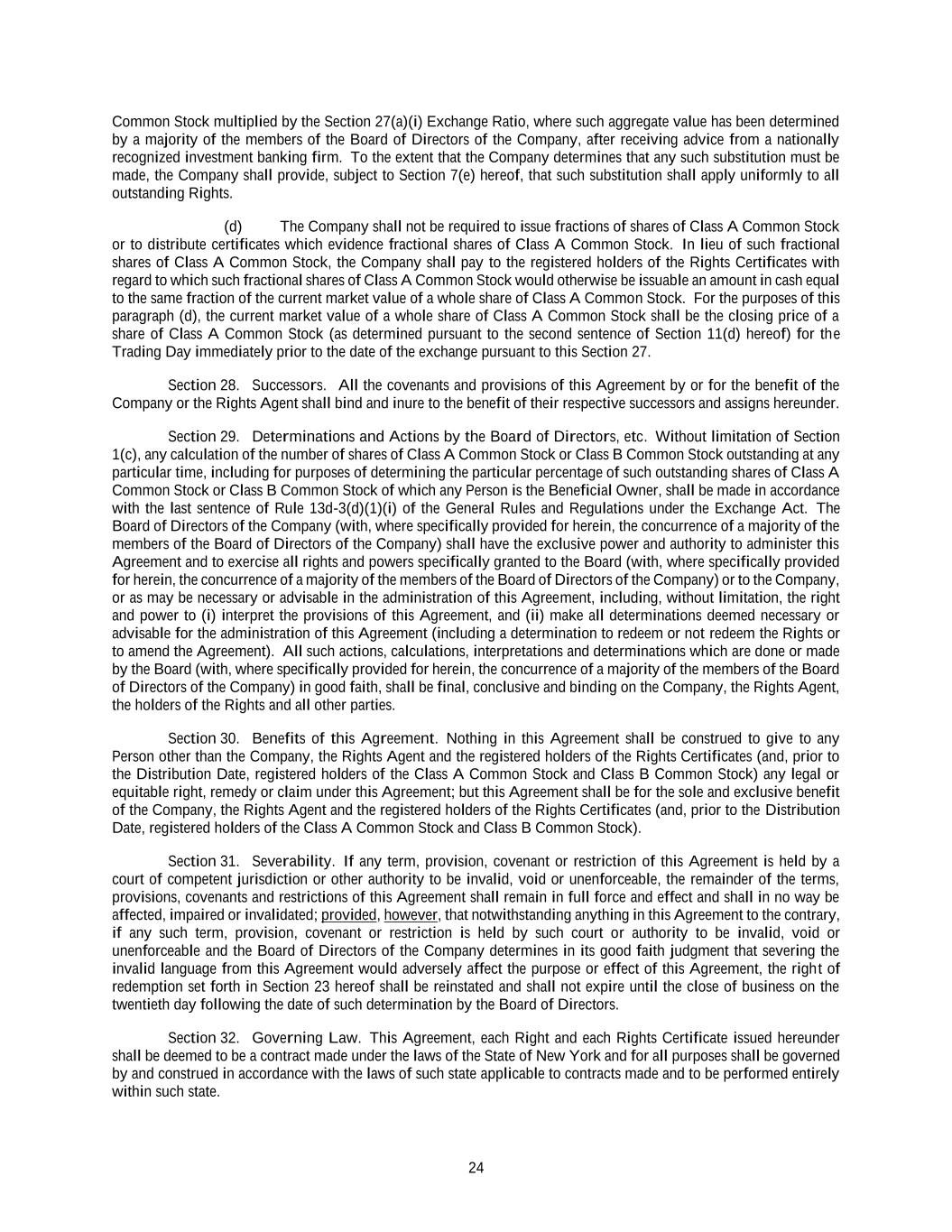 24 Common Stock multiplied by the Section 27(a)(i) Exchange Ratio, where such aggregate value has been determined by a majority of the members of the Board of Directors of the Company, after receiving advice from a nationally recognized investment banking firm. To the extent that the Company determines that any such substitution must be made, the Company shall provide, subject to Section 7(e) hereof, that such substitution shall apply uniformly to all outstanding Rights. (d) The Company shall not be required to issue fractions of shares of Class A Common Stock or to distribute certificates which evidence fractional shares of Class A Common Stock. In lieu of such fractional shares of Class A Common Stock, the Company shall pay to the registered holders of the Rights Certificates with regard to which such fractional shares of Class A Common Stock would otherwise be issuable an amount in cash equal to the same fraction of the current market value of a whole share of Class A Common Stock. For the purposes of this paragraph (d), the current market value of a whole share of Class A Common Stock shall be the closing price of a share of Class A Common Stock (as determined pursuant to the second sentence of Section 11(d) hereof) for the Trading Day immediately prior to the date of the exchange pursuant to this Section 27. Section 28. Successors. All the covenants and provisions of this Agreement by or for the benefit of the Company or the Rights Agent shall bind and inure to the benefit of their respective successors and assigns hereunder. Section 29. Determinations and Actions by the Board of Directors, etc. Without limitation of Section 1(c), any calculation of the number of shares of Class A Common Stock or Class B Common Stock outstanding at any particular time, including for purposes of determining the particular percentage of such outstanding shares of Class A Common Stock or Class B Common Stock of which any Person is the Beneficial Owner, shall be made in accordance with the last sentence of Rule 13d-3(d)(1)(i) of the General Rules and Regulations under the Exchange Act. The Board of Directors of the Company (with, where specifically provided for herein, the concurrence of a majority of the members of the Board of Directors of the Company) shall have the exclusive power and authority to administer this Agreement and to exercise all rights and powers specifically granted to the Board (with, where specifically provided for herein, the concurrence of a majority of the members of the Board of Directors of the Company) or to the Company, or as may be necessary or advisable in the administration of this Agreement, including, without limitation, the right and power to (i) interpret the provisions of this Agreement, and (ii) make all determinations deemed necessary or advisable for the administration of this Agreement (including a determination to redeem or not redeem the Rights or to amend the Agreement). All such actions, calculations, interpretations and determinations which are done or made by the Board (with, where specifically provided for herein, the concurrence of a majority of the members of the Board of Directors of the Company) in good faith, shall be final, conclusive and binding on the Company, the Rights Agent, the holders of the Rights and all other parties. Section 30. Benefits of this Agreement. Nothing in this Agreement shall be construed to give to any Person other than the Company, the Rights Agent and the registered holders of the Rights Certificates (and, prior to the Distribution Date, registered holders of the Class A Common Stock and Class B Common Stock) any legal or equitable right, remedy or claim under this Agreement; but this Agreement shall be for the sole and exclusive benefit of the Company, the Rights Agent and the registered holders of the Rights Certificates (and, prior to the Distribution Date, registered holders of the Class A Common Stock and Class B Common Stock). Section 31. Severability. If any term, provision, covenant or restriction of this Agreement is held by a court of competent jurisdiction or other authority to be invalid, void or unenforceable, the remainder of the terms, provisions, covenants and restrictions of this Agreement shall remain in full force and effect and shall in no way be affected, impaired or invalidated; provided, however, that notwithstanding anything in this Agreement to the contrary, if any such term, provision, covenant or restriction is held by such court or authority to be invalid, void or unenforceable and the Board of Directors of the Company determines in its good faith judgment that severing the invalid language from this Agreement would adversely affect the purpose or effect of this Agreement, the right of redemption set forth in Section 23 hereof shall be reinstated and shall not expire until the close of business on the twentieth day following the date of such determination by the Board of Directors. Section 32. Governing Law. This Agreement, each Right and each Rights Certificate issued hereunder shall be deemed to be a contract made under the laws of the State of New York and for all purposes shall be governed by and construed in accordance with the laws of such state applicable to contracts made and to be performed entirely within such state.