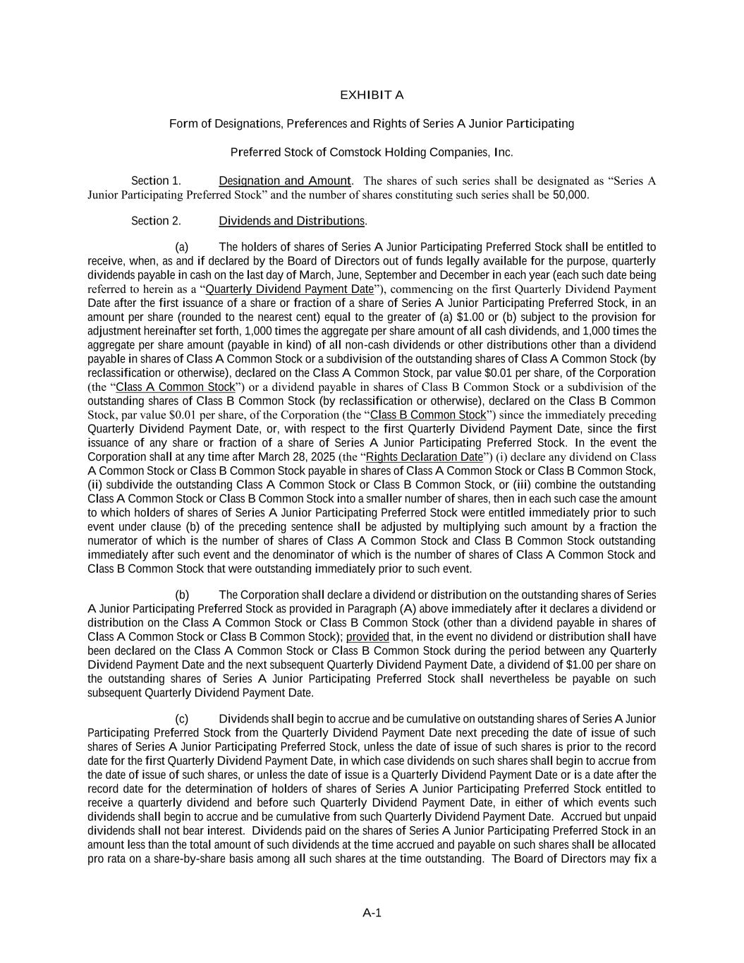 A-1 EXHIBIT A Form of Designations, Preferences and Rights of Series A Junior Participating Preferred Stock of Comstock Holding Companies, Inc. Section 1. Designation and Amount. The shares of such series shall be designated as “Series A Junior Participating Preferred Stock” and the number of shares constituting such series shall be 50,000. Section 2. Dividends and Distributions. (a) The holders of shares of Series A Junior Participating Preferred Stock shall be entitled to receive, when, as and if declared by the Board of Directors out of funds legally available for the purpose, quarterly dividends payable in cash on the last day of March, June, September and December in each year (each such date being referred to herein as a “Quarterly Dividend Payment Date”), commencing on the first Quarterly Dividend Payment Date after the first issuance of a share or fraction of a share of Series A Junior Participating Preferred Stock, in an amount per share (rounded to the nearest cent) equal to the greater of (a) $1.00 or (b) subject to the provision for adjustment hereinafter set forth, 1,000 times the aggregate per share amount of all cash dividends, and 1,000 times the aggregate per share amount (payable in kind) of all non-cash dividends or other distributions other than a dividend payable in shares of Class A Common Stock or a subdivision of the outstanding shares of Class A Common Stock (by reclassification or otherwise), declared on the Class A Common Stock, par value $0.01 per share, of the Corporation (the “Class A Common Stock”) or a dividend payable in shares of Class B Common Stock or a subdivision of the outstanding shares of Class B Common Stock (by reclassification or otherwise), declared on the Class B Common Stock, par value $0.01 per share, of the Corporation (the “Class B Common Stock”) since the immediately preceding Quarterly Dividend Payment Date, or, with respect to the first Quarterly Dividend Payment Date, since the first issuance of any share or fraction of a share of Series A Junior Participating Preferred Stock. In the event the Corporation shall at any time after March 28, 2025 (the “Rights Declaration Date”) (i) declare any dividend on Class A Common Stock or Class B Common Stock payable in shares of Class A Common Stock or Class B Common Stock, (ii) subdivide the outstanding Class A Common Stock or Class B Common Stock, or (iii) combine the outstanding Class A Common Stock or Class B Common Stock into a smaller number of shares, then in each such case the amount to which holders of shares of Series A Junior Participating Preferred Stock were entitled immediately prior to such event under clause (b) of the preceding sentence shall be adjusted by multiplying such amount by a fraction the numerator of which is the number of shares of Class A Common Stock and Class B Common Stock outstanding immediately after such event and the denominator of which is the number of shares of Class A Common Stock and Class B Common Stock that were outstanding immediately prior to such event. (b) The Corporation shall declare a dividend or distribution on the outstanding shares of Series A Junior Participating Preferred Stock as provided in Paragraph (A) above immediately after it declares a dividend or distribution on the Class A Common Stock or Class B Common Stock (other than a dividend payable in shares of Class A Common Stock or Class B Common Stock); provided that, in the event no dividend or distribution shall have been declared on the Class A Common Stock or Class B Common Stock during the period between any Quarterly Dividend Payment Date and the next subsequent Quarterly Dividend Payment Date, a dividend of $1.00 per share on the outstanding shares of Series A Junior Participating Preferred Stock shall nevertheless be payable on such subsequent Quarterly Dividend Payment Date. (c) Dividends shall begin to accrue and be cumulative on outstanding shares of Series A Junior Participating Preferred Stock from the Quarterly Dividend Payment Date next preceding the date of issue of such shares of Series A Junior Participating Preferred Stock, unless the date of issue of such shares is prior to the record date for the first Quarterly Dividend Payment Date, in which case dividends on such shares shall begin to accrue from the date of issue of such shares, or unless the date of issue is a Quarterly Dividend Payment Date or is a date after the record date for the determination of holders of shares of Series A Junior Participating Preferred Stock entitled to receive a quarterly dividend and before such Quarterly Dividend Payment Date, in either of which events such dividends shall begin to accrue and be cumulative from such Quarterly Dividend Payment Date. Accrued but unpaid dividends shall not bear interest. Dividends paid on the shares of Series A Junior Participating Preferred Stock in an amount less than the total amount of such dividends at the time accrued and payable on such shares shall be allocated pro rata on a share-by-share basis among all such shares at the time outstanding. The Board of Directors may fix a