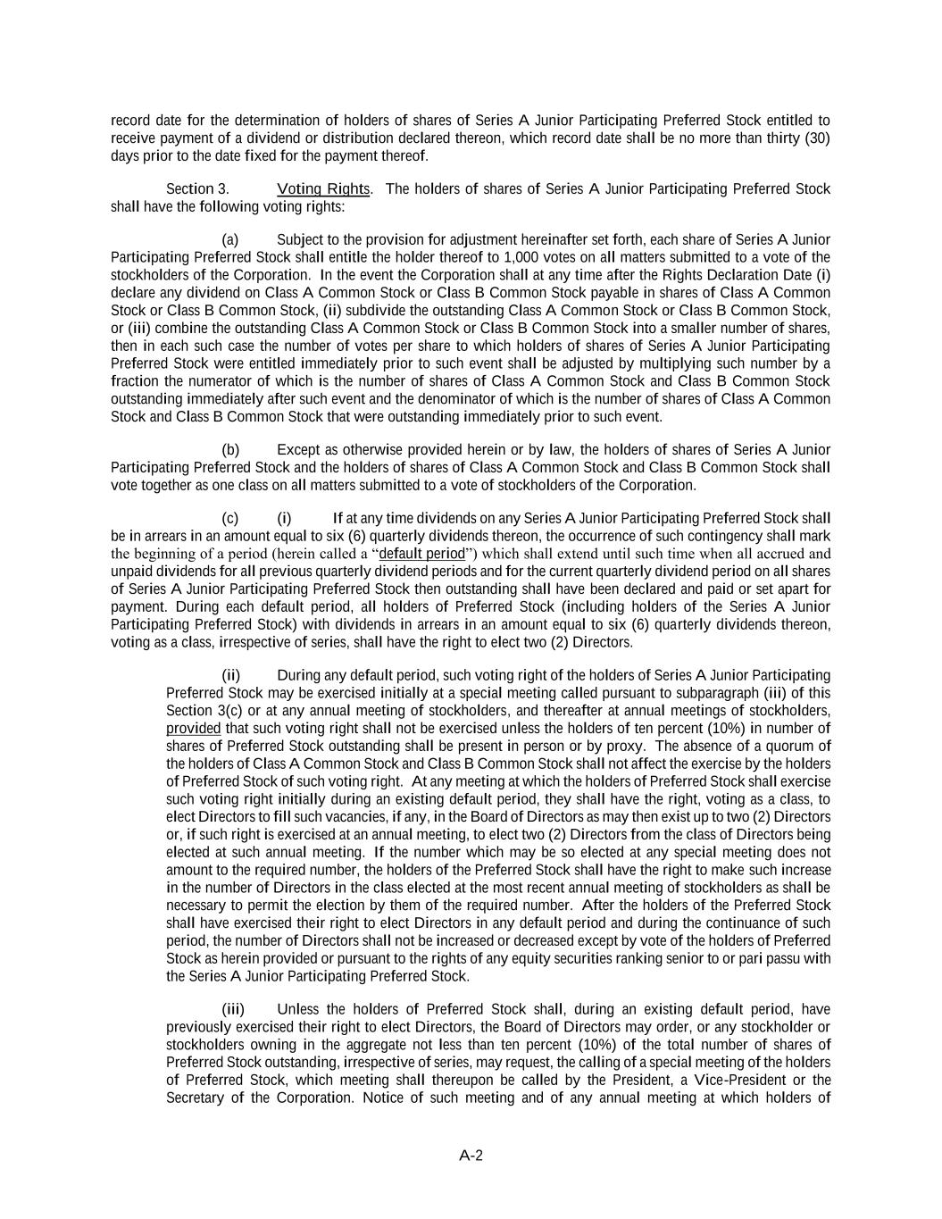 A-2 record date for the determination of holders of shares of Series A Junior Participating Preferred Stock entitled to receive payment of a dividend or distribution declared thereon, which record date shall be no more than thirty (30) days prior to the date fixed for the payment thereof. Section 3. Voting Rights. The holders of shares of Series A Junior Participating Preferred Stock shall have the following voting rights: (a) Subject to the provision for adjustment hereinafter set forth, each share of Series A Junior Participating Preferred Stock shall entitle the holder thereof to 1,000 votes on all matters submitted to a vote of the stockholders of the Corporation. In the event the Corporation shall at any time after the Rights Declaration Date (i) declare any dividend on Class A Common Stock or Class B Common Stock payable in shares of Class A Common Stock or Class B Common Stock, (ii) subdivide the outstanding Class A Common Stock or Class B Common Stock, or (iii) combine the outstanding Class A Common Stock or Class B Common Stock into a smaller number of shares, then in each such case the number of votes per share to which holders of shares of Series A Junior Participating Preferred Stock were entitled immediately prior to such event shall be adjusted by multiplying such number by a fraction the numerator of which is the number of shares of Class A Common Stock and Class B Common Stock outstanding immediately after such event and the denominator of which is the number of shares of Class A Common Stock and Class B Common Stock that were outstanding immediately prior to such event. (b) Except as otherwise provided herein or by law, the holders of shares of Series A Junior Participating Preferred Stock and the holders of shares of Class A Common Stock and Class B Common Stock shall vote together as one class on all matters submitted to a vote of stockholders of the Corporation. (c) (i) If at any time dividends on any Series A Junior Participating Preferred Stock shall be in arrears in an amount equal to six (6) quarterly dividends thereon, the occurrence of such contingency shall mark the beginning of a period (herein called a “default period”) which shall extend until such time when all accrued and unpaid dividends for all previous quarterly dividend periods and for the current quarterly dividend period on all shares of Series A Junior Participating Preferred Stock then outstanding shall have been declared and paid or set apart for payment. During each default period, all holders of Preferred Stock (including holders of the Series A Junior Participating Preferred Stock) with dividends in arrears in an amount equal to six (6) quarterly dividends thereon, voting as a class, irrespective of series, shall have the right to elect two (2) Directors. (ii) During any default period, such voting right of the holders of Series A Junior Participating Preferred Stock may be exercised initially at a special meeting called pursuant to subparagraph (iii) of this Section 3(c) or at any annual meeting of stockholders, and thereafter at annual meetings of stockholders, provided that such voting right shall not be exercised unless the holders of ten percent (10%) in number of shares of Preferred Stock outstanding shall be present in person or by proxy. The absence of a quorum of the holders of Class A Common Stock and Class B Common Stock shall not affect the exercise by the holders of Preferred Stock of such voting right. At any meeting at which the holders of Preferred Stock shall exercise such voting right initially during an existing default period, they shall have the right, voting as a class, to elect Directors to fill such vacancies, if any, in the Board of Directors as may then exist up to two (2) Directors or, if such right is exercised at an annual meeting, to elect two (2) Directors from the class of Directors being elected at such annual meeting. If the number which may be so elected at any special meeting does not amount to the required number, the holders of the Preferred Stock shall have the right to make such increase in the number of Directors in the class elected at the most recent annual meeting of stockholders as shall be necessary to permit the election by them of the required number. After the holders of the Preferred Stock shall have exercised their right to elect Directors in any default period and during the continuance of such period, the number of Directors shall not be increased or decreased except by vote of the holders of Preferred Stock as herein provided or pursuant to the rights of any equity securities ranking senior to or pari passu with the Series A Junior Participating Preferred Stock. (iii) Unless the holders of Preferred Stock shall, during an existing default period, have previously exercised their right to elect Directors, the Board of Directors may order, or any stockholder or stockholders owning in the aggregate not less than ten percent (10%) of the total number of shares of Preferred Stock outstanding, irrespective of series, may request, the calling of a special meeting of the holders of Preferred Stock, which meeting shall thereupon be called by the President, a Vice-President or the Secretary of the Corporation. Notice of such meeting and of any annual meeting at which holders of