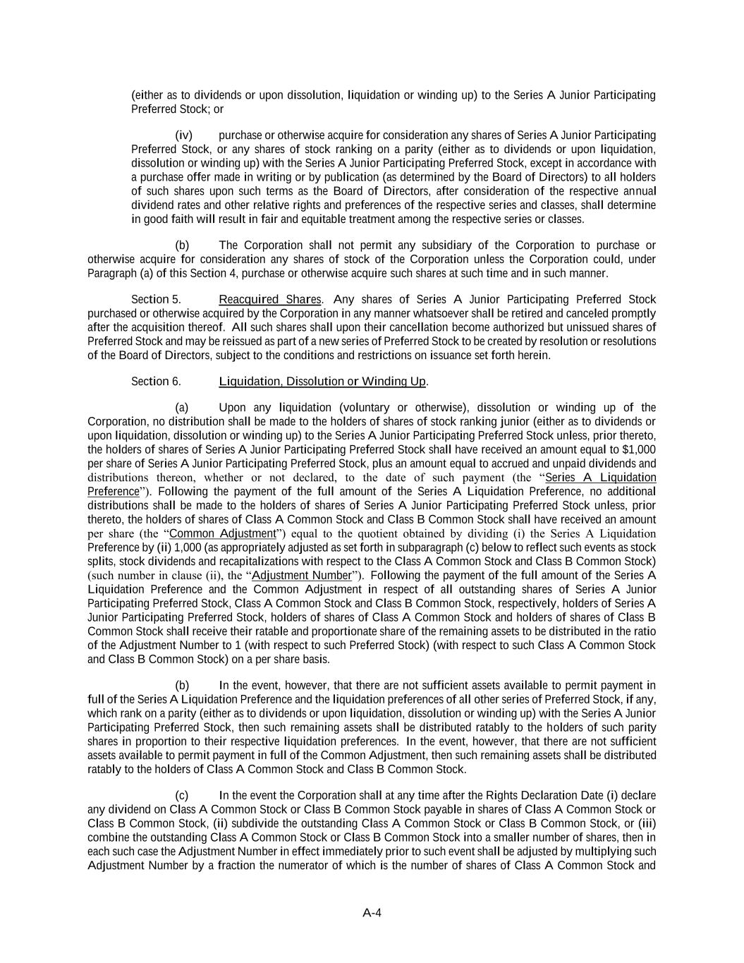A-4 (either as to dividends or upon dissolution, liquidation or winding up) to the Series A Junior Participating Preferred Stock; or (iv) purchase or otherwise acquire for consideration any shares of Series A Junior Participating Preferred Stock, or any shares of stock ranking on a parity (either as to dividends or upon liquidation, dissolution or winding up) with the Series A Junior Participating Preferred Stock, except in accordance with a purchase offer made in writing or by publication (as determined by the Board of Directors) to all holders of such shares upon such terms as the Board of Directors, after consideration of the respective annual dividend rates and other relative rights and preferences of the respective series and classes, shall determine in good faith will result in fair and equitable treatment among the respective series or classes. (b) The Corporation shall not permit any subsidiary of the Corporation to purchase or otherwise acquire for consideration any shares of stock of the Corporation unless the Corporation could, under Paragraph (a) of this Section 4, purchase or otherwise acquire such shares at such time and in such manner. Section 5. Reacquired Shares. Any shares of Series A Junior Participating Preferred Stock purchased or otherwise acquired by the Corporation in any manner whatsoever shall be retired and canceled promptly after the acquisition thereof. All such shares shall upon their cancellation become authorized but unissued shares of Preferred Stock and may be reissued as part of a new series of Preferred Stock to be created by resolution or resolutions of the Board of Directors, subject to the conditions and restrictions on issuance set forth herein. Section 6. Liquidation, Dissolution or Winding Up. (a) Upon any liquidation (voluntary or otherwise), dissolution or winding up of the Corporation, no distribution shall be made to the holders of shares of stock ranking junior (either as to dividends or upon liquidation, dissolution or winding up) to the Series A Junior Participating Preferred Stock unless, prior thereto, the holders of shares of Series A Junior Participating Preferred Stock shall have received an amount equal to $1,000 per share of Series A Junior Participating Preferred Stock, plus an amount equal to accrued and unpaid dividends and distributions thereon, whether or not declared, to the date of such payment (the “Series A Liquidation Preference”). Following the payment of the full amount of the Series A Liquidation Preference, no additional distributions shall be made to the holders of shares of Series A Junior Participating Preferred Stock unless, prior thereto, the holders of shares of Class A Common Stock and Class B Common Stock shall have received an amount per share (the “Common Adjustment”) equal to the quotient obtained by dividing (i) the Series A Liquidation Preference by (ii) 1,000 (as appropriately adjusted as set forth in subparagraph (c) below to reflect such events as stock splits, stock dividends and recapitalizations with respect to the Class A Common Stock and Class B Common Stock) (such number in clause (ii), the “Adjustment Number”). Following the payment of the full amount of the Series A Liquidation Preference and the Common Adjustment in respect of all outstanding shares of Series A Junior Participating Preferred Stock, Class A Common Stock and Class B Common Stock, respectively, holders of Series A Junior Participating Preferred Stock, holders of shares of Class A Common Stock and holders of shares of Class B Common Stock shall receive their ratable and proportionate share of the remaining assets to be distributed in the ratio of the Adjustment Number to 1 (with respect to such Preferred Stock) (with respect to such Class A Common Stock and Class B Common Stock) on a per share basis. (b) In the event, however, that there are not sufficient assets available to permit payment in full of the Series A Liquidation Preference and the liquidation preferences of all other series of Preferred Stock, if any, which rank on a parity (either as to dividends or upon liquidation, dissolution or winding up) with the Series A Junior Participating Preferred Stock, then such remaining assets shall be distributed ratably to the holders of such parity shares in proportion to their respective liquidation preferences. In the event, however, that there are not sufficient assets available to permit payment in full of the Common Adjustment, then such remaining assets shall be distributed ratably to the holders of Class A Common Stock and Class B Common Stock. (c) In the event the Corporation shall at any time after the Rights Declaration Date (i) declare any dividend on Class A Common Stock or Class B Common Stock payable in shares of Class A Common Stock or Class B Common Stock, (ii) subdivide the outstanding Class A Common Stock or Class B Common Stock, or (iii) combine the outstanding Class A Common Stock or Class B Common Stock into a smaller number of shares, then in each such case the Adjustment Number in effect immediately prior to such event shall be adjusted by multiplying such Adjustment Number by a fraction the numerator of which is the number of shares of Class A Common Stock and