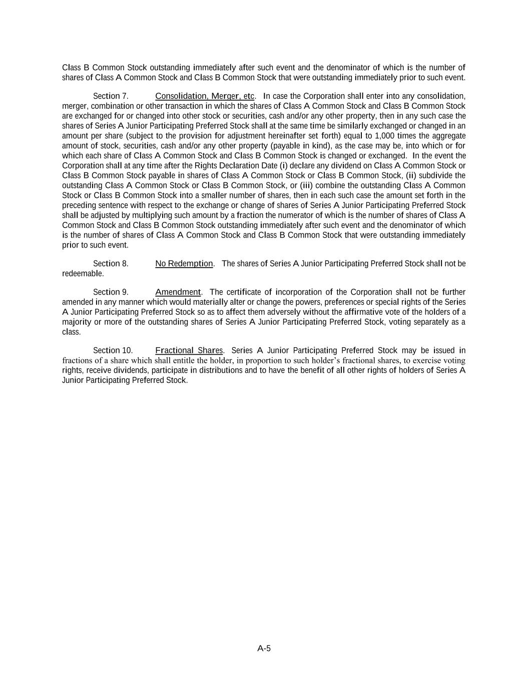A-5 Class B Common Stock outstanding immediately after such event and the denominator of which is the number of shares of Class A Common Stock and Class B Common Stock that were outstanding immediately prior to such event. Section 7. Consolidation, Merger, etc. In case the Corporation shall enter into any consolidation, merger, combination or other transaction in which the shares of Class A Common Stock and Class B Common Stock are exchanged for or changed into other stock or securities, cash and/or any other property, then in any such case the shares of Series A Junior Participating Preferred Stock shall at the same time be similarly exchanged or changed in an amount per share (subject to the provision for adjustment hereinafter set forth) equal to 1,000 times the aggregate amount of stock, securities, cash and/or any other property (payable in kind), as the case may be, into which or for which each share of Class A Common Stock and Class B Common Stock is changed or exchanged. In the event the Corporation shall at any time after the Rights Declaration Date (i) declare any dividend on Class A Common Stock or Class B Common Stock payable in shares of Class A Common Stock or Class B Common Stock, (ii) subdivide the outstanding Class A Common Stock or Class B Common Stock, or (iii) combine the outstanding Class A Common Stock or Class B Common Stock into a smaller number of shares, then in each such case the amount set forth in the preceding sentence with respect to the exchange or change of shares of Series A Junior Participating Preferred Stock shall be adjusted by multiplying such amount by a fraction the numerator of which is the number of shares of Class A Common Stock and Class B Common Stock outstanding immediately after such event and the denominator of which is the number of shares of Class A Common Stock and Class B Common Stock that were outstanding immediately prior to such event. Section 8. No Redemption. The shares of Series A Junior Participating Preferred Stock shall not be redeemable. Section 9. Amendment. The certificate of incorporation of the Corporation shall not be further amended in any manner which would materially alter or change the powers, preferences or special rights of the Series A Junior Participating Preferred Stock so as to affect them adversely without the affirmative vote of the holders of a majority or more of the outstanding shares of Series A Junior Participating Preferred Stock, voting separately as a class. Section 10. Fractional Shares. Series A Junior Participating Preferred Stock may be issued in fractions of a share which shall entitle the holder, in proportion to such holder’s fractional shares, to exercise voting rights, receive dividends, participate in distributions and to have the benefit of all other rights of holders of Series A Junior Participating Preferred Stock.