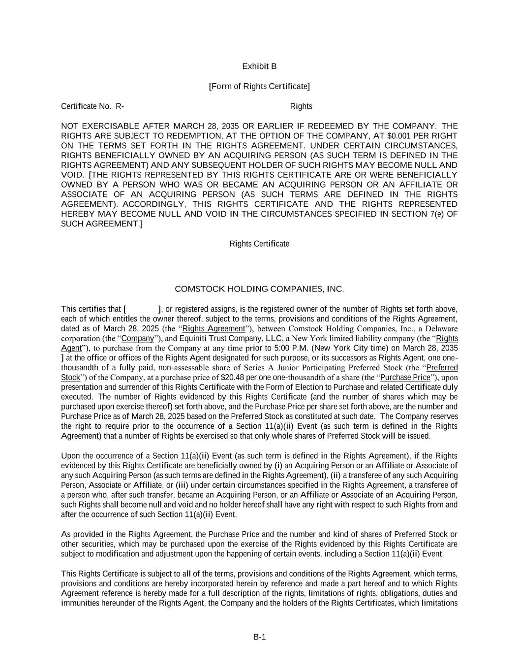 B-1 Exhibit B [Form of Rights Certificate] Certificate No. R- Rights NOT EXERCISABLE AFTER MARCH 28, 2035 OR EARLIER IF REDEEMED BY THE COMPANY. THE RIGHTS ARE SUBJECT TO REDEMPTION, AT THE OPTION OF THE COMPANY, AT $0.001 PER RIGHT ON THE TERMS SET FORTH IN THE RIGHTS AGREEMENT. UNDER CERTAIN CIRCUMSTANCES, RIGHTS BENEFICIALLY OWNED BY AN ACQUIRING PERSON (AS SUCH TERM IS DEFINED IN THE RIGHTS AGREEMENT) AND ANY SUBSEQUENT HOLDER OF SUCH RIGHTS MAY BECOME NULL AND VOID. [THE RIGHTS REPRESENTED BY THIS RIGHTS CERTIFICATE ARE OR WERE BENEFICIALLY OWNED BY A PERSON WHO WAS OR BECAME AN ACQUIRING PERSON OR AN AFFILIATE OR ASSOCIATE OF AN ACQUIRING PERSON (AS SUCH TERMS ARE DEFINED IN THE RIGHTS AGREEMENT). ACCORDINGLY, THIS RIGHTS CERTIFICATE AND THE RIGHTS REPRESENTED HEREBY MAY BECOME NULL AND VOID IN THE CIRCUMSTANCES SPECIFIED IN SECTION 7(e) OF SUCH AGREEMENT.] Rights Certificate COMSTOCK HOLDING COMPANIES, INC. This certifies that [ ], or registered assigns, is the registered owner of the number of Rights set forth above, each of which entitles the owner thereof, subject to the terms, provisions and conditions of the Rights Agreement, dated as of March 28, 2025 (the “Rights Agreement”), between Comstock Holding Companies, Inc., a Delaware corporation (the “Company”), and Equiniti Trust Company, LLC, a New York limited liability company (the “Rights Agent”), to purchase from the Company at any time prior to 5:00 P.M. (New York City time) on March 28, 2035 ] at the office or offices of the Rights Agent designated for such purpose, or its successors as Rights Agent, one one- thousandth of a fully paid, non-assessable share of Series A Junior Participating Preferred Stock (the “Preferred Stock”) of the Company, at a purchase price of $20.48 per one one-thousandth of a share (the “Purchase Price”), upon presentation and surrender of this Rights Certificate with the Form of Election to Purchase and related Certificate duly executed. The number of Rights evidenced by this Rights Certificate (and the number of shares which may be purchased upon exercise thereof) set forth above, and the Purchase Price per share set forth above, are the number and Purchase Price as of March 28, 2025 based on the Preferred Stock as constituted at such date. The Company reserves the right to require prior to the occurrence of a Section 11(a)(ii) Event (as such term is defined in the Rights Agreement) that a number of Rights be exercised so that only whole shares of Preferred Stock will be issued. Upon the occurrence of a Section 11(a)(ii) Event (as such term is defined in the Rights Agreement), if the Rights evidenced by this Rights Certificate are beneficially owned by (i) an Acquiring Person or an Affiliate or Associate of any such Acquiring Person (as such terms are defined in the Rights Agreement), (ii) a transferee of any such Acquiring Person, Associate or Affiliate, or (iii) under certain circumstances specified in the Rights Agreement, a transferee of a person who, after such transfer, became an Acquiring Person, or an Affiliate or Associate of an Acquiring Person, such Rights shall become null and void and no holder hereof shall have any right with respect to such Rights from and after the occurrence of such Section 11(a)(ii) Event. As provided in the Rights Agreement, the Purchase Price and the number and kind of shares of Preferred Stock or other securities, which may be purchased upon the exercise of the Rights evidenced by this Rights Certificate are subject to modification and adjustment upon the happening of certain events, including a Section 11(a)(ii) Event. This Rights Certificate is subject to all of the terms, provisions and conditions of the Rights Agreement, which terms, provisions and conditions are hereby incorporated herein by reference and made a part hereof and to which Rights Agreement reference is hereby made for a full description of the rights, limitations of rights, obligations, duties and immunities hereunder of the Rights Agent, the Company and the holders of the Rights Certificates, which limitations