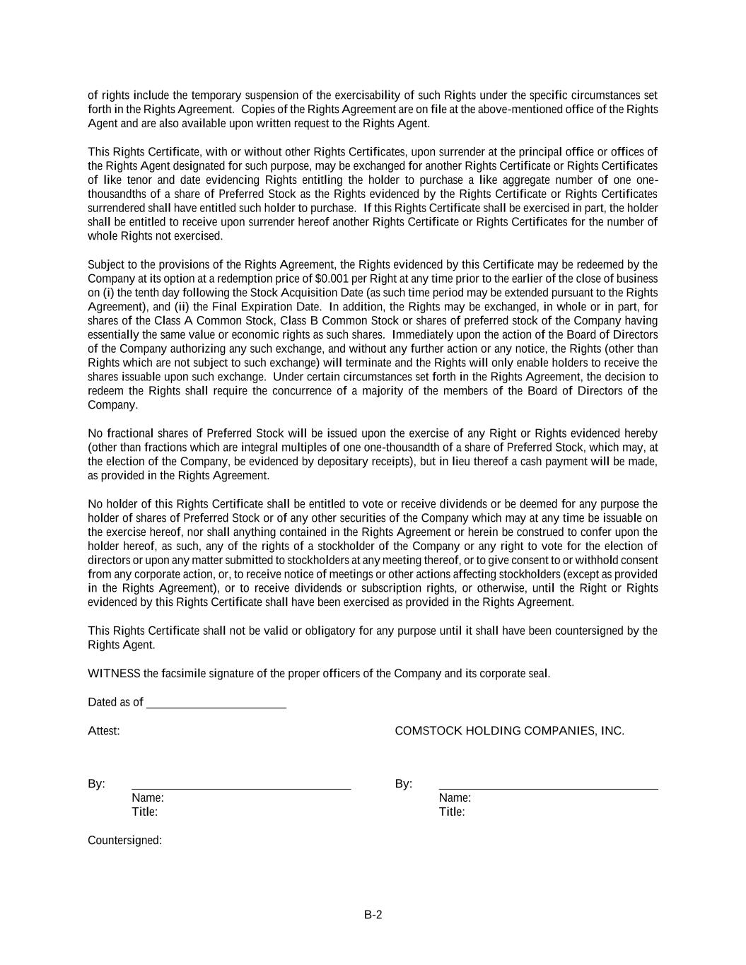 B-2 of rights include the temporary suspension of the exercisability of such Rights under the specific circumstances set forth in the Rights Agreement. Copies of the Rights Agreement are on file at the above-mentioned office of the Rights Agent and are also available upon written request to the Rights Agent. This Rights Certificate, with or without other Rights Certificates, upon surrender at the principal office or offices of the Rights Agent designated for such purpose, may be exchanged for another Rights Certificate or Rights Certificates of like tenor and date evidencing Rights entitling the holder to purchase a like aggregate number of one one- thousandths of a share of Preferred Stock as the Rights evidenced by the Rights Certificate or Rights Certificates surrendered shall have entitled such holder to purchase. If this Rights Certificate shall be exercised in part, the holder shall be entitled to receive upon surrender hereof another Rights Certificate or Rights Certificates for the number of whole Rights not exercised. Subject to the provisions of the Rights Agreement, the Rights evidenced by this Certificate may be redeemed by the Company at its option at a redemption price of $0.001 per Right at any time prior to the earlier of the close of business on (i) the tenth day following the Stock Acquisition Date (as such time period may be extended pursuant to the Rights Agreement), and (ii) the Final Expiration Date. In addition, the Rights may be exchanged, in whole or in part, for shares of the Class A Common Stock, Class B Common Stock or shares of preferred stock of the Company having essentially the same value or economic rights as such shares. Immediately upon the action of the Board of Directors of the Company authorizing any such exchange, and without any further action or any notice, the Rights (other than Rights which are not subject to such exchange) will terminate and the Rights will only enable holders to receive the shares issuable upon such exchange. Under certain circumstances set forth in the Rights Agreement, the decision to redeem the Rights shall require the concurrence of a majority of the members of the Board of Directors of the Company. No fractional shares of Preferred Stock will be issued upon the exercise of any Right or Rights evidenced hereby (other than fractions which are integral multiples of one one-thousandth of a share of Preferred Stock, which may, at the election of the Company, be evidenced by depositary receipts), but in lieu thereof a cash payment will be made, as provided in the Rights Agreement. No holder of this Rights Certificate shall be entitled to vote or receive dividends or be deemed for any purpose the holder of shares of Preferred Stock or of any other securities of the Company which may at any time be issuable on the exercise hereof, nor shall anything contained in the Rights Agreement or herein be construed to confer upon the holder hereof, as such, any of the rights of a stockholder of the Company or any right to vote for the election of directors or upon any matter submitted to stockholders at any meeting thereof, or to give consent to or withhold consent from any corporate action, or, to receive notice of meetings or other actions affecting stockholders (except as provided in the Rights Agreement), or to receive dividends or subscription rights, or otherwise, until the Right or Rights evidenced by this Rights Certificate shall have been exercised as provided in the Rights Agreement. This Rights Certificate shall not be valid or obligatory for any purpose until it shall have been countersigned by the Rights Agent. WITNESS the facsimile signature of the proper officers of the Company and its corporate seal. Dated as of _______________________ Attest: COMSTOCK HOLDING COMPANIES, INC. By: By: Name: Name: Title: Title: Countersigned: