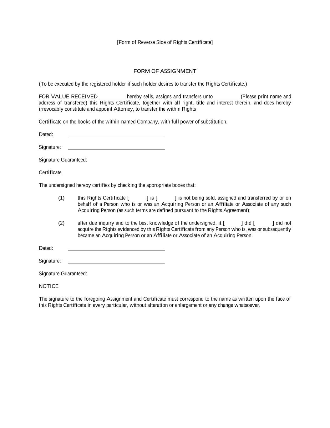 [Form of Reverse Side of Rights Certificate] FORM OF ASSIGNMENT (To be executed by the registered holder if such holder desires to transfer the Rights Certificate.) FOR VALUE RECEIVED hereby sells, assigns and transfers unto (Please print name and address of transferee) this Rights Certificate, together with all right, title and interest therein, and does hereby irrevocably constitute and appoint Attorney, to transfer the within Rights Certificate on the books of the within-named Company, with full power of substitution. Dated: Signature: Signature Guaranteed: Certificate The undersigned hereby certifies by checking the appropriate boxes that: (1) this Rights Certificate [ ] is [ ] is not being sold, assigned and transferred by or on behalf of a Person who is or was an Acquiring Person or an Affiliate or Associate of any such Acquiring Person (as such terms are defined pursuant to the Rights Agreement); (2) after due inquiry and to the best knowledge of the undersigned, it [ ] did [ ] did not acquire the Rights evidenced by this Rights Certificate from any Person who is, was or subsequently became an Acquiring Person or an Affiliate or Associate of an Acquiring Person. Dated: Signature: Signature Guaranteed: NOTICE The signature to the foregoing Assignment and Certificate must correspond to the name as written upon the face of this Rights Certificate in every particular, without alteration or enlargement or any change whatsoever.