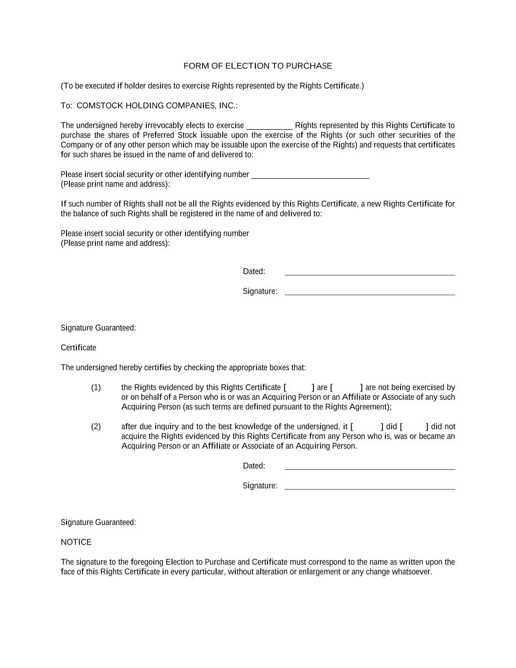FORM OF ELECTION TO PURCHASE (To be executed if holder desires to exercise Rights represented by the Rights Certificate.) To: COMSTOCK HOLDING COMPANIES, INC.: The undersigned hereby irrevocably elects to exercise ___________ Rights represented by this Rights Certificate to purchase the shares of Preferred Stock issuable upon the exercise of the Rights (or such other securities of the Company or of any other person which may be issuable upon the exercise of the Rights) and requests that certificates for such shares be issued in the name of and delivered to: Please insert social security or other identifying number ____________________________ (Please print name and address): If such number of Rights shall not be all the Rights evidenced by this Rights Certificate, a new Rights Certificate for the balance of such Rights shall be registered in the name of and delivered to: Please insert social security or other identifying number (Please print name and address): Dated: Signature: Signature Guaranteed: Certificate The undersigned hereby certifies by checking the appropriate boxes that: (1) the Rights evidenced by this Rights Certificate [ ] are [ ] are not being exercised by or on behalf of a Person who is or was an Acquiring Person or an Affiliate or Associate of any such Acquiring Person (as such terms are defined pursuant to the Rights Agreement); (2) after due inquiry and to the best knowledge of the undersigned, it [ ] did [ ] did not acquire the Rights evidenced by this Rights Certificate from any Person who is, was or became an Acquiring Person or an Affiliate or Associate of an Acquiring Person. Dated: Signature: Signature Guaranteed: NOTICE The signature to the foregoing Election to Purchase and Certificate must correspond to the name as written upon the face of this Rights Certificate in every particular, without alteration or enlargement or any change whatsoever.