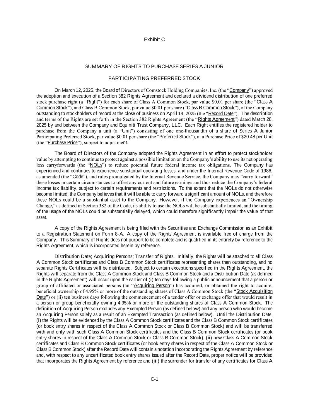 C-1 Exhibit C SUMMARY OF RIGHTS TO PURCHASE SERIES A JUNIOR PARTICIPATING PREFERRED STOCK On March 12, 2025, the Board of Directors of Comstock Holding Companies, Inc. (the “Company”) approved the adoption and execution of a Section 382 Rights Agreement and declared a dividend distribution of one preferred stock purchase right (a “Right”) for each share of Class A Common Stock, par value $0.01 per share (the “Class A Common Stock”), and Class B Common Stock, par value $0.01 per share (“Class B Common Stock”), of the Company outstanding to stockholders of record at the close of business on April 14, 2025 (the “Record Date”). The description and terms of the Rights are set forth in the Section 382 Rights Agreement (the “Rights Agreement”) dated March 28, 2025 by and between the Company and Equiniti Trust Company, LLC. Each Right entitles the registered holder to purchase from the Company a unit (a “Unit”) consisting of one one-thousandth of a share of Series A Junior Participating Preferred Stock, par value $0.01 per share (the “Preferred Stock”), at a Purchase Price of $20.48 per Unit (the “Purchase Price”), subject to adjustment. The Board of Directors of the Company adopted the Rights Agreement in an effort to protect stockholder value by attempting to continue to protect against a possible limitation on the Company’s ability to use its net operating loss carryforwards (the “NOLs”) to reduce potential future federal income tax obligations. The Company has experienced and continues to experience substantial operating losses, and under the Internal Revenue Code of 1986, as amended (the “Code”), and rules promulgated by the Internal Revenue Service, the Company may “carry forward” these losses in certain circumstances to offset any current and future earnings and thus reduce the Company’s federal income tax liability, subject to certain requirements and restrictions. To the extent that the NOLs do not otherwise become limited, the Company believes that it will be able to carry forward a significant amount of NOLs, and therefore these NOLs could be a substantial asset to the Company. However, if the Company experiences an “Ownership Change,” as defined in Section 382 of the Code, its ability to use the NOLs will be substantially limited, and the timing of the usage of the NOLs could be substantially delayed, which could therefore significantly impair the value of that asset. A copy of the Rights Agreement is being filed with the Securities and Exchange Commission as an Exhibit to a Registration Statement on Form 8-A. A copy of the Rights Agreement is available free of charge from the Company. This Summary of Rights does not purport to be complete and is qualified in its entirety by reference to the Rights Agreement, which is incorporated herein by reference. Distribution Date; Acquiring Persons; Transfer of Rights. Initially, the Rights will be attached to all Class A Common Stock certificates and Class B Common Stock certificates representing shares then outstanding, and no separate Rights Certificates will be distributed. Subject to certain exceptions specified in the Rights Agreement, the Rights will separate from the Class A Common Stock and Class B Common Stock and a Distribution Date (as defined in the Rights Agreement) will occur upon the earlier of (i) ten days following a public announcement that a person or group of affiliated or associated persons (an “Acquiring Person”) has acquired, or obtained the right to acquire, beneficial ownership of 4.95% or more of the outstanding shares of Class A Common Stock (the “Stock Acquisition Date”) or (ii) ten business days following the commencement of a tender offer or exchange offer that would result in a person or group beneficially owning 4.95% or more of the outstanding shares of Class A Common Stock. The definition of Acquiring Person excludes any Exempted Person (as defined below) and any person who would become an Acquiring Person solely as a result of an Exempted Transaction (as defined below). Until the Distribution Date, (i) the Rights will be evidenced by the Class A Common Stock certificates and the Class B Common Stock certificates (or book entry shares in respect of the Class A Common Stock or Class B Common Stock) and will be transferred with and only with such Class A Common Stock certificates and the Class B Common Stock certificates (or book entry shares in respect of the Class A Common Stock or Class B Common Stock), (ii) new Class A Common Stock certificates and Class B Common Stock certificates (or book entry shares in respect of the Class A Common Stock or Class B Common Stock) after the Record Date will contain a notation incorporating the Rights Agreement by reference and, with respect to any uncertificated book entry shares issued after the Record Date, proper notice will be provided that incorporates the Rights Agreement by reference and (iii) the surrender for transfer of any certificates for Class A