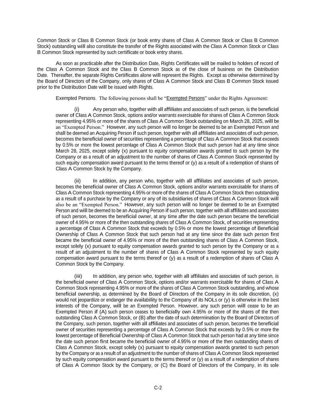C-2 Common Stock or Class B Common Stock (or book entry shares of Class A Common Stock or Class B Common Stock) outstanding will also constitute the transfer of the Rights associated with the Class A Common Stock or Class B Common Stock represented by such certificate or book entry shares. As soon as practicable after the Distribution Date, Rights Certificates will be mailed to holders of record of the Class A Common Stock and the Class B Common Stock as of the close of business on the Distribution Date. Thereafter, the separate Rights Certificates alone will represent the Rights. Except as otherwise determined by the Board of Directors of the Company, only shares of Class A Common Stock and Class B Common Stock issued prior to the Distribution Date will be issued with Rights. Exempted Persons. The following persons shall be “Exempted Persons” under the Rights Agreement: (i) Any person who, together with all affiliates and associates of such person, is the beneficial owner of Class A Common Stock, options and/or warrants exercisable for shares of Class A Common Stock representing 4.95% or more of the shares of Class A Common Stock outstanding on March 28, 2025, will be an “Exempted Person.” However, any such person will no longer be deemed to be an Exempted Person and shall be deemed an Acquiring Person if such person, together with all affiliates and associates of such person, becomes the beneficial owner of securities representing a percentage of Class A Common Stock that exceeds by 0.5% or more the lowest percentage of Class A Common Stock that such person had at any time since March 28, 2025, except solely (x) pursuant to equity compensation awards granted to such person by the Company or as a result of an adjustment to the number of shares of Class A Common Stock represented by such equity compensation award pursuant to the terms thereof or (y) as a result of a redemption of shares of Class A Common Stock by the Company. (ii) In addition, any person who, together with all affiliates and associates of such person, becomes the beneficial owner of Class A Common Stock, options and/or warrants exercisable for shares of Class A Common Stock representing 4.95% or more of the shares of Class A Common Stock then outstanding as a result of a purchase by the Company or any of its subsidiaries of shares of Class A Common Stock will also be an “Exempted Person.” However, any such person will no longer be deemed to be an Exempted Person and will be deemed to be an Acquiring Person if such person, together with all affiliates and associates of such person, becomes the beneficial owner, at any time after the date such person became the beneficial owner of 4.95% or more of the then outstanding shares of Class A Common Stock, of securities representing a percentage of Class A Common Stock that exceeds by 0.5% or more the lowest percentage of Beneficial Ownership of Class A Common Stock that such person had at any time since the date such person first became the beneficial owner of 4.95% or more of the then outstanding shares of Class A Common Stock, except solely (x) pursuant to equity compensation awards granted to such person by the Company or as a result of an adjustment to the number of shares of Class A Common Stock represented by such equity compensation award pursuant to the terms thereof or (y) as a result of a redemption of shares of Class A Common Stock by the Company. (iii) In addition, any person who, together with all affiliates and associates of such person, is the beneficial owner of Class A Common Stock, options and/or warrants exercisable for shares of Class A Common Stock representing 4.95% or more of the shares of Class A Common Stock outstanding, and whose beneficial ownership, as determined by the Board of Directors of the Company in its sole discretion, (x) would not jeopardize or endanger the availability to the Company of its NOLs or (y) is otherwise in the best interests of the Company, will be an Exempted Person. However, any such person will cease to be an Exempted Person if (A) such person ceases to beneficially own 4.95% or more of the shares of the then outstanding Class A Common Stock, or (B) after the date of such determination by the Board of Directors of the Company, such person, together with all affiliates and associates of such person, becomes the beneficial owner of securities representing a percentage of Class A Common Stock that exceeds by 0.5% or more the lowest percentage of Beneficial Ownership of Class A Common Stock that such person had at any time since the date such person first became the beneficial owner of 4.95% or more of the then outstanding shares of Class A Common Stock, except solely (x) pursuant to equity compensation awards granted to such person by the Company or as a result of an adjustment to the number of shares of Class A Common Stock represented by such equity compensation award pursuant to the terms thereof or (y) as a result of a redemption of shares of Class A Common Stock by the Company, or (C) the Board of Directors of the Company, in its sole