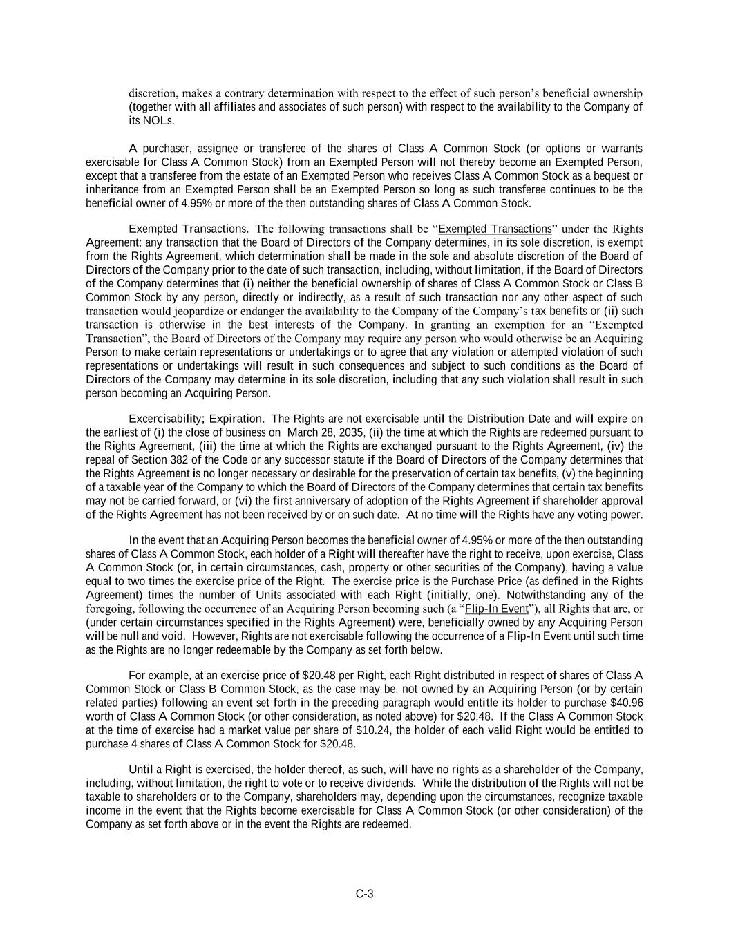 C-3 discretion, makes a contrary determination with respect to the effect of such person’s beneficial ownership (together with all affiliates and associates of such person) with respect to the availability to the Company of its NOLs. A purchaser, assignee or transferee of the shares of Class A Common Stock (or options or warrants exercisable for Class A Common Stock) from an Exempted Person will not thereby become an Exempted Person, except that a transferee from the estate of an Exempted Person who receives Class A Common Stock as a bequest or inheritance from an Exempted Person shall be an Exempted Person so long as such transferee continues to be the beneficial owner of 4.95% or more of the then outstanding shares of Class A Common Stock. Exempted Transactions. The following transactions shall be “Exempted Transactions” under the Rights Agreement: any transaction that the Board of Directors of the Company determines, in its sole discretion, is exempt from the Rights Agreement, which determination shall be made in the sole and absolute discretion of the Board of Directors of the Company prior to the date of such transaction, including, without limitation, if the Board of Directors of the Company determines that (i) neither the beneficial ownership of shares of Class A Common Stock or Class B Common Stock by any person, directly or indirectly, as a result of such transaction nor any other aspect of such transaction would jeopardize or endanger the availability to the Company of the Company’s tax benefits or (ii) such transaction is otherwise in the best interests of the Company. In granting an exemption for an “Exempted Transaction”, the Board of Directors of the Company may require any person who would otherwise be an Acquiring Person to make certain representations or undertakings or to agree that any violation or attempted violation of such representations or undertakings will result in such consequences and subject to such conditions as the Board of Directors of the Company may determine in its sole discretion, including that any such violation shall result in such person becoming an Acquiring Person. Excercisability; Expiration. The Rights are not exercisable until the Distribution Date and will expire on the earliest of (i) the close of business on March 28, 2035, (ii) the time at which the Rights are redeemed pursuant to the Rights Agreement, (iii) the time at which the Rights are exchanged pursuant to the Rights Agreement, (iv) the repeal of Section 382 of the Code or any successor statute if the Board of Directors of the Company determines that the Rights Agreement is no longer necessary or desirable for the preservation of certain tax benefits, (v) the beginning of a taxable year of the Company to which the Board of Directors of the Company determines that certain tax benefits may not be carried forward, or (vi) the first anniversary of adoption of the Rights Agreement if shareholder approval of the Rights Agreement has not been received by or on such date. At no time will the Rights have any voting power. In the event that an Acquiring Person becomes the beneficial owner of 4.95% or more of the then outstanding shares of Class A Common Stock, each holder of a Right will thereafter have the right to receive, upon exercise, Class A Common Stock (or, in certain circumstances, cash, property or other securities of the Company), having a value equal to two times the exercise price of the Right. The exercise price is the Purchase Price (as defined in the Rights Agreement) times the number of Units associated with each Right (initially, one). Notwithstanding any of the foregoing, following the occurrence of an Acquiring Person becoming such (a “Flip-In Event”), all Rights that are, or (under certain circumstances specified in the Rights Agreement) were, beneficially owned by any Acquiring Person will be null and void. However, Rights are not exercisable following the occurrence of a Flip-In Event until such time as the Rights are no longer redeemable by the Company as set forth below. For example, at an exercise price of $20.48 per Right, each Right distributed in respect of shares of Class A Common Stock or Class B Common Stock, as the case may be, not owned by an Acquiring Person (or by certain related parties) following an event set forth in the preceding paragraph would entitle its holder to purchase $40.96 worth of Class A Common Stock (or other consideration, as noted above) for $20.48. If the Class A Common Stock at the time of exercise had a market value per share of $10.24, the holder of each valid Right would be entitled to purchase 4 shares of Class A Common Stock for $20.48. Until a Right is exercised, the holder thereof, as such, will have no rights as a shareholder of the Company, including, without limitation, the right to vote or to receive dividends. While the distribution of the Rights will not be taxable to shareholders or to the Company, shareholders may, depending upon the circumstances, recognize taxable income in the event that the Rights become exercisable for Class A Common Stock (or other consideration) of the Company as set forth above or in the event the Rights are redeemed.